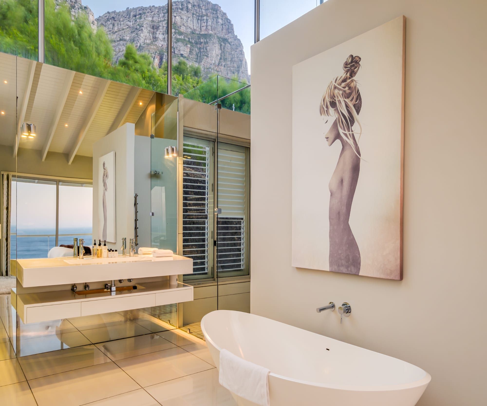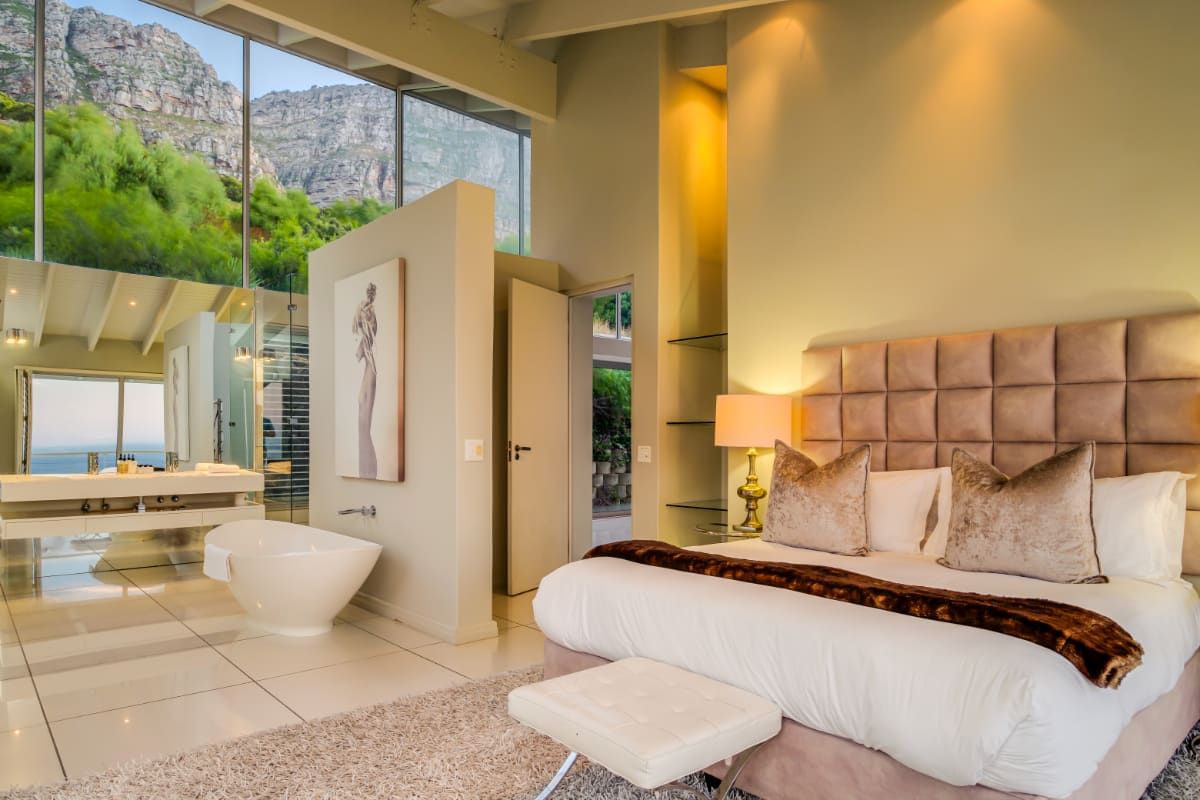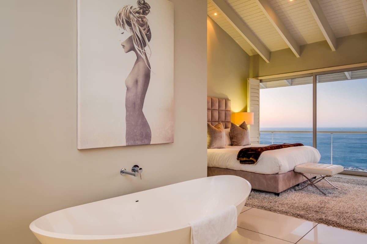 It’s hard to overstate how jaw dropping this house is. With wraparound glass walls, it is an architectural marvel and a true ode to the exquisite landscape of Camps Bay. Sandwiched by the Twelve Apostle mountains and the glittering Atlantic Ocean, you are treated to unparalleled views here – it’s not every day that you can look out to sea or up to the mountains from your bubble bath.