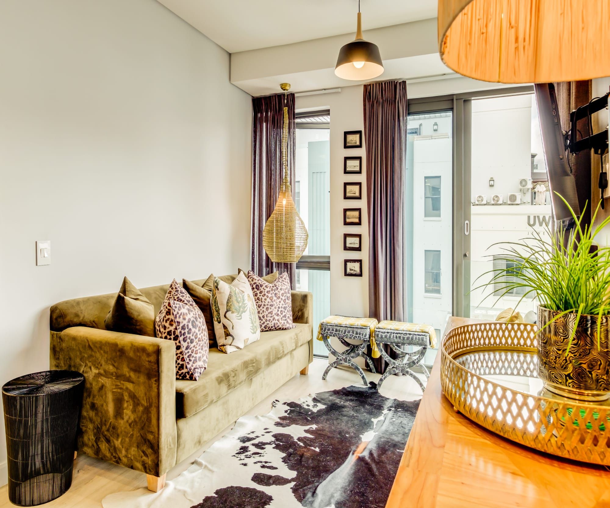 Tastefully decorated, this eclectic space echoes its vibrant surroundings. Gather together at the dining table to chat about your adventures in Cape Town, all while nibbling on vetkoek and sipping Nespresso coffee. There are even extra services available, so you can pamper yourself by hiring a private chef or booking a massage to make your holiday memorable. We especially love how the large windows let the natural light pour inside, giving you a great view of sunsets over the modern cityscape.