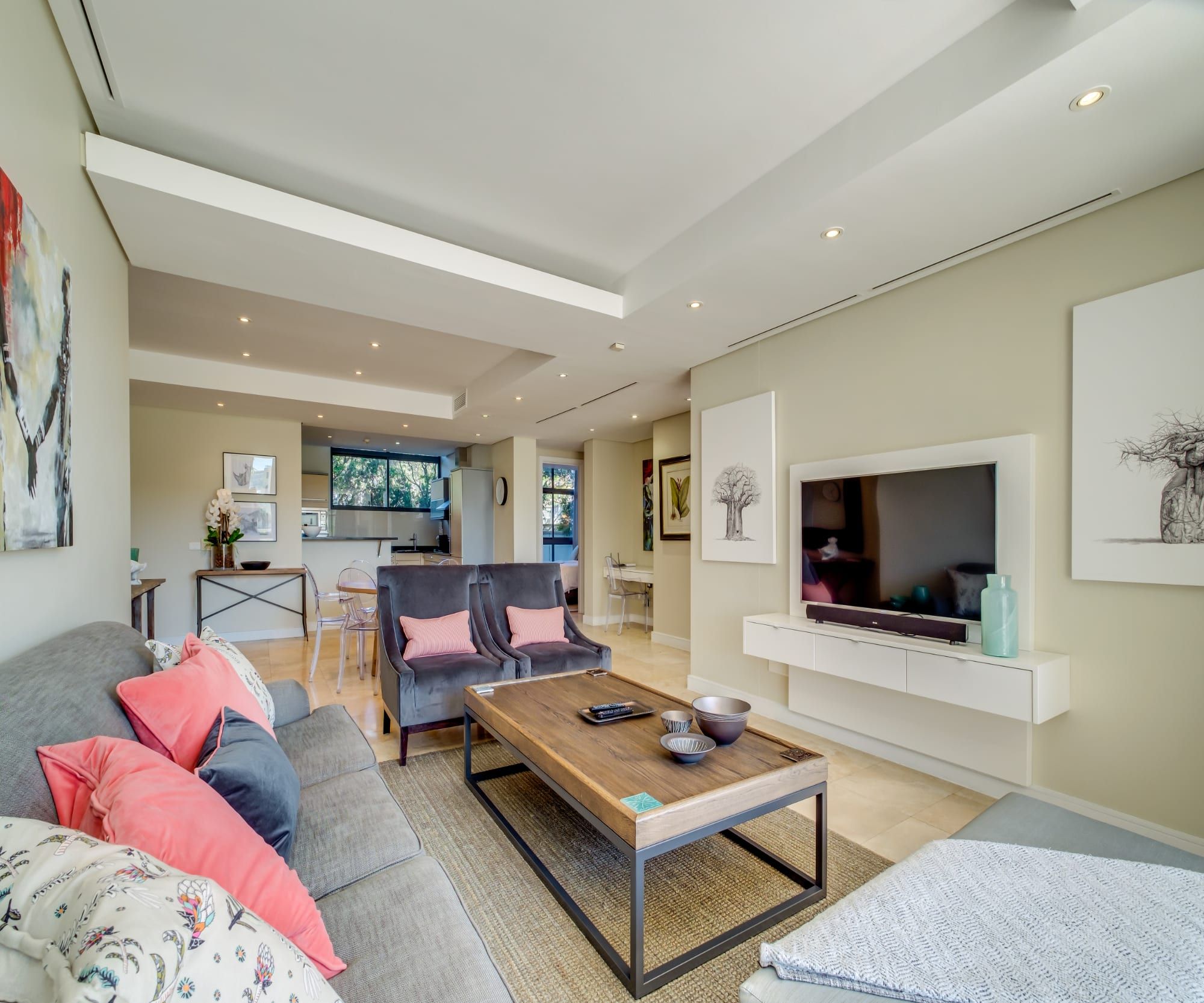 Life in Cape Town’s V&A Waterfront neighbourhood might appear to be all about yachts and watersports, but what about those of us in town on a more cultural trip? This shiny new apartment sits right on the gleaming waters of the marina, but it’s less than a ten-minute walk from the Zeitz Museum of Contemporary Art, the Goodman Gallery, and just over a kilometre from the 18th-century Iziko Bo-Kaap Museum. With so many visual delights around you, it’s only fitting that your home echoes the vibe.