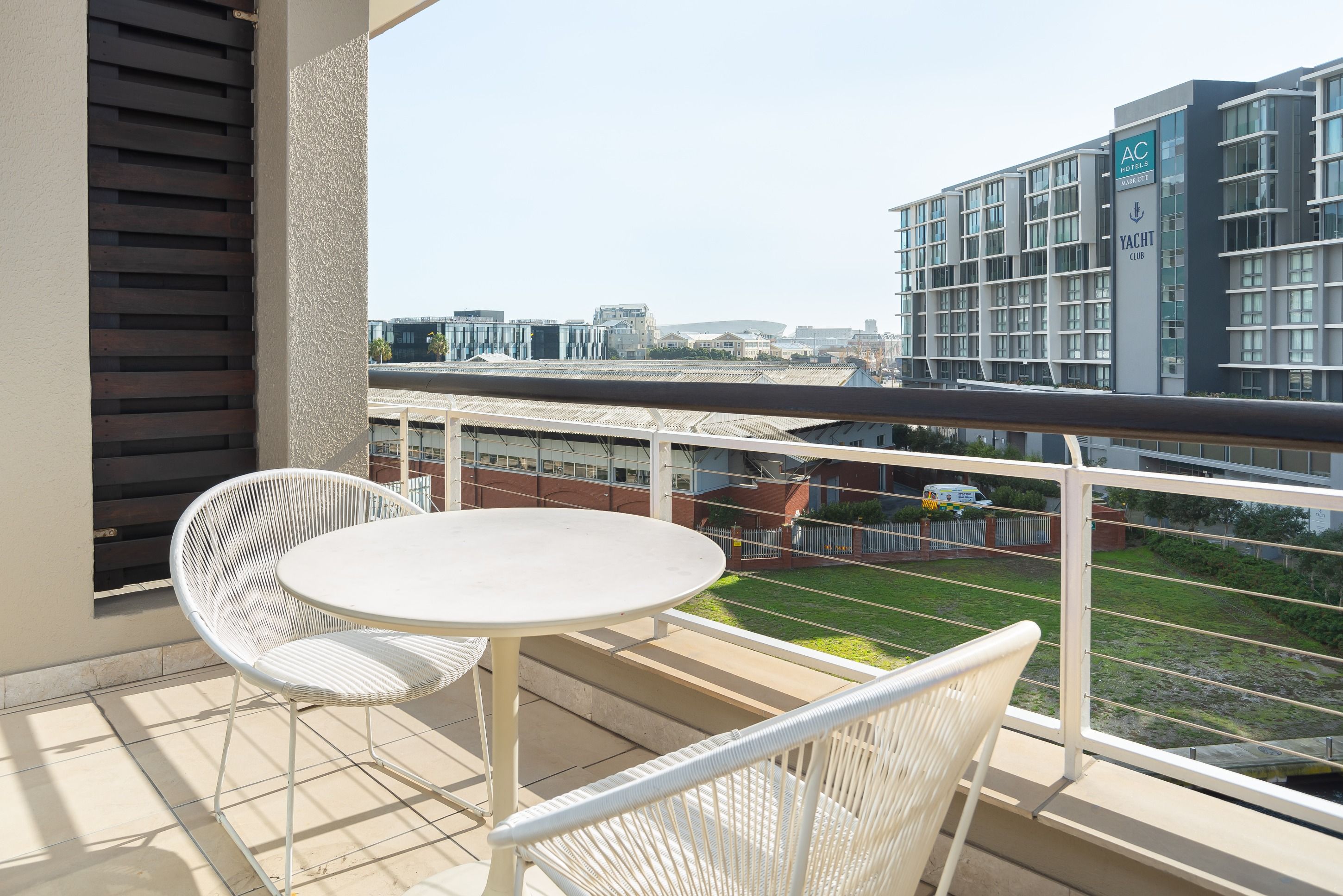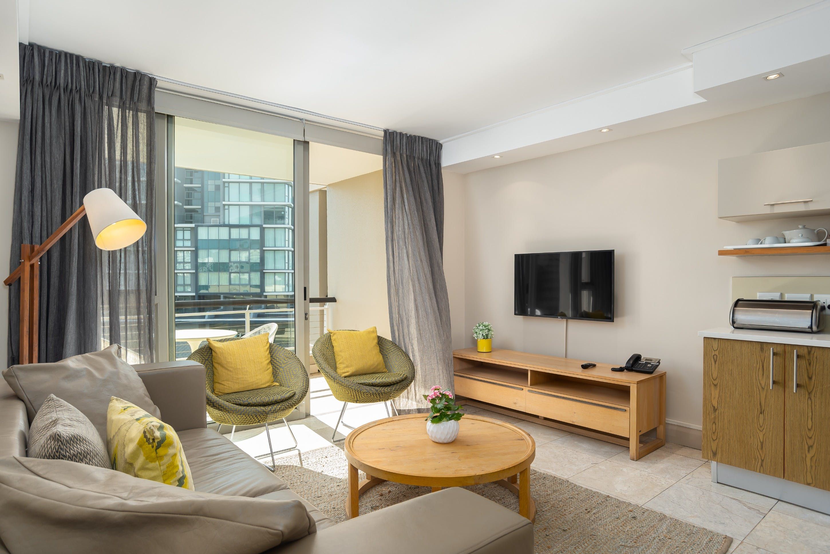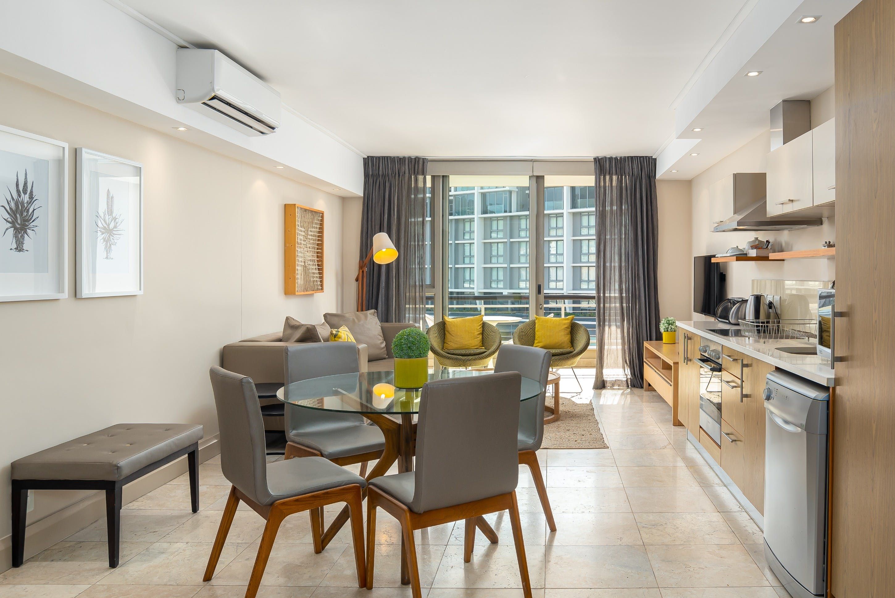 This sleek and sun-filled apartment overlooks the canal on the harbourfront of Cape Town. With an open-plan living, dining and kitchen area and a separate bedroom and bathroom area, you'll be able to enjoy a stay in this studio without having to forfeit total privacy. Keep the curtains open during the day to fill your space with natural light, and head out on the balcony to breathe in the fresh air and relax while gazing out at the canal and the surrounding city. In the evening when you come back to rest your head, snuggle up on the sofa with a movie on the big screen as the sun sets outside.