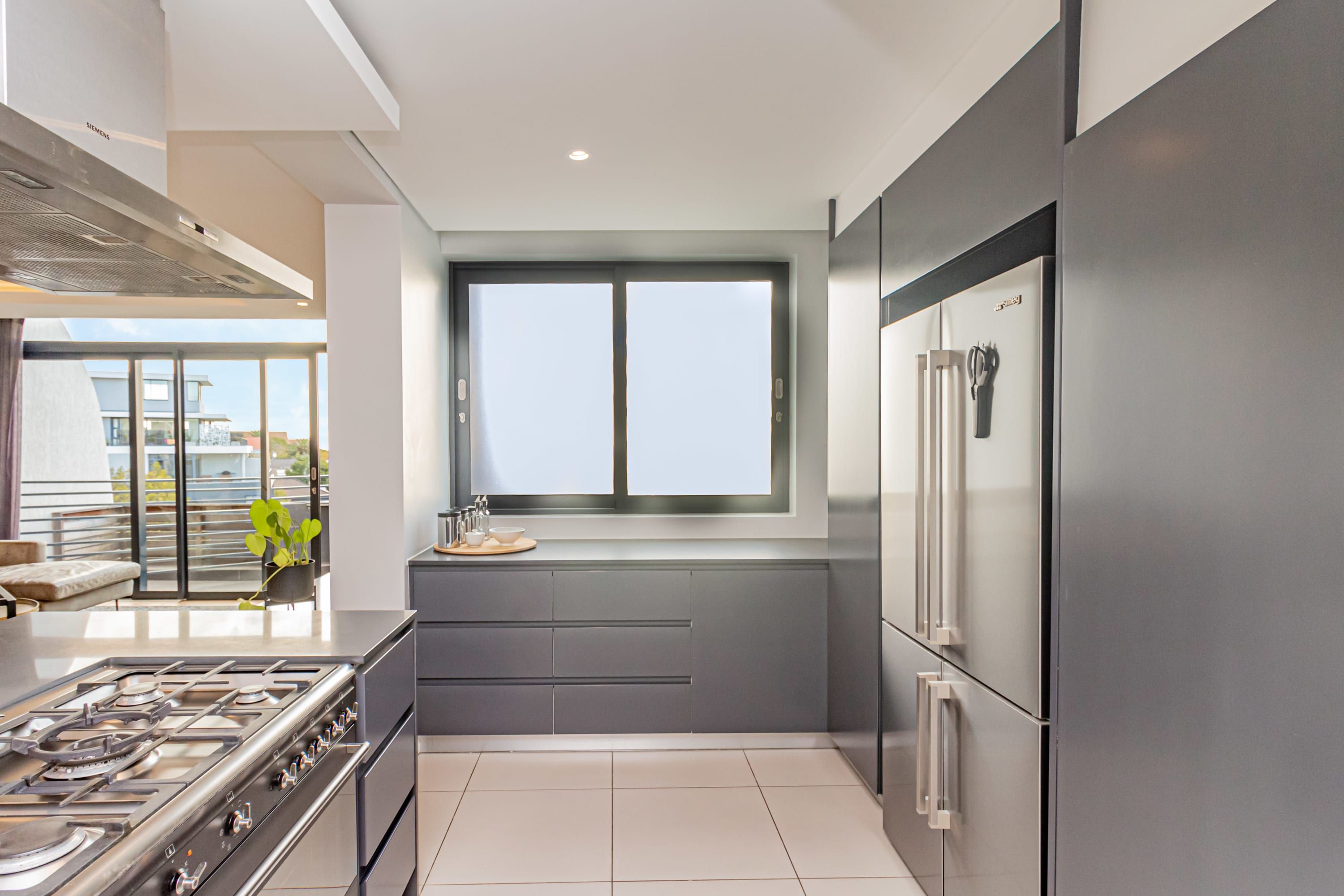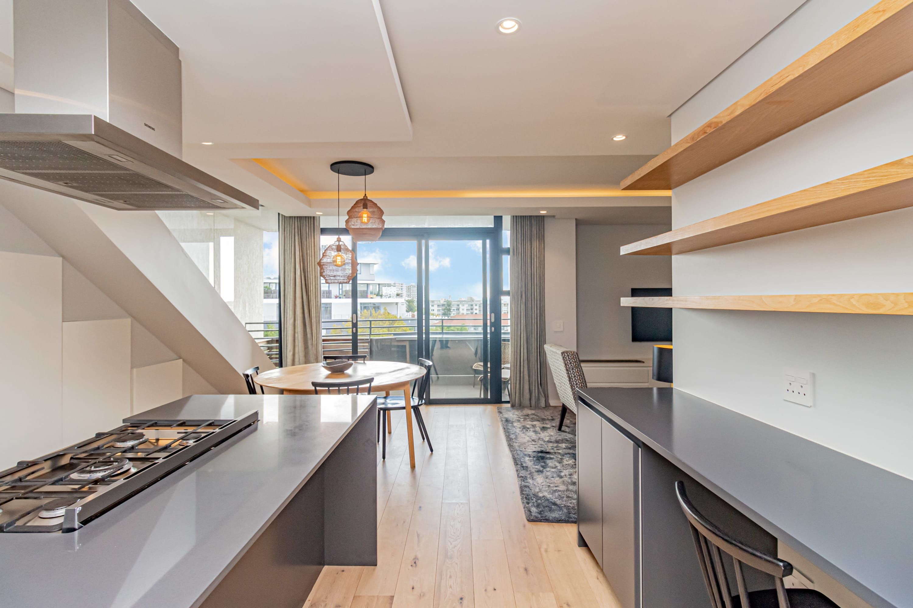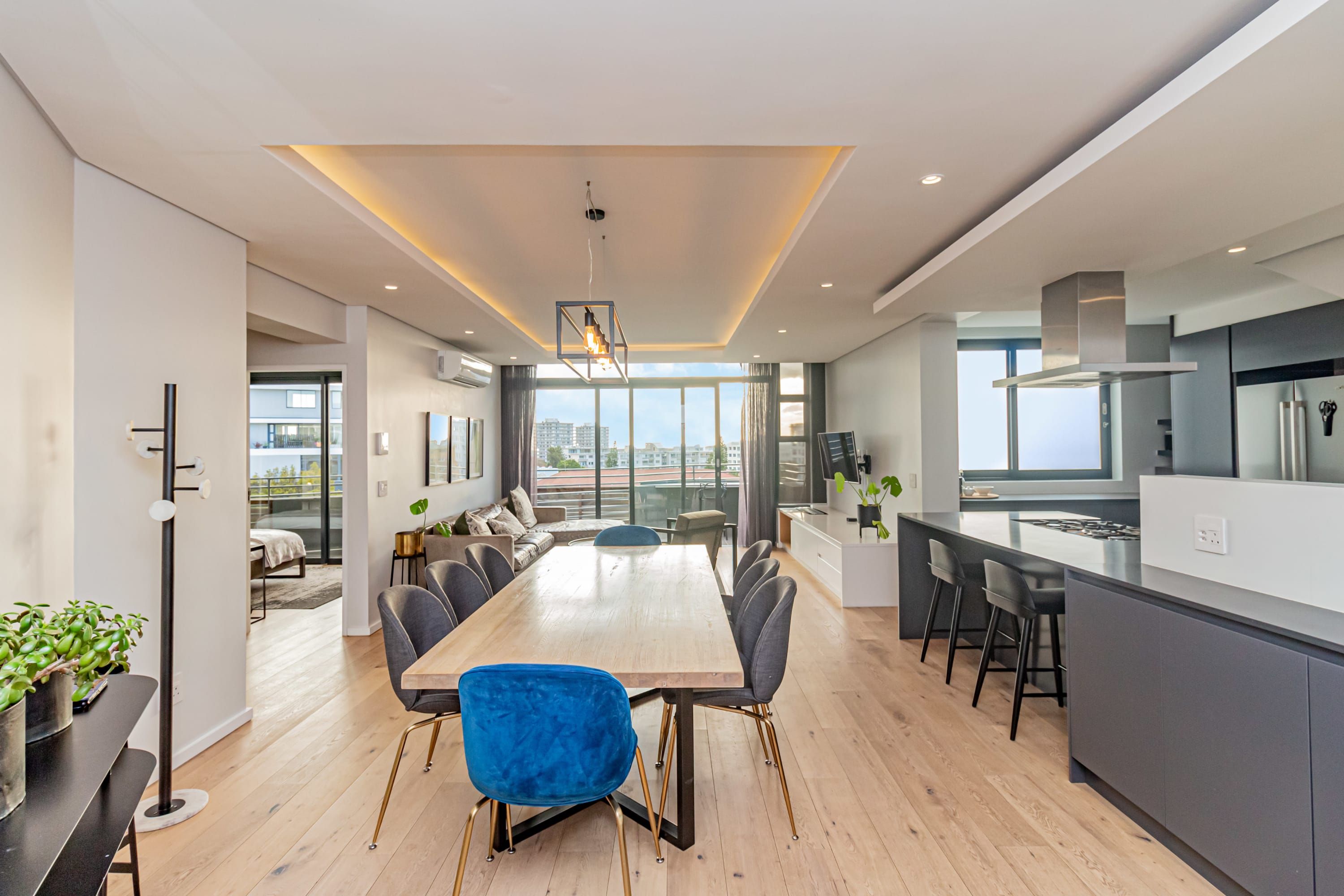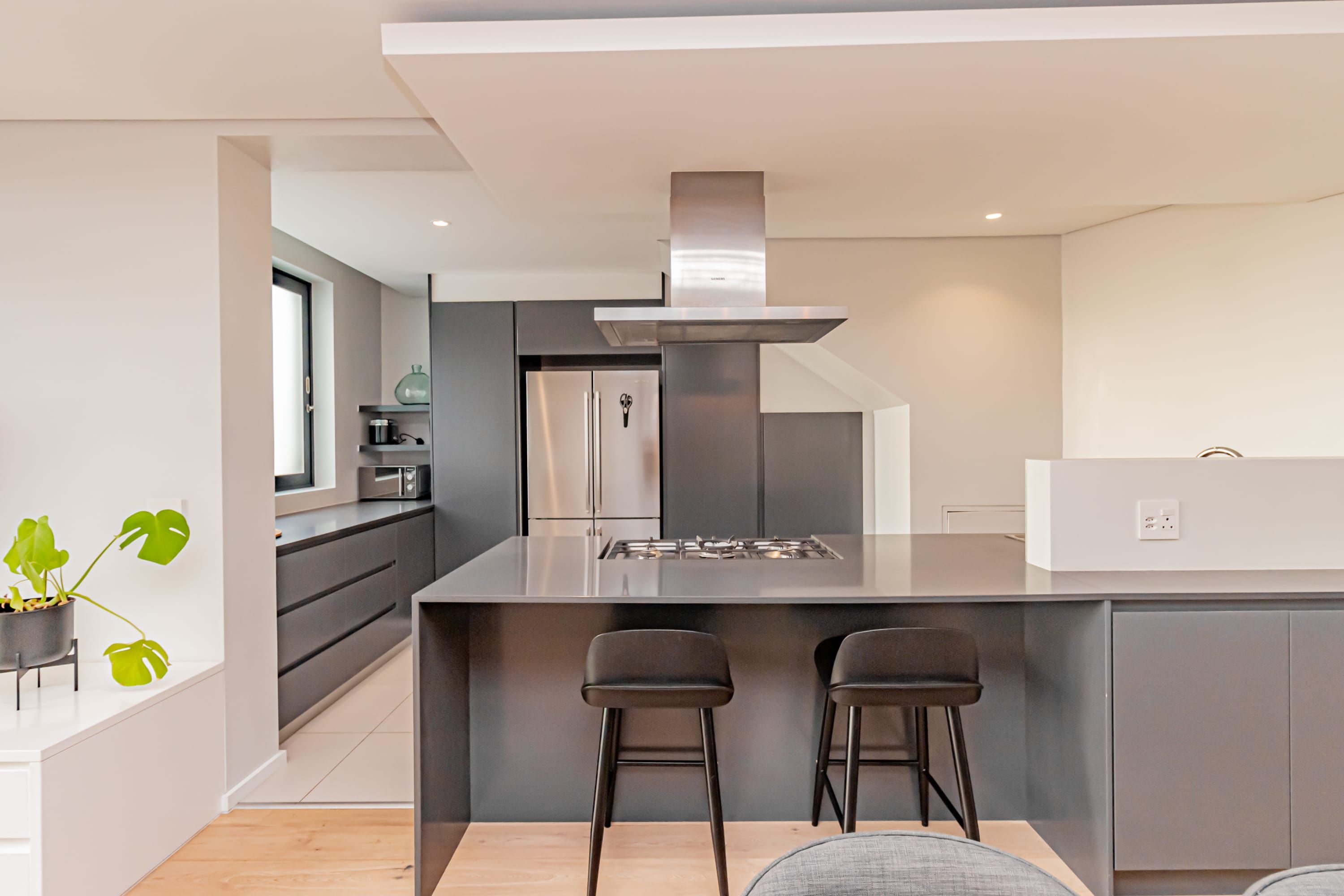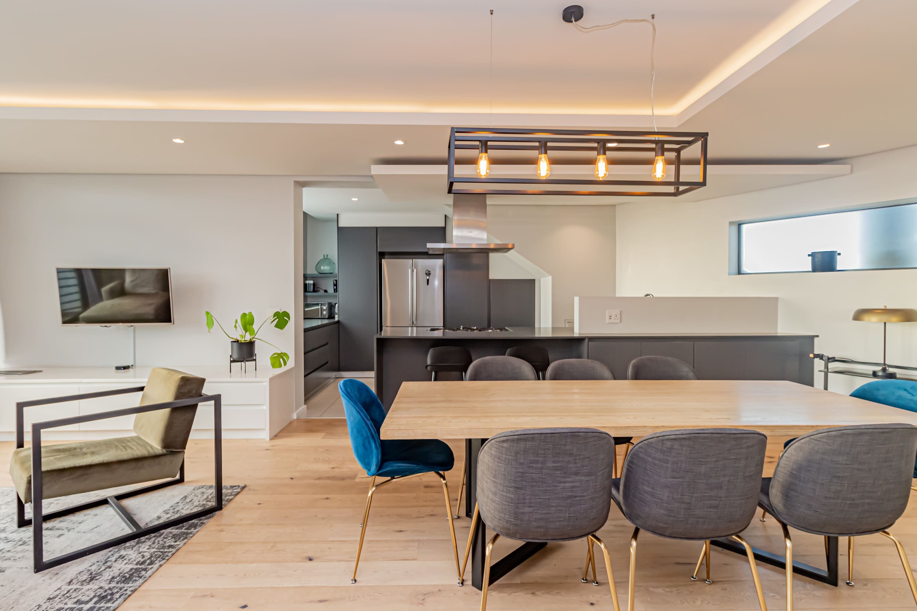 When it comes time to dine, whip up a South African-inspired meal in the sleek kitchen. Serve up your creations – potjiekos, perhaps? – at the six-person dining table with sunlight flooding in through the floor-to-ceiling windows. This new-build home has the feel of an executive suite, with trendy black accents and plush velvet seating.