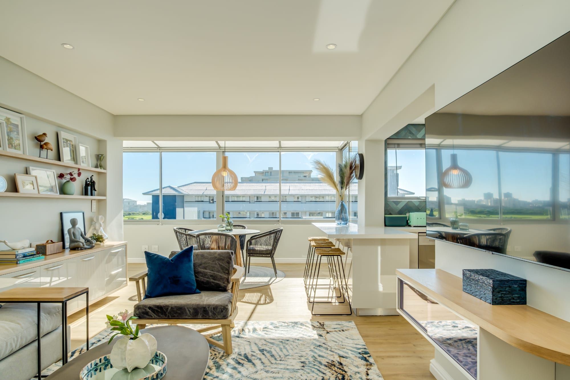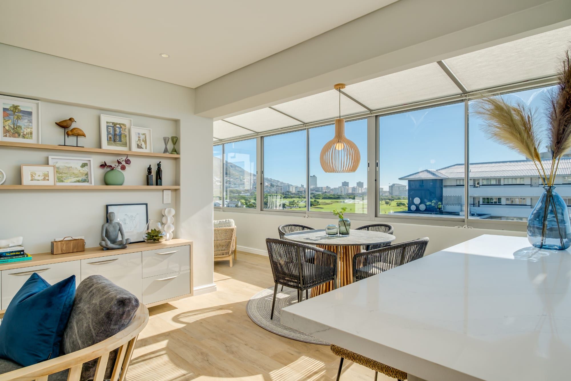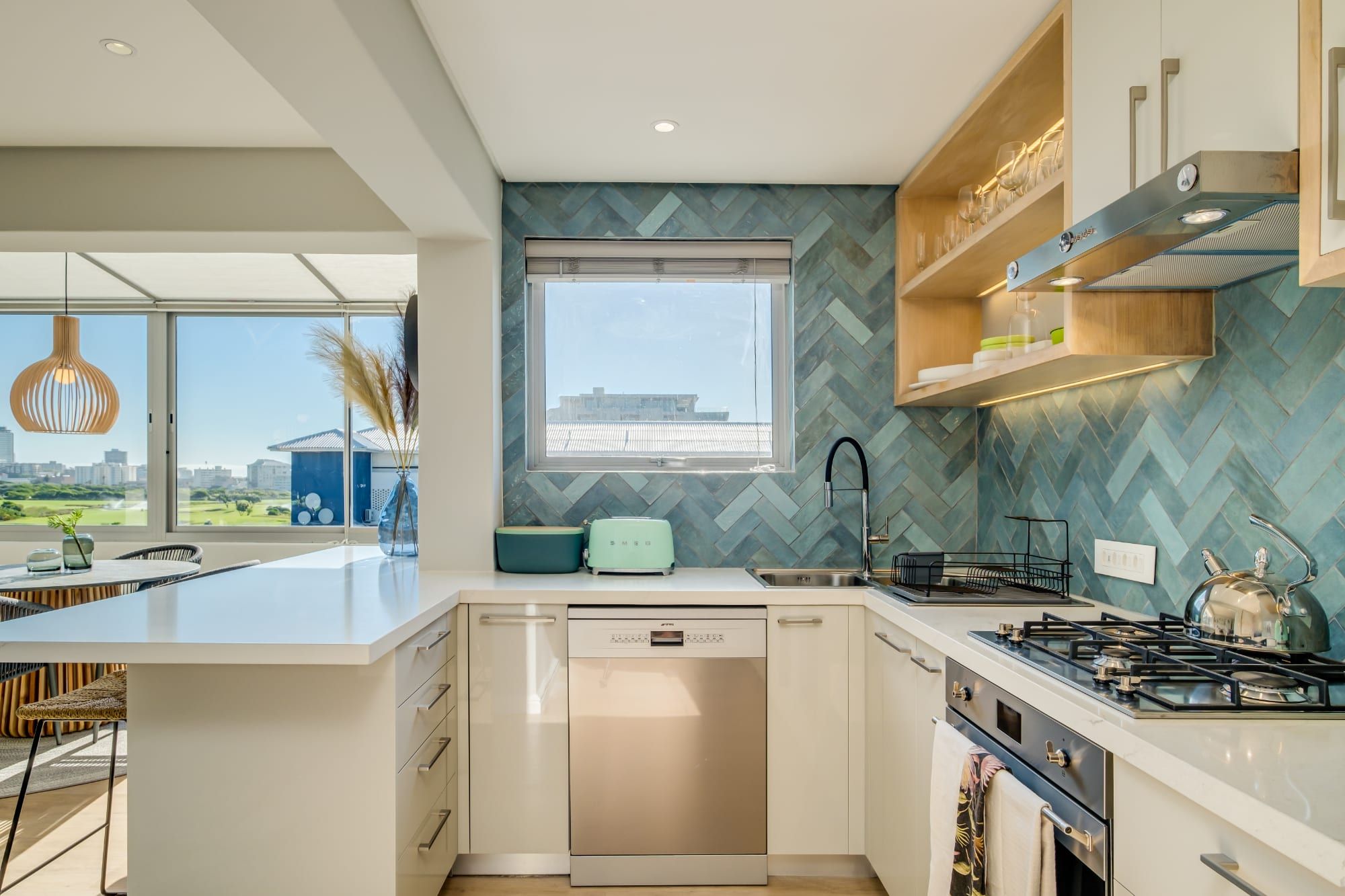 Bright and modern, this home in Mouille Point combines rattan furniture, pampas grass, and plenty of wooden elements with bold wallpaper and vibrant tiles to create a natural bohemian style with dramatic flair. As if that isn’t already impressive enough, this home also has incredible views of Lion’s head on one side and the Atlantic on the other.