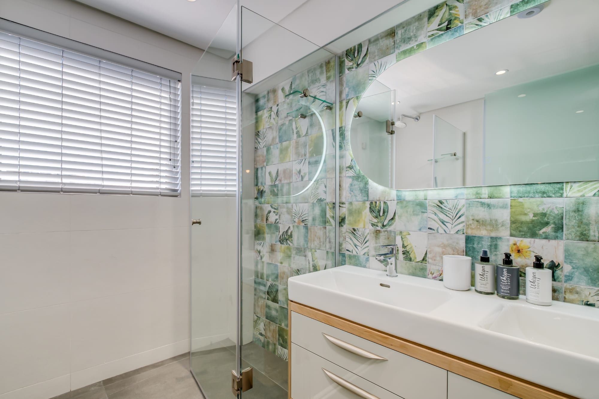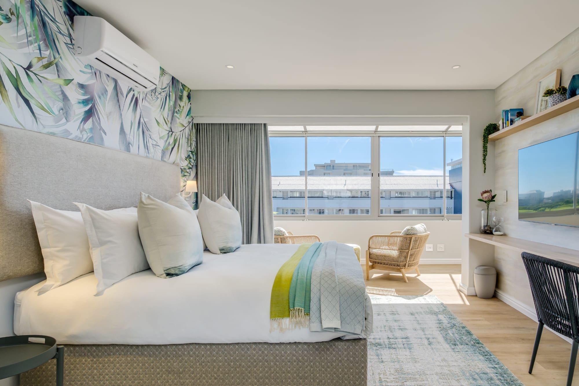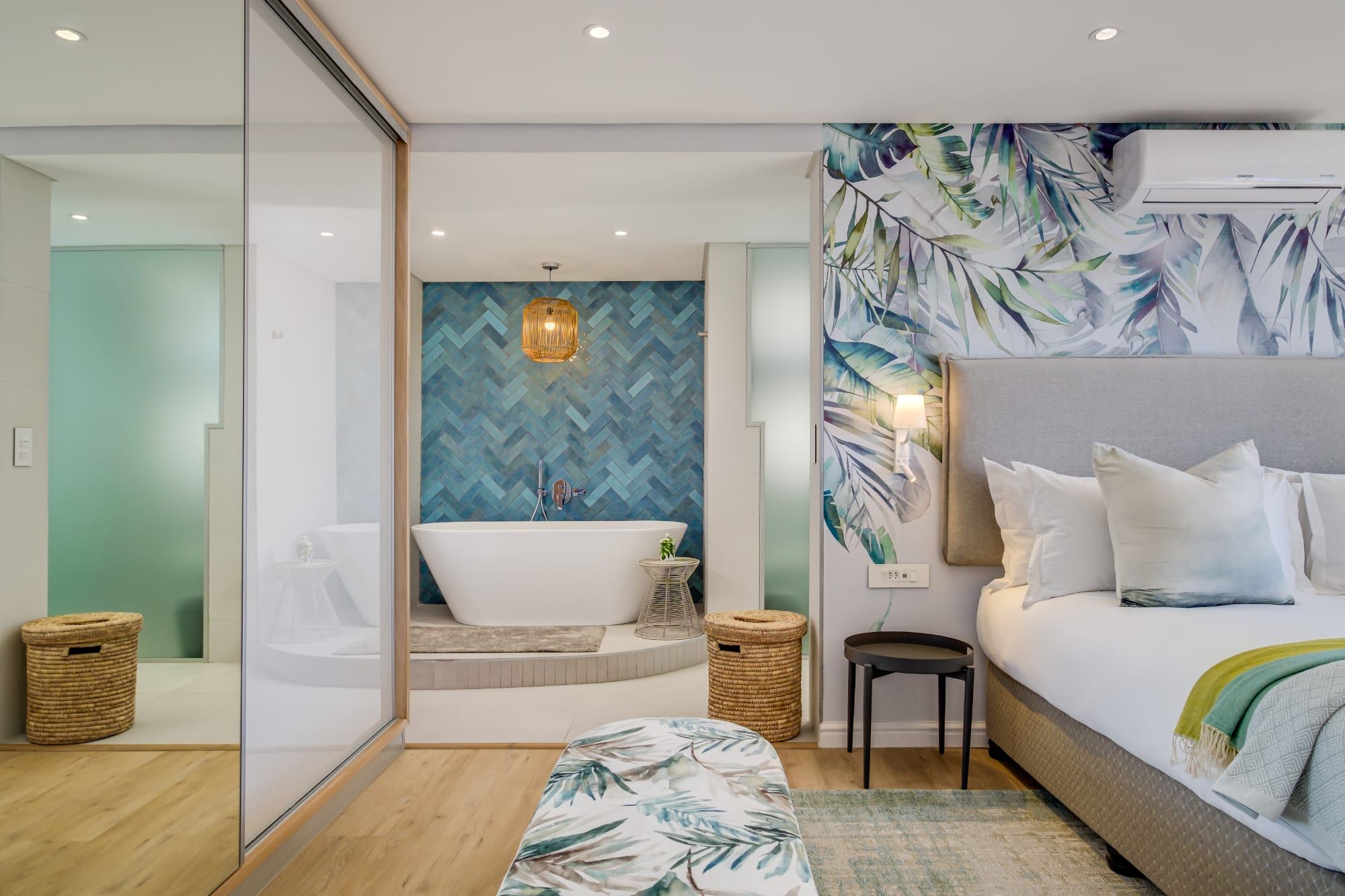 Bright and modern, this home in Mouille Point combines rattan furniture, pampas grass, and plenty of wooden elements with bold wallpaper and vibrant tiles to create a natural bohemian style with dramatic flair. As if that isn’t already impressive enough, this home also has incredible views of Lion’s head on one side and the Atlantic on the other.