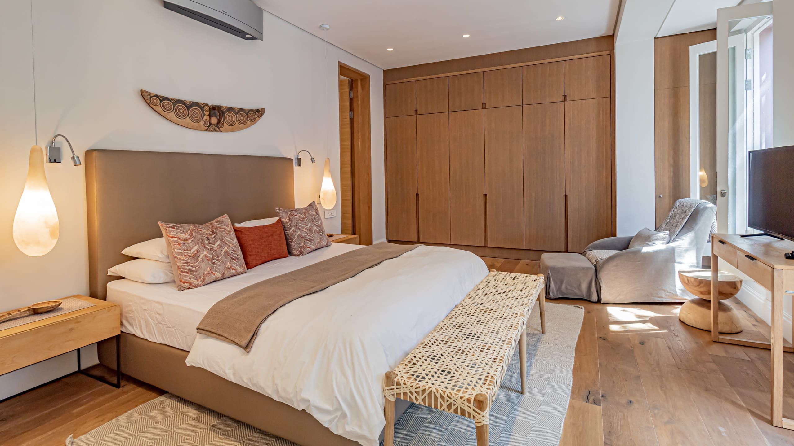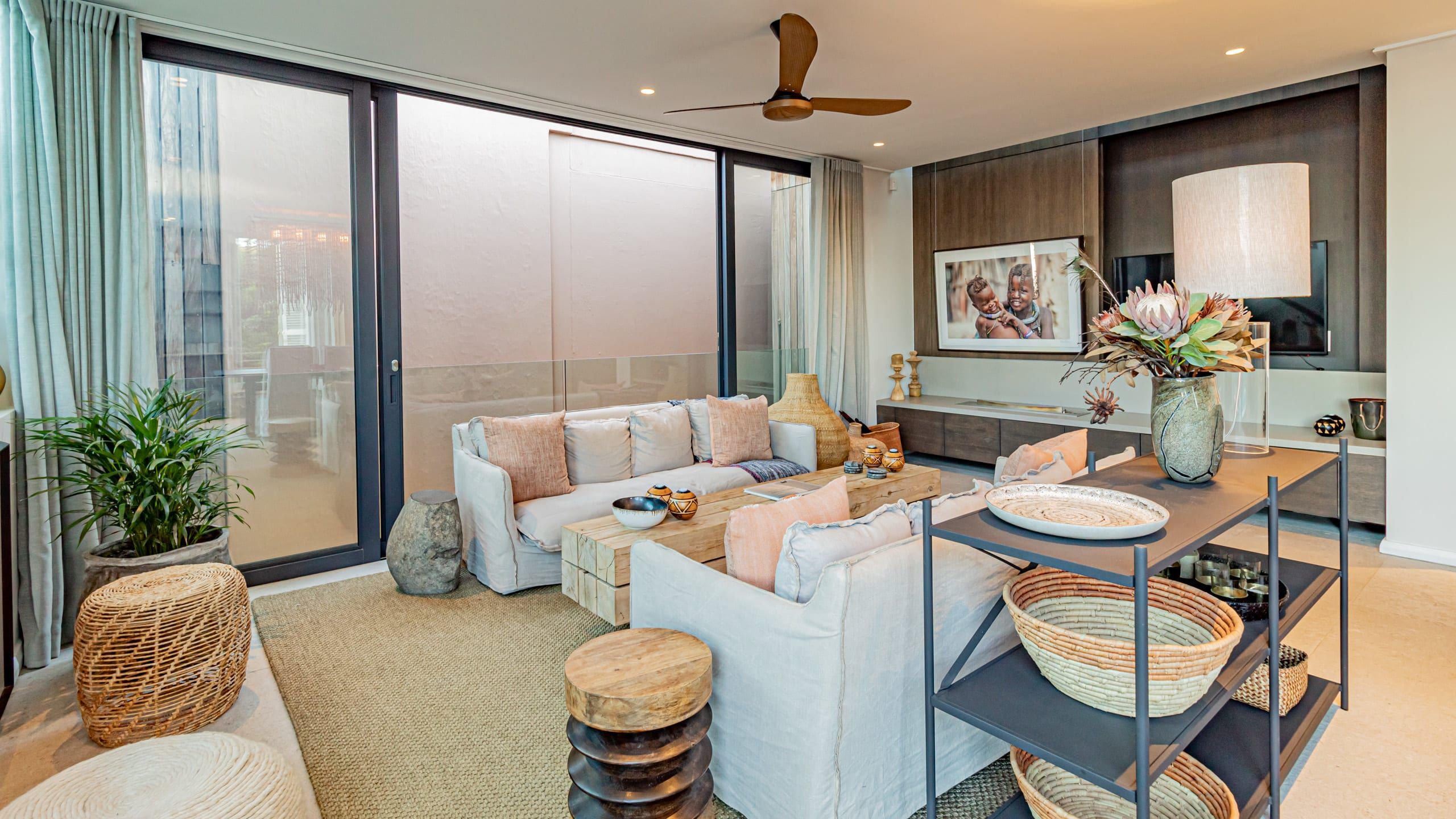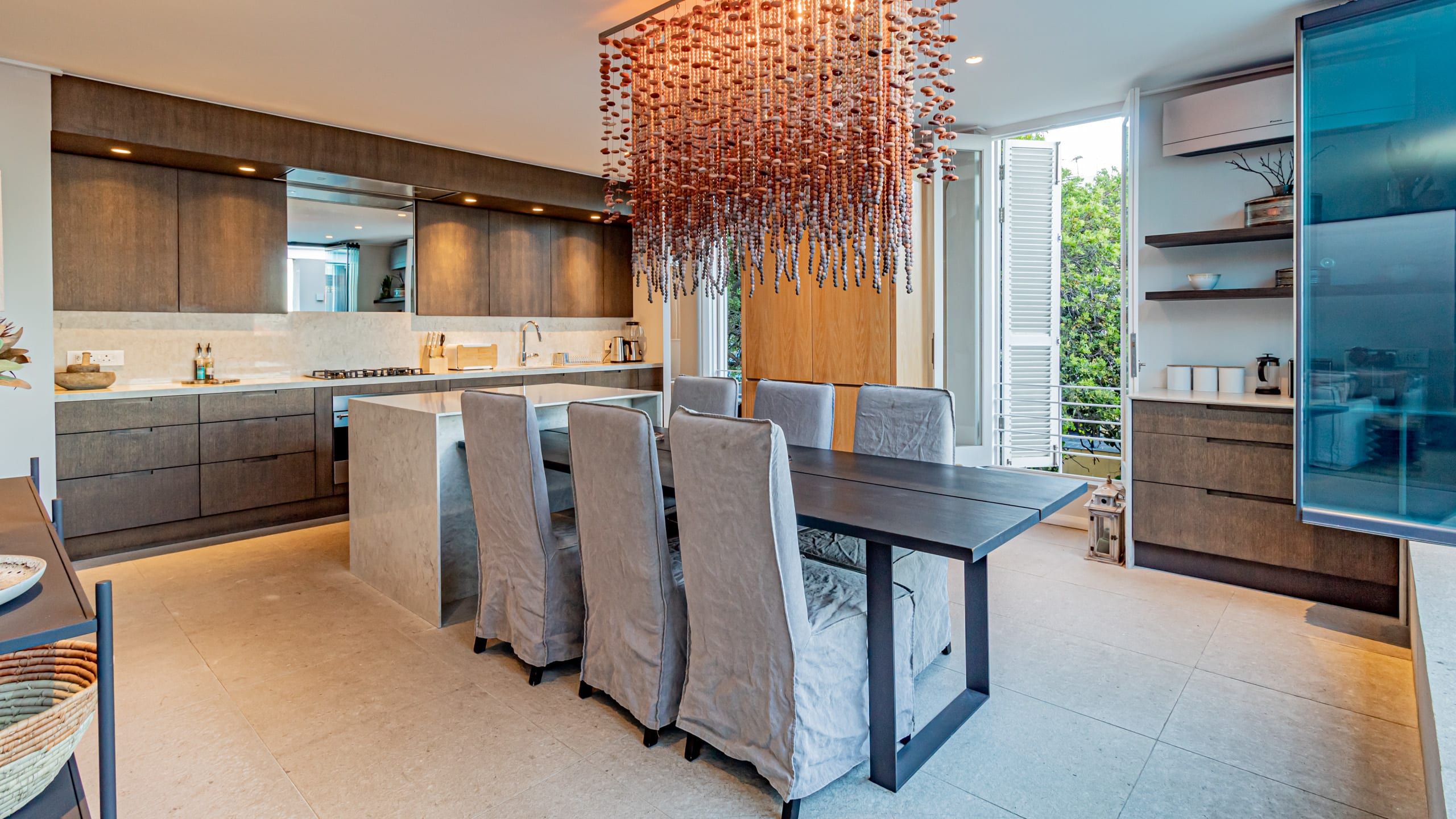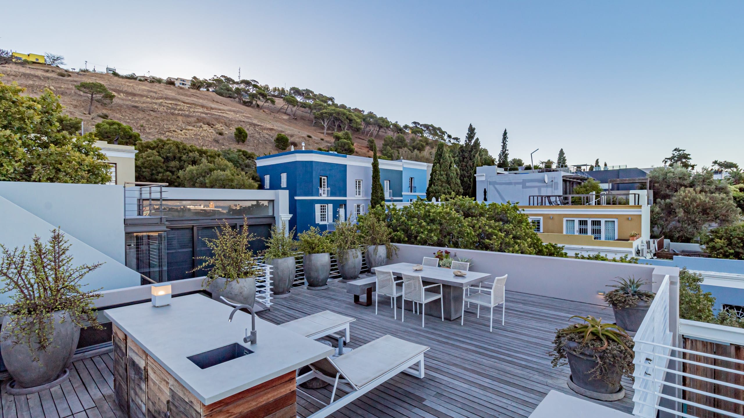 The main living space is particularly impressive with its glass foldaway doors that give way to a private splash pool – ideal for cooling off after a long day of sightseeing while watching the sunset from its picture window. Alternatively, spend evenings gathered around the elegant dining table, or better yet, head upstairs to the rooftop terrace for alfresco meals and breathtaking views of Signal Hill.