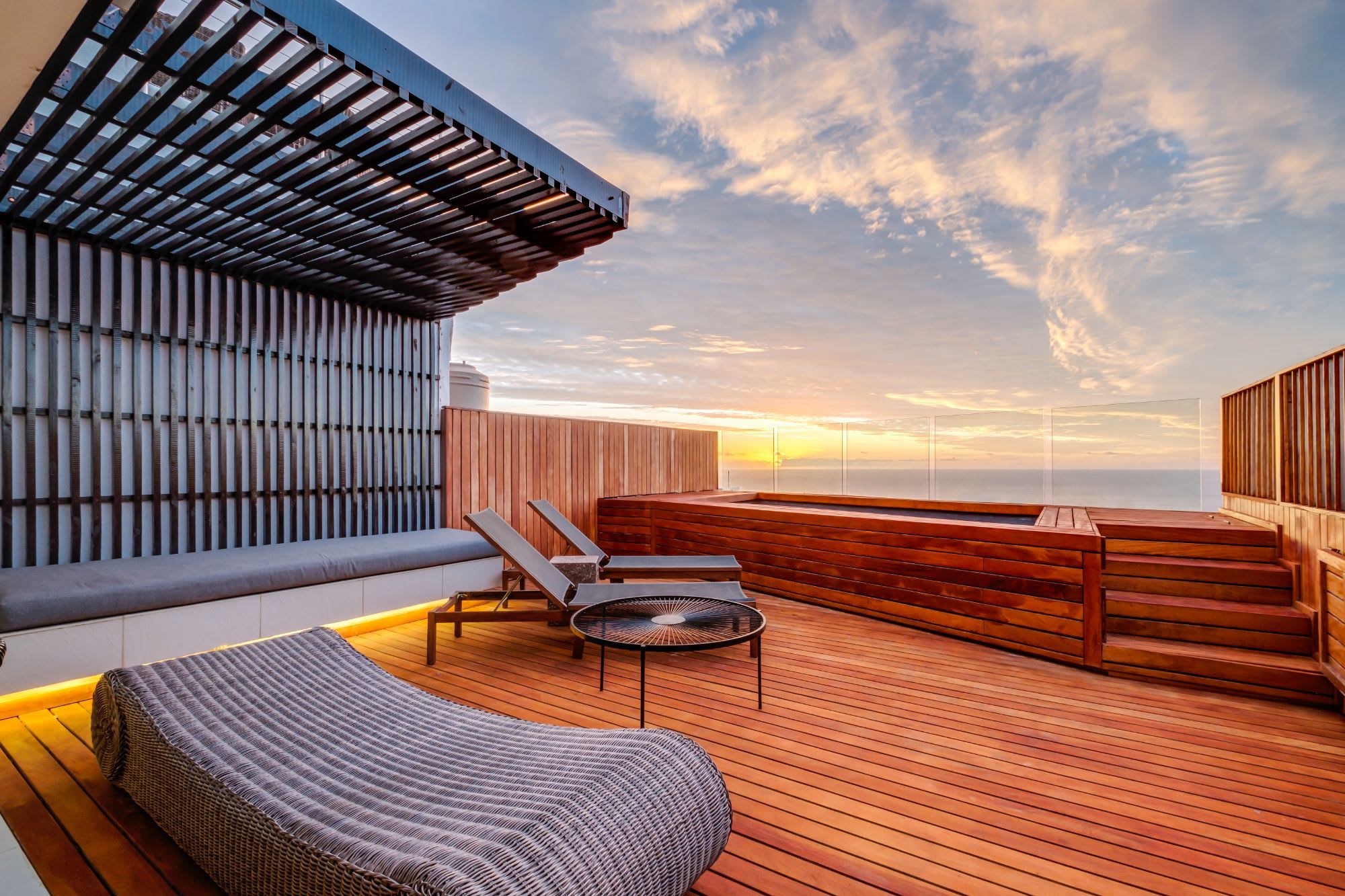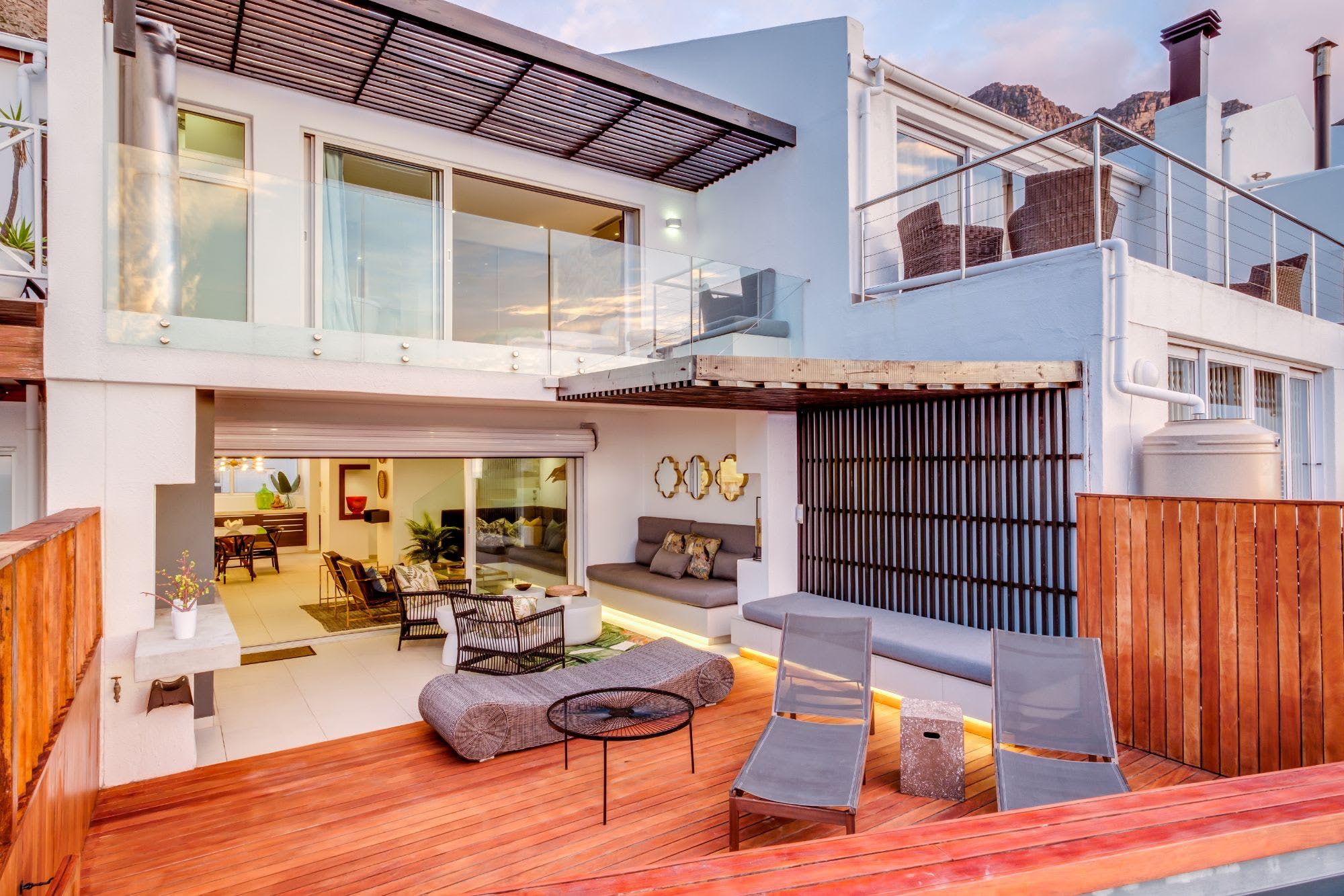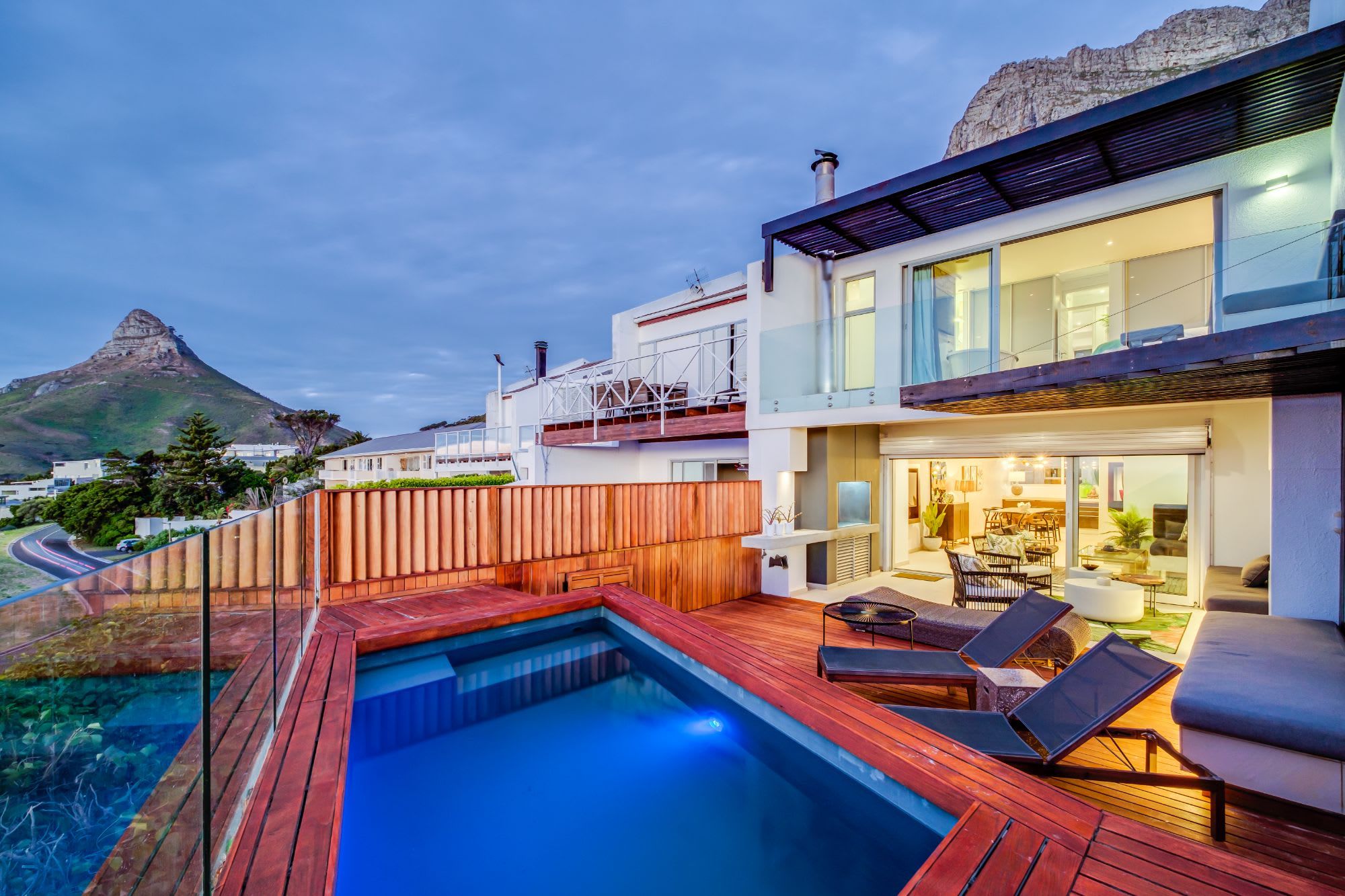 With spectacular views over rolling South Atlantic swells and the iconic 669m-tall Lion's Head mountain, this three-bedroom apartment is high up in Camps Bay, within a quiet, family-friendly enclave of nine semi-detached units.