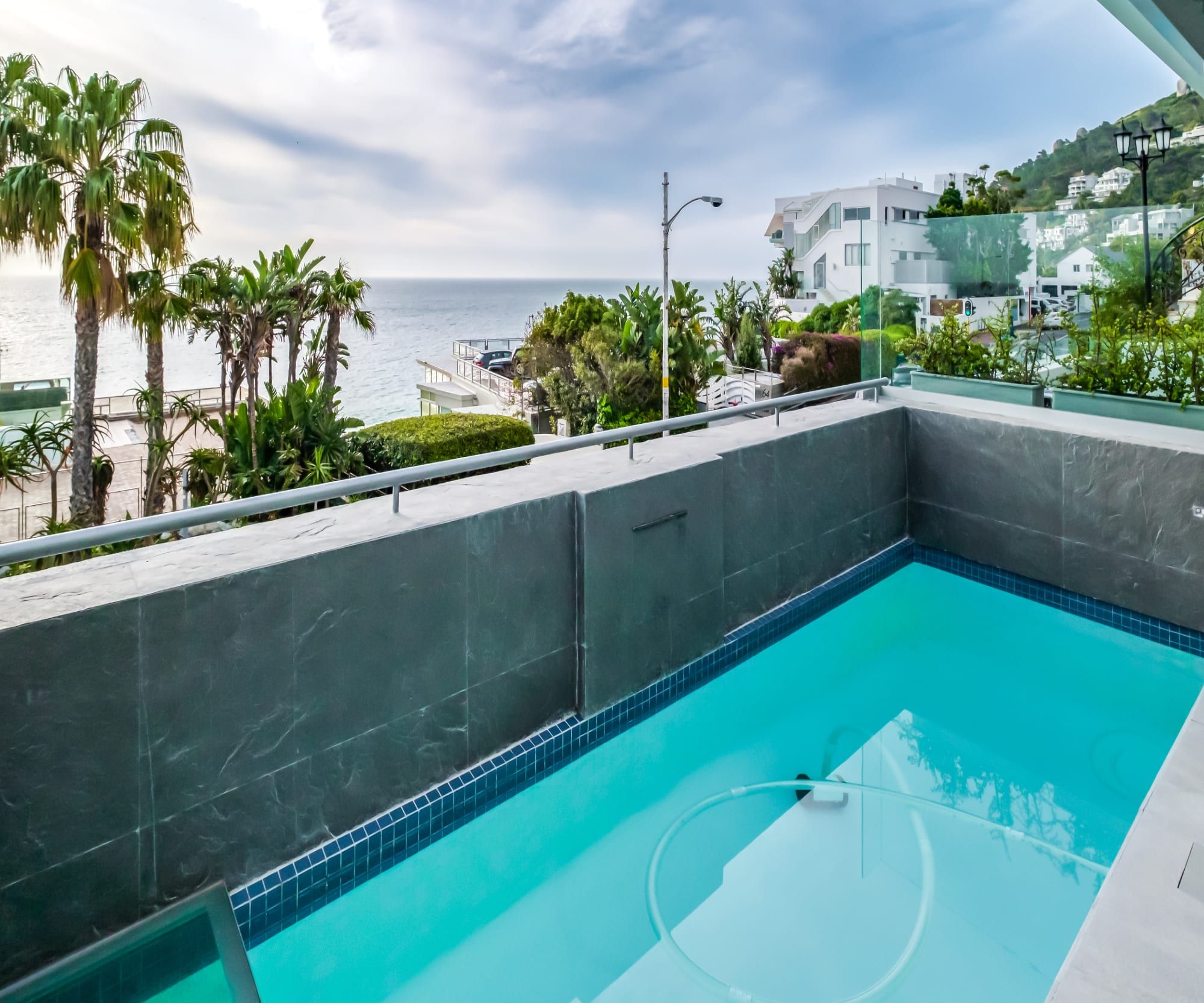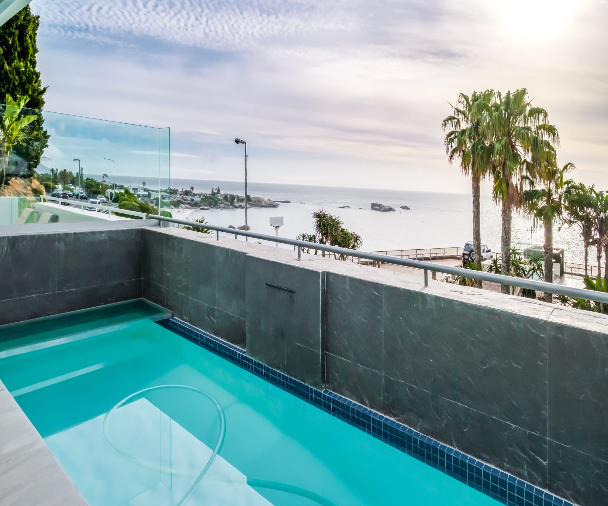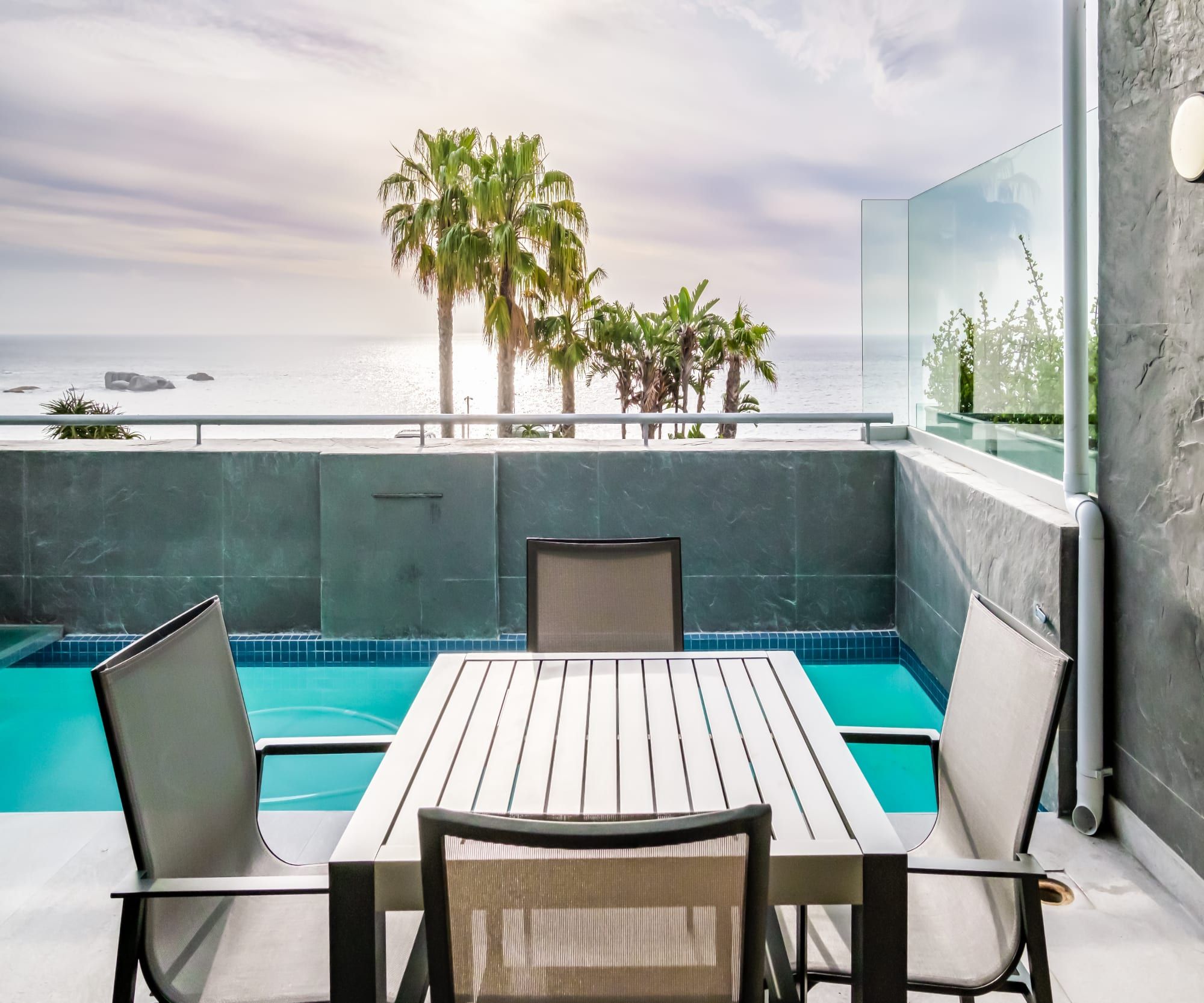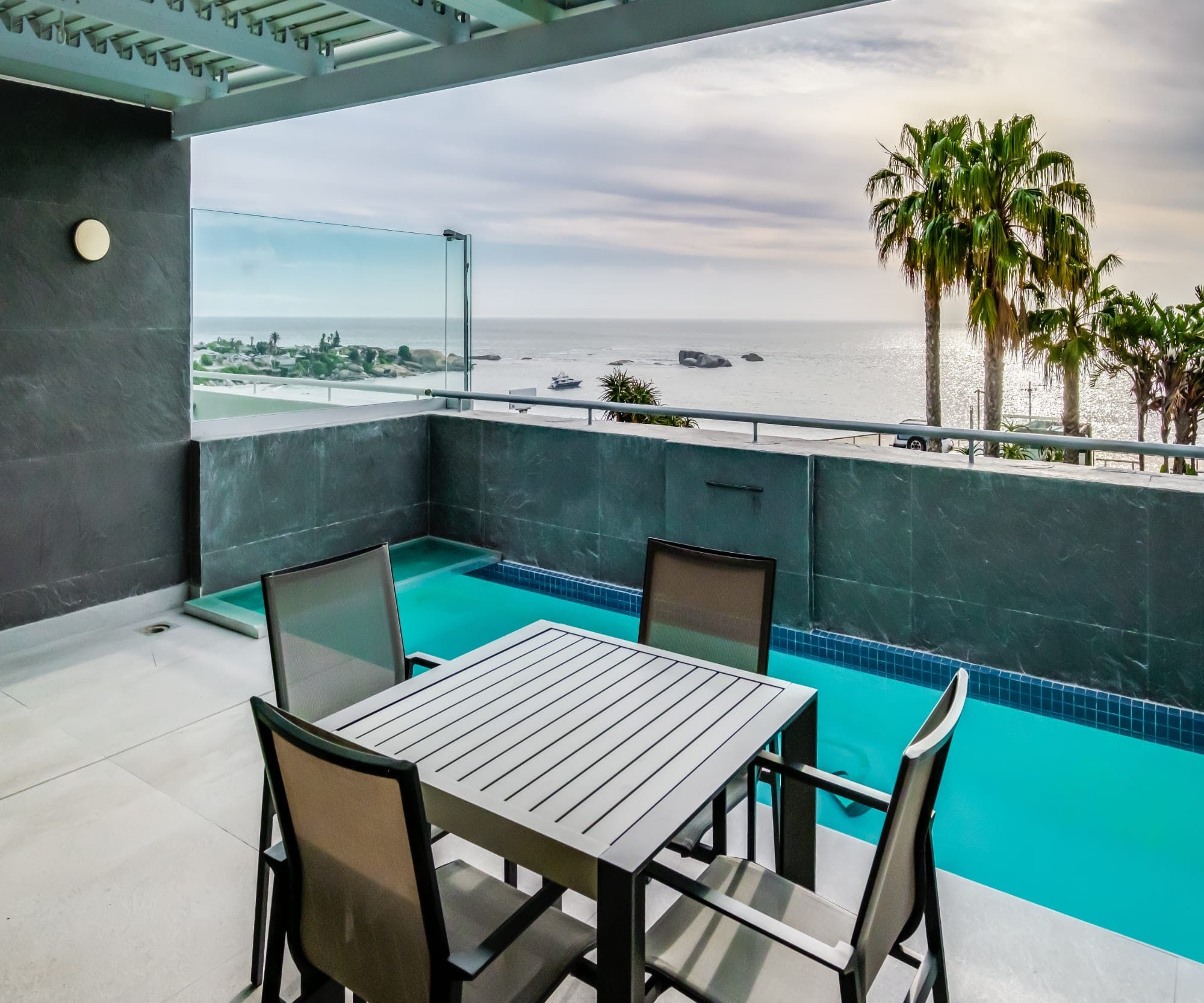 A contemporary Clifton stay awaits you at this stunning seaside apartment, located just a stone’s throw from the picturesque palm-lined shore and gorgeous blue sea of Clifton Beach. We love this home’s modern and trendy feel, with marbled surfaces, mirrored walls, luxe light fittings and sleek furniture. We were particularly impressed by the kitchen area, furnished with the latest mod-cons, and featuring a breakfast bar where you can pour some champagne and share a toast. There’s also a dining set for tucking into delicious braai all together on summer evenings. But the true gem of the home is in its outdoor areas – the breathtaking views out to sea make the space feel special. The balcony features a private pool which provides the perfect place to cool off from the hot South African sunshine, while the alfresco dining set is great for sipping on sundowners and watching the sky turn pink.