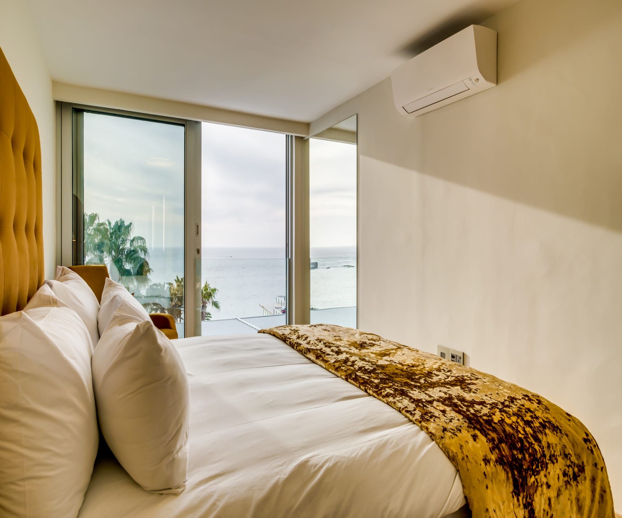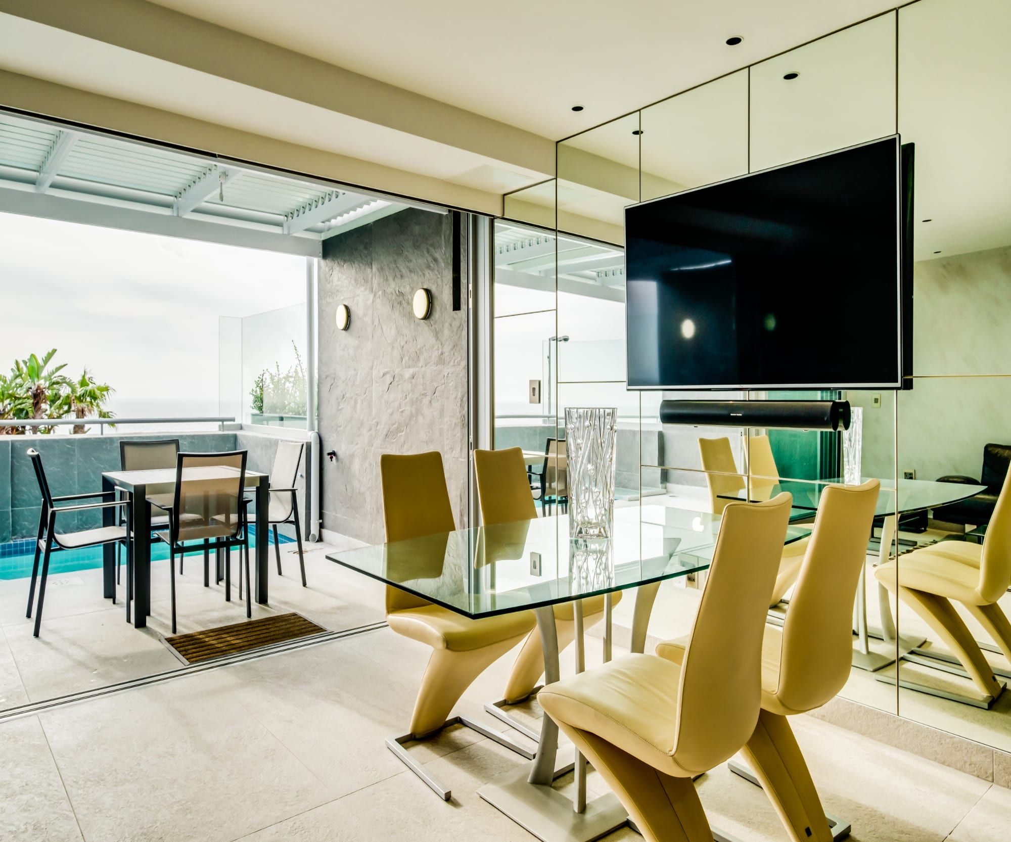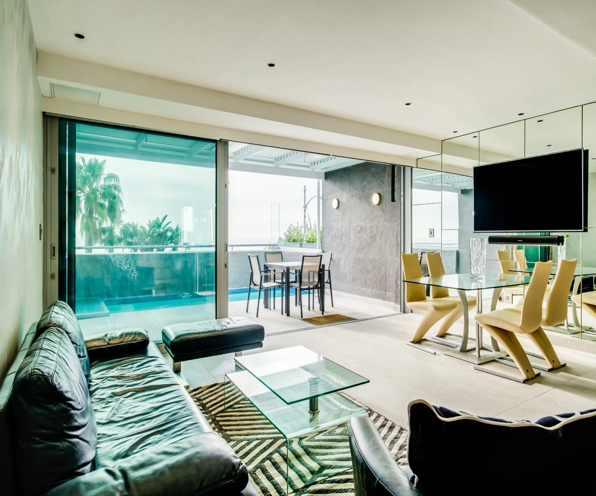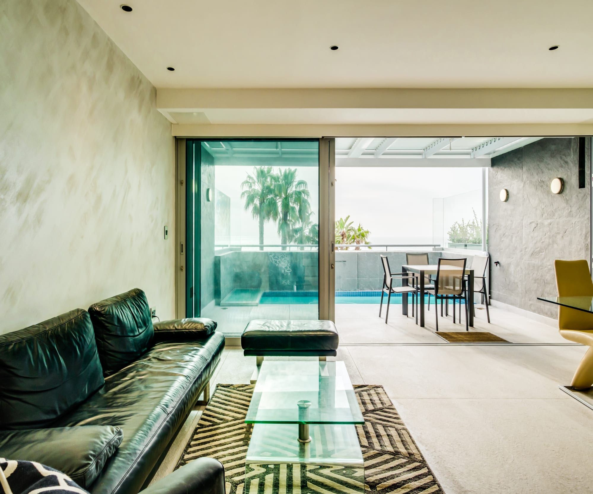 A contemporary Clifton stay awaits you at this stunning seaside apartment, located just a stone’s throw from the picturesque palm-lined shore and gorgeous blue sea of Clifton Beach. We love this home’s modern and trendy feel, with marbled surfaces, mirrored walls, luxe light fittings and sleek furniture. We were particularly impressed by the kitchen area, furnished with the latest mod-cons, and featuring a breakfast bar where you can pour some champagne and share a toast. There’s also a dining set for tucking into delicious braai all together on summer evenings. But the true gem of the home is in its outdoor areas – the breathtaking views out to sea make the space feel special. The balcony features a private pool which provides the perfect place to cool off from the hot South African sunshine, while the alfresco dining set is great for sipping on sundowners and watching the sky turn pink.