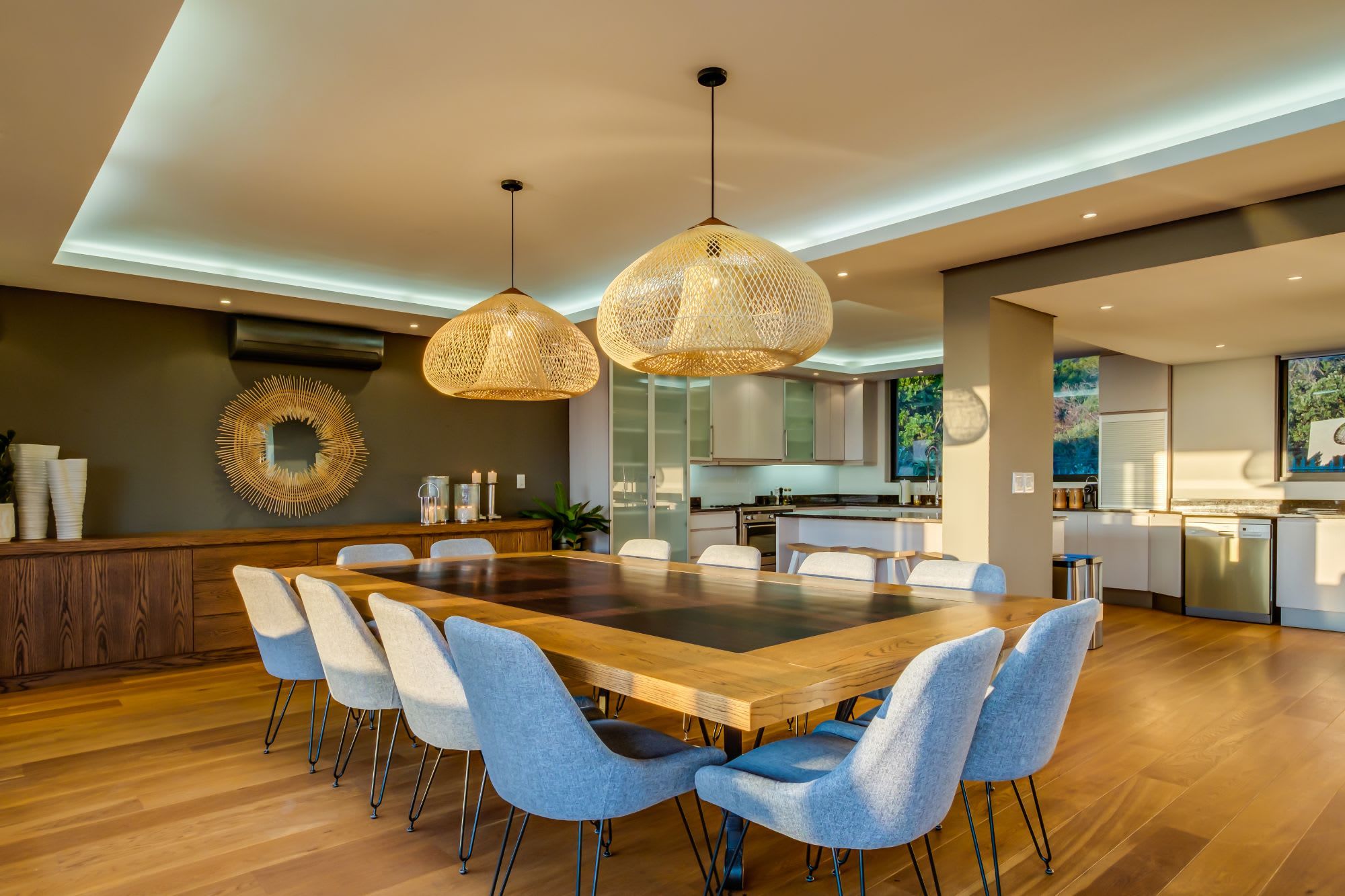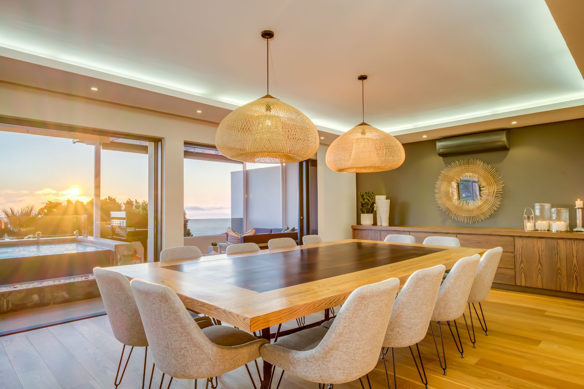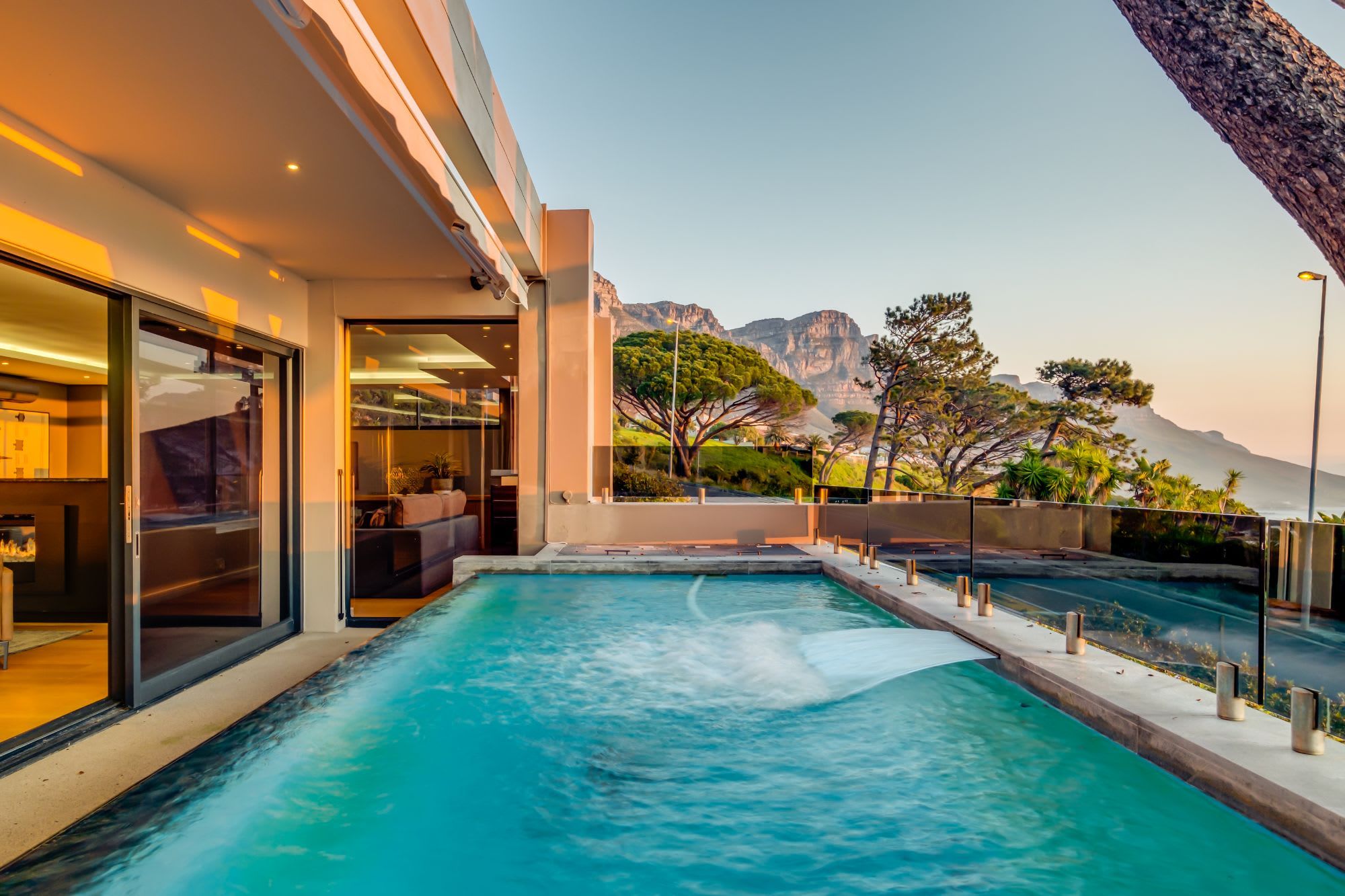 With a view of the Twelve Apostle Hills and an enviable location in Camps Bay, this family villa is a little slice of luxury in Cape Town. There’s plenty to keep the whole group entertained and pampered at the villa itself, with a swimming pool looking out towards the Atlantic, a separate plunge pool and a braai for those hot summer nights. A wall of glass slides open to blend the swimming pool terrace with the huge, open-plan living area. In here, you’ve got a vast dining table and plush lounge set around a striking feature fireplace.