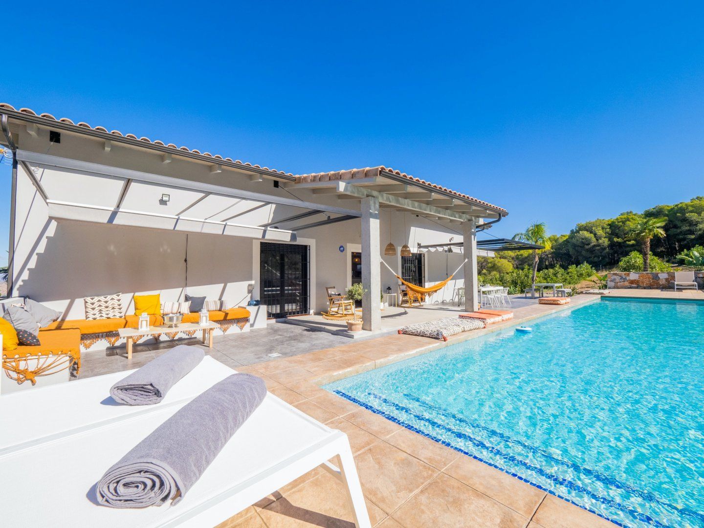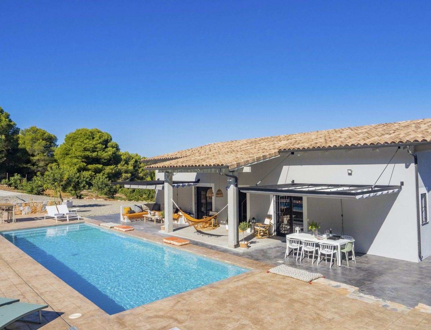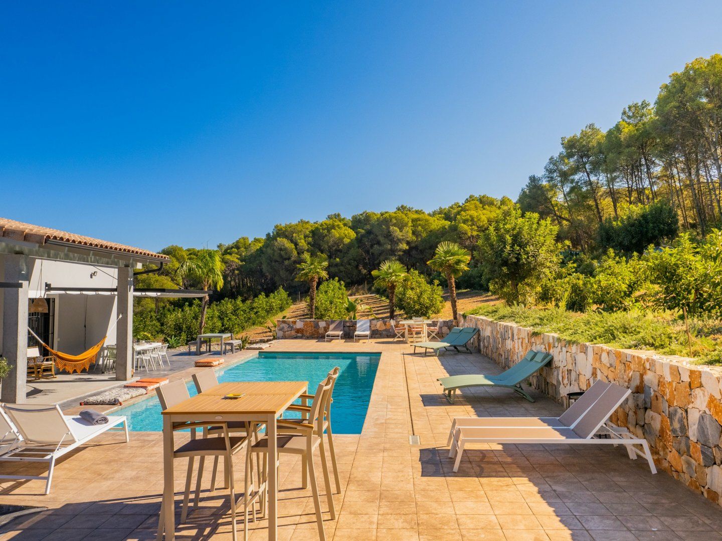 Outside, you’ll find a haven of tranquillity. From early morning dips in the pool to lazy afternoons swaying in the hammock and sunset cocktails on the terrace, you’ll find it easy to settle in and make this space your own. And when you’re ready to retreat inside, the living room welcomes you to enjoy cosy evenings by the fire, while the bedrooms set the tone for total relaxation.