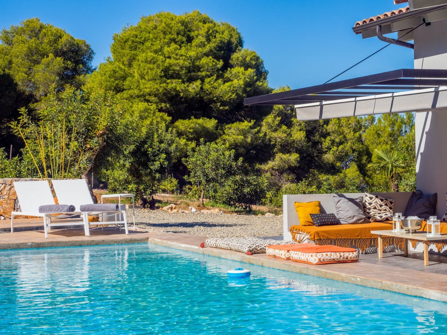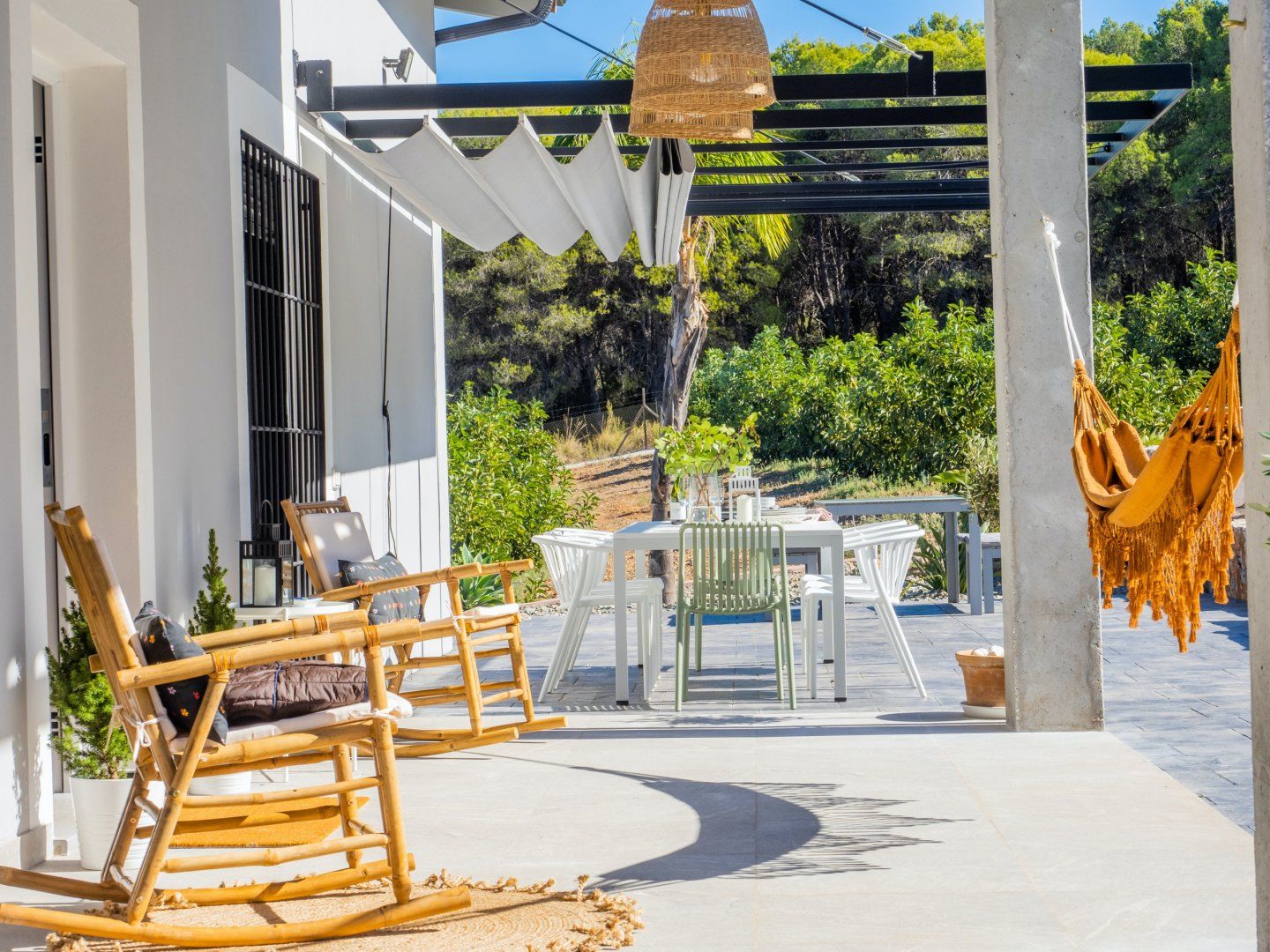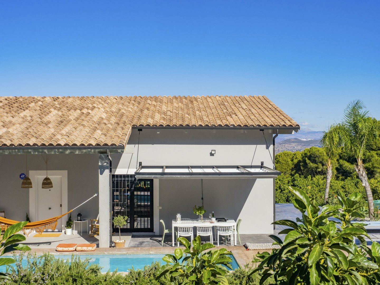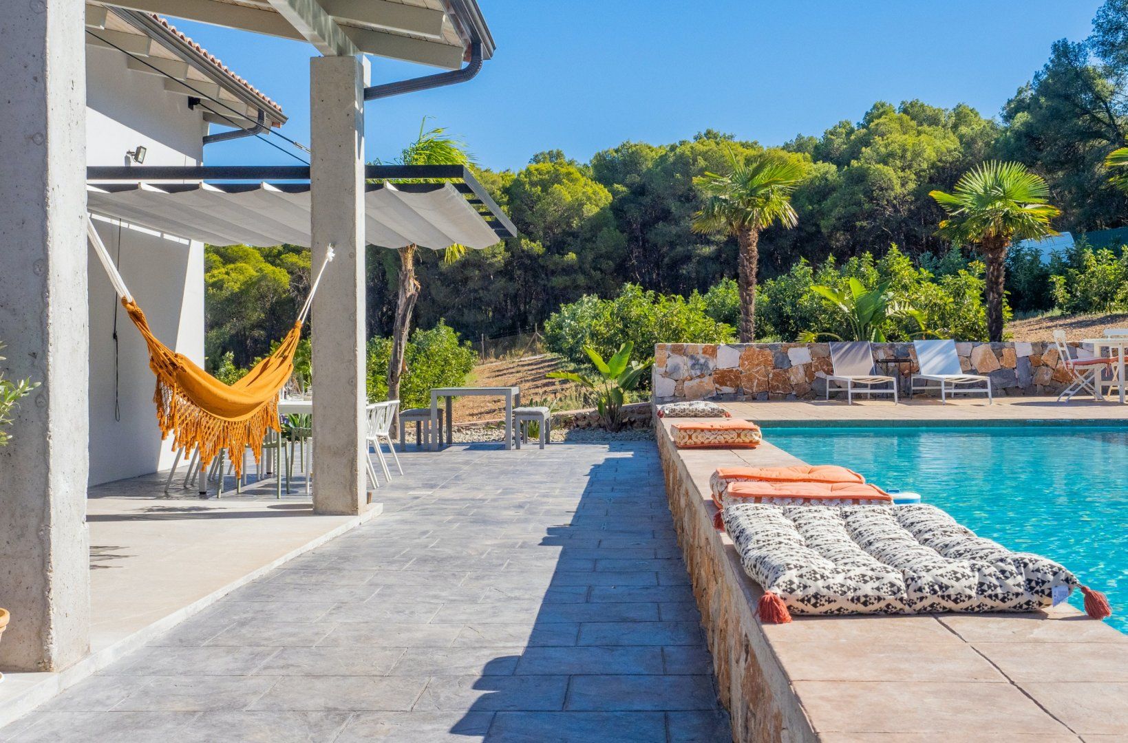 Outside, you’ll find a haven of tranquillity. From early morning dips in the pool to lazy afternoons swaying in the hammock and sunset cocktails on the terrace, you’ll find it easy to settle in and make this space your own. And when you’re ready to retreat inside, the living room welcomes you to enjoy cosy evenings by the fire, while the bedrooms set the tone for total relaxation.