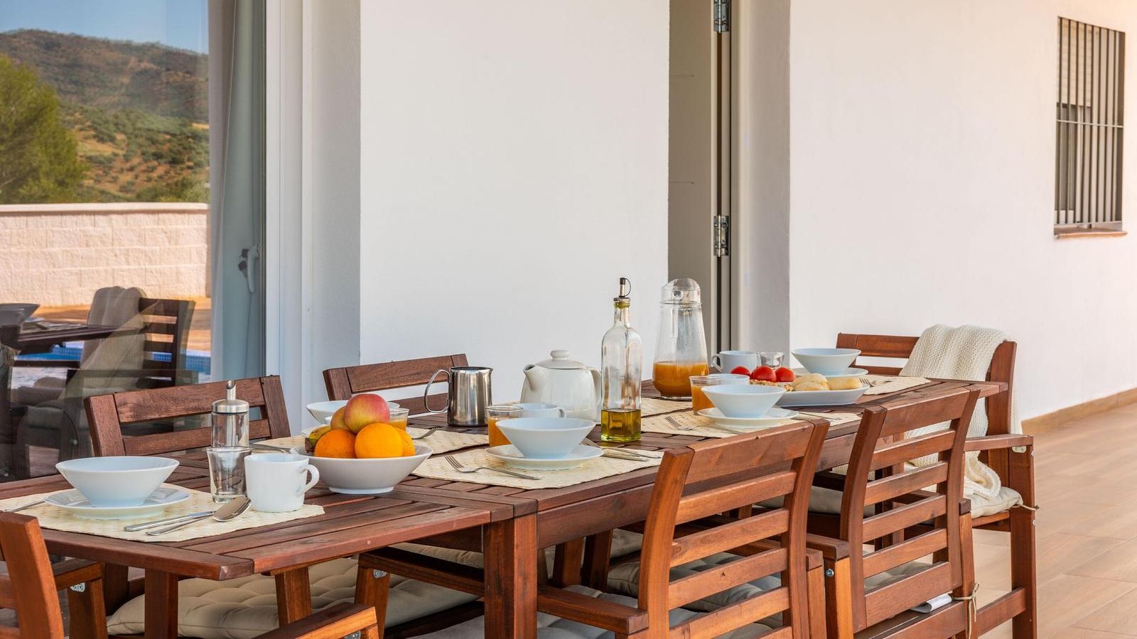 You can also settle down with a drink at the outdoor dining table, complemented by tasty plates of tapas. It's an idyllic spot to gather in the evenings, sharing delicious food and good conversation as the sun sets beneath the rolling hills.