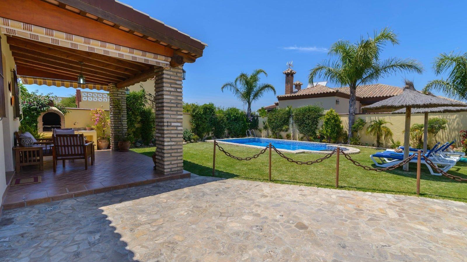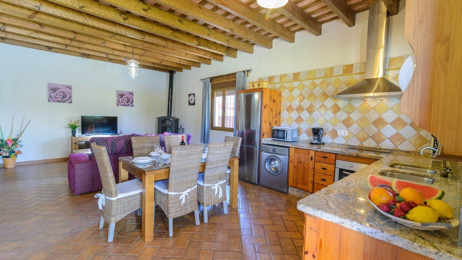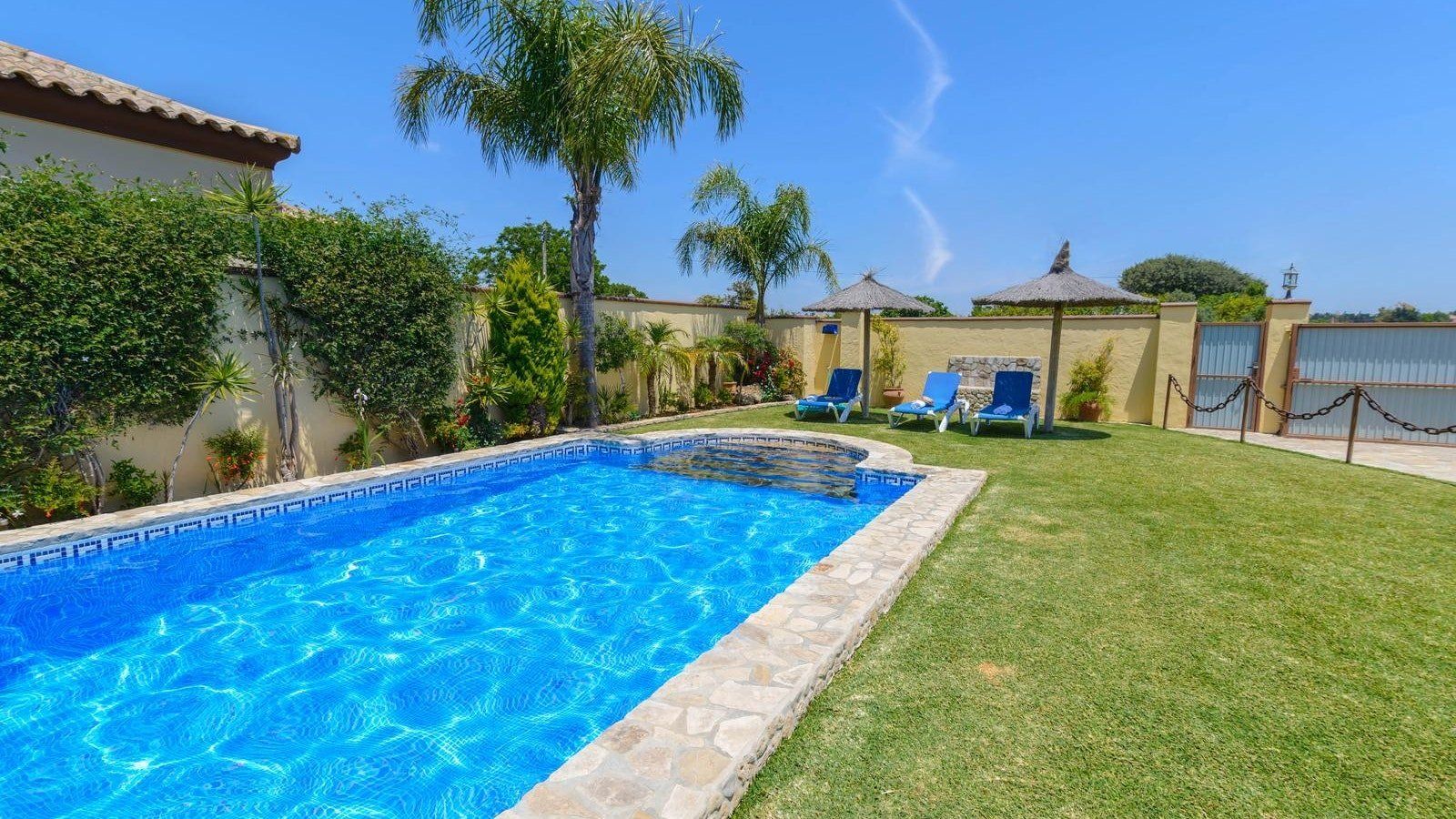 You’ll love whiling away hours lazing on loungers in the lush, green garden before cooling off with a refreshing dip in your Roman style pool. Whip up mouth-watering dishes in the kitchen or grill to your heart’s content out on the poolside patio. Gather for sundowners on the covered terrace and, as the heat of the day fades, retreat inside to cosy up by the wood burning stove. At the day’s end indulge in a long, hot soak in the tub before movie night with a nightcap. Alternatively, spend the day at the nearest beach or explore the coastal city of Cadiz.