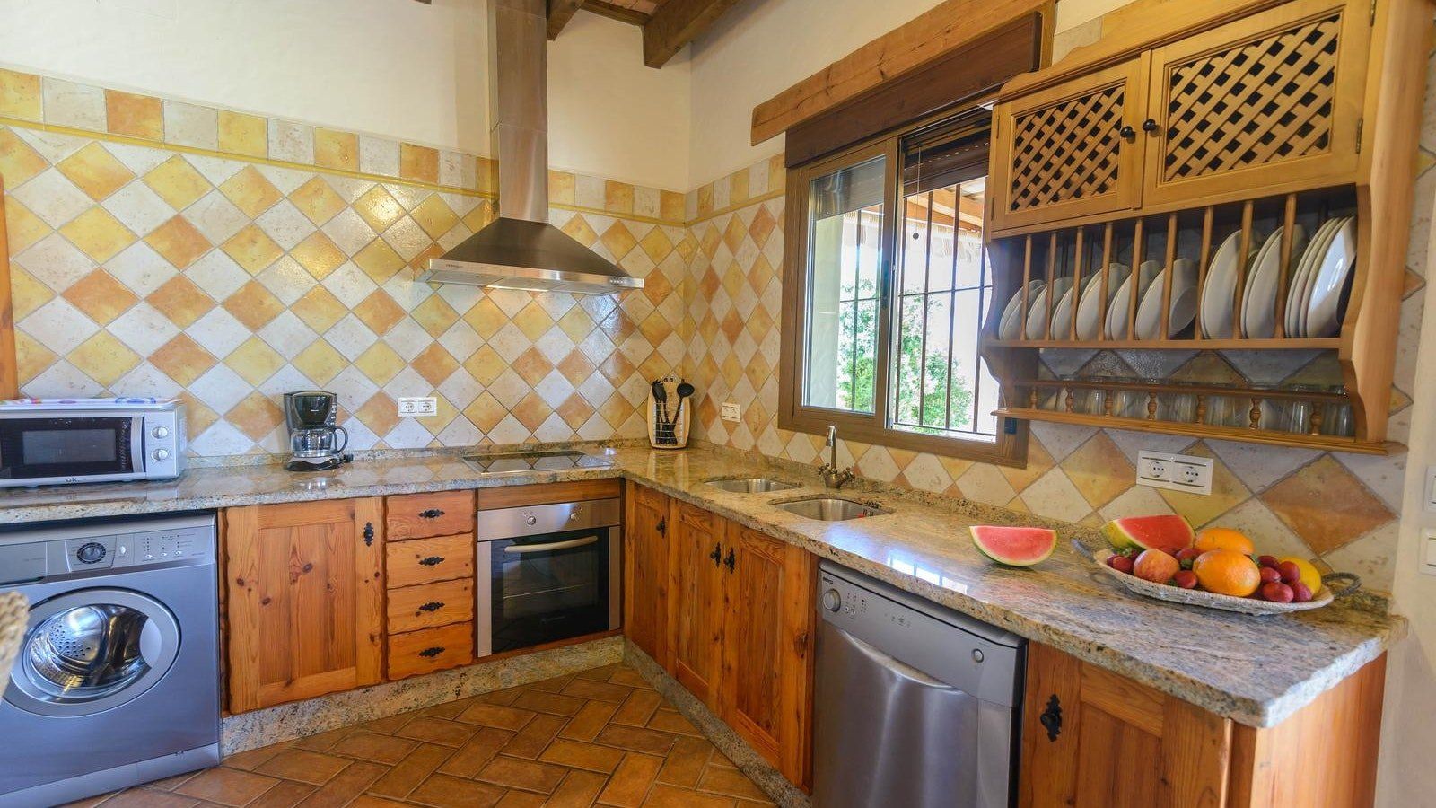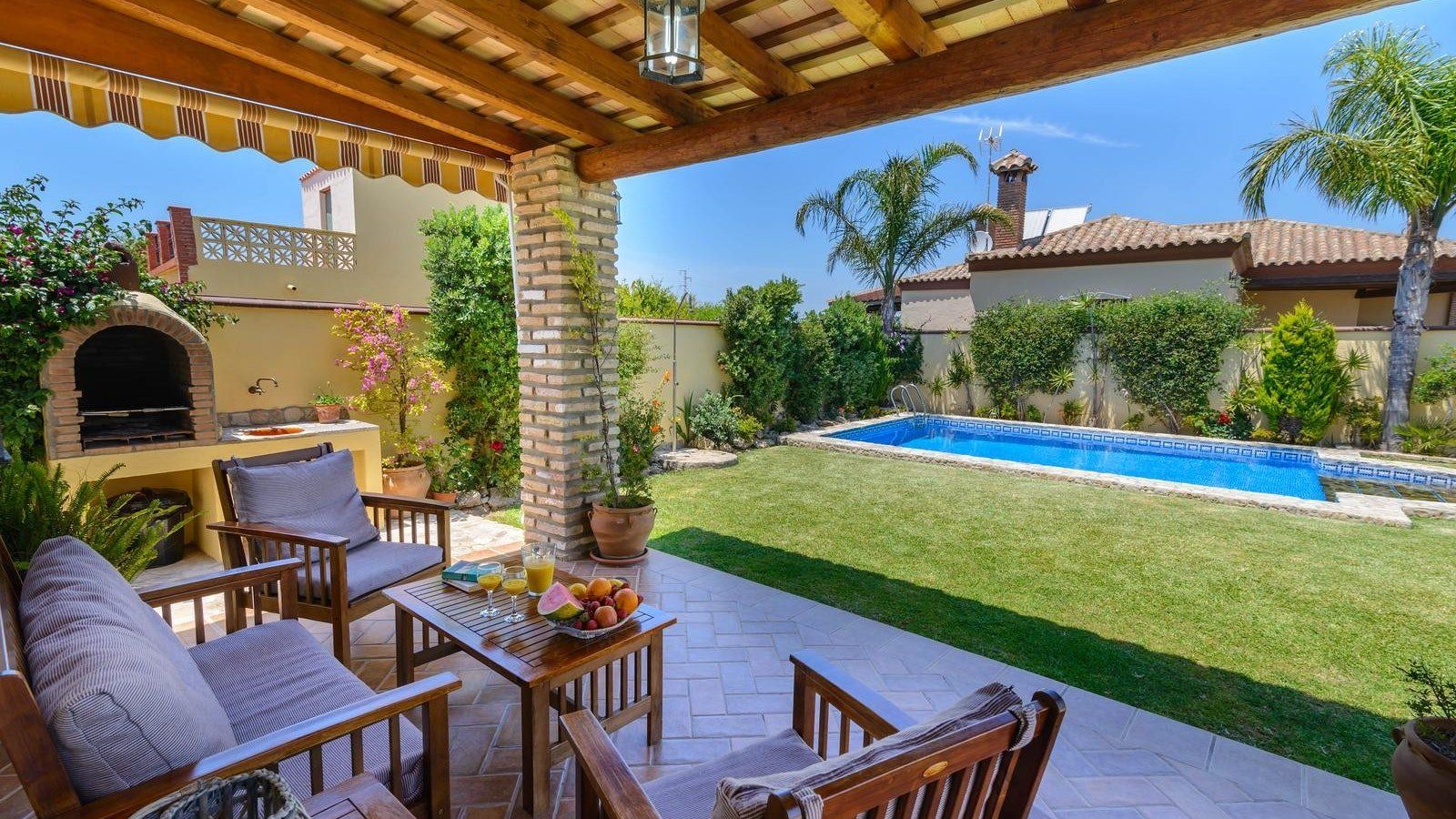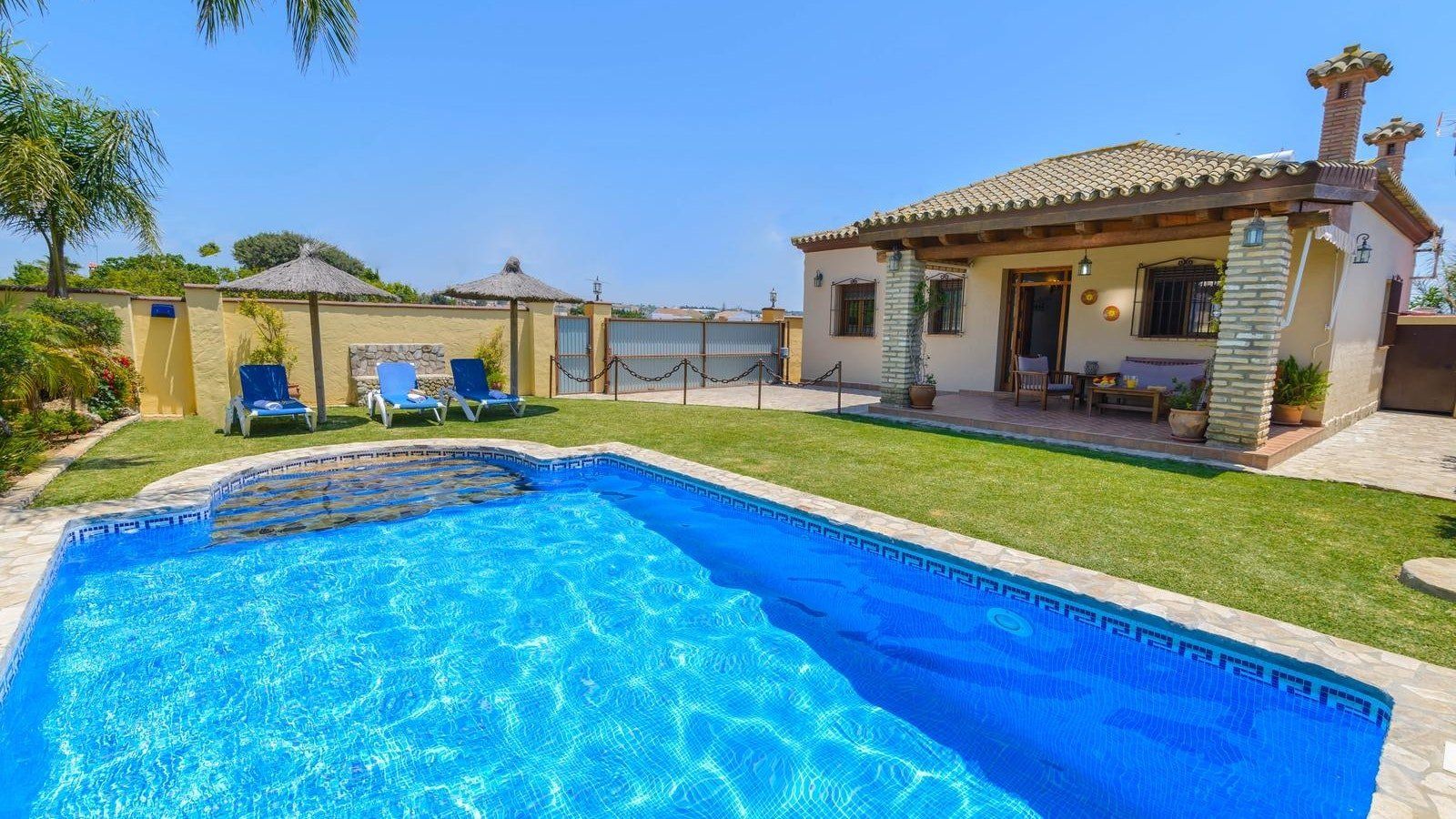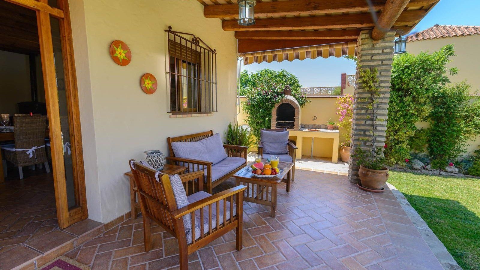 You’ll love whiling away hours lazing on loungers in the lush, green garden before cooling off with a refreshing dip in your Roman style pool. Whip up mouth-watering dishes in the kitchen or grill to your heart’s content out on the poolside patio. Gather for sundowners on the covered terrace and, as the heat of the day fades, retreat inside to cosy up by the wood burning stove. At the day’s end indulge in a long, hot soak in the tub before movie night with a nightcap. Alternatively, spend the day at the nearest beach or explore the coastal city of Cadiz.