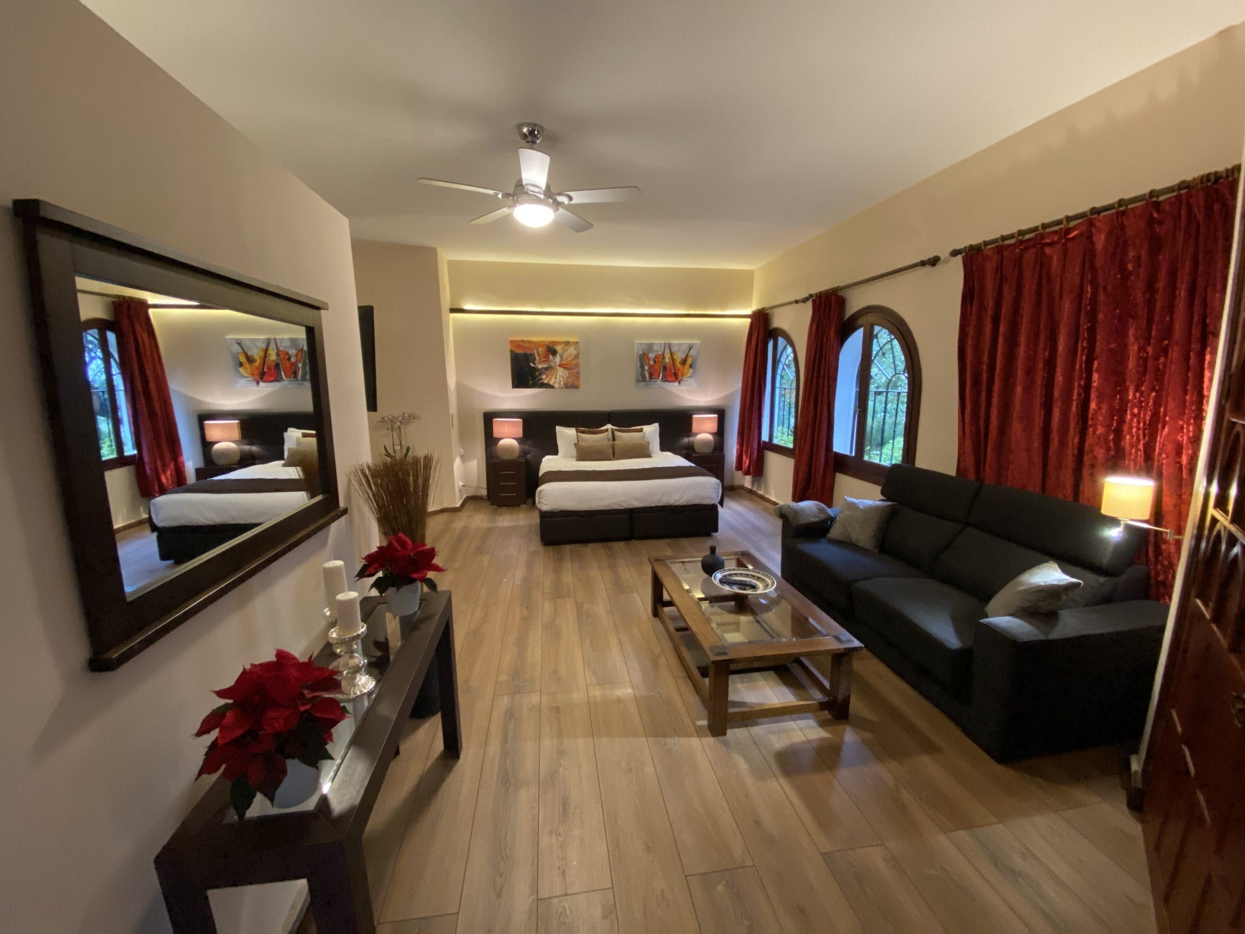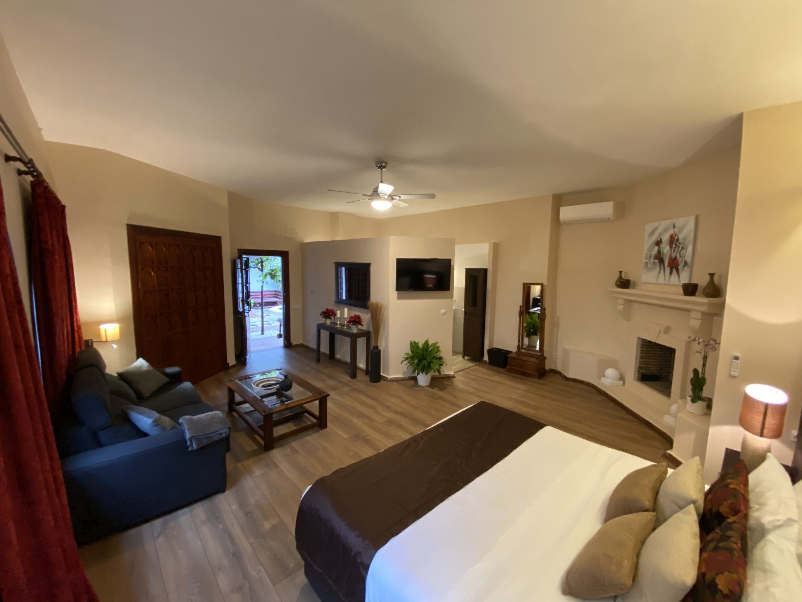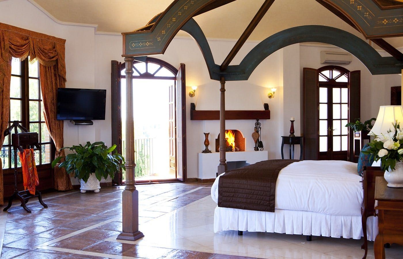 Inside, the villa presents a luxurious and traditionally Andalucian aesthetic which serves as a dreamy set up for quiet mornings or afternoons with a book or board game. The opulent living area is equipped with Sky TV, a home library, a games corner, and more than enough space to work from home should your trip combine business with leisure. There is no better spot in the home during the winter months to gather around than the huge open fireplace with a glass of wine in hand.