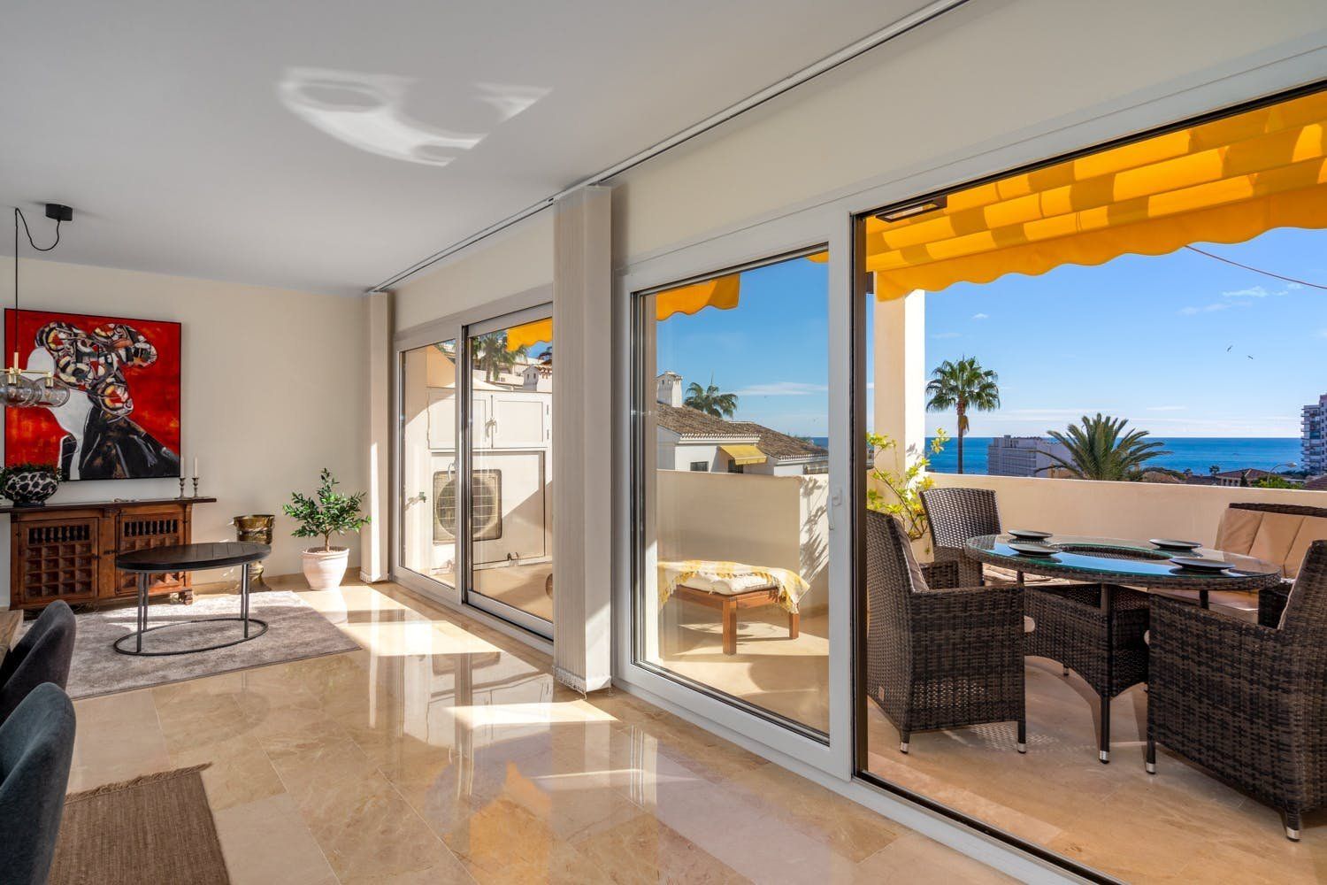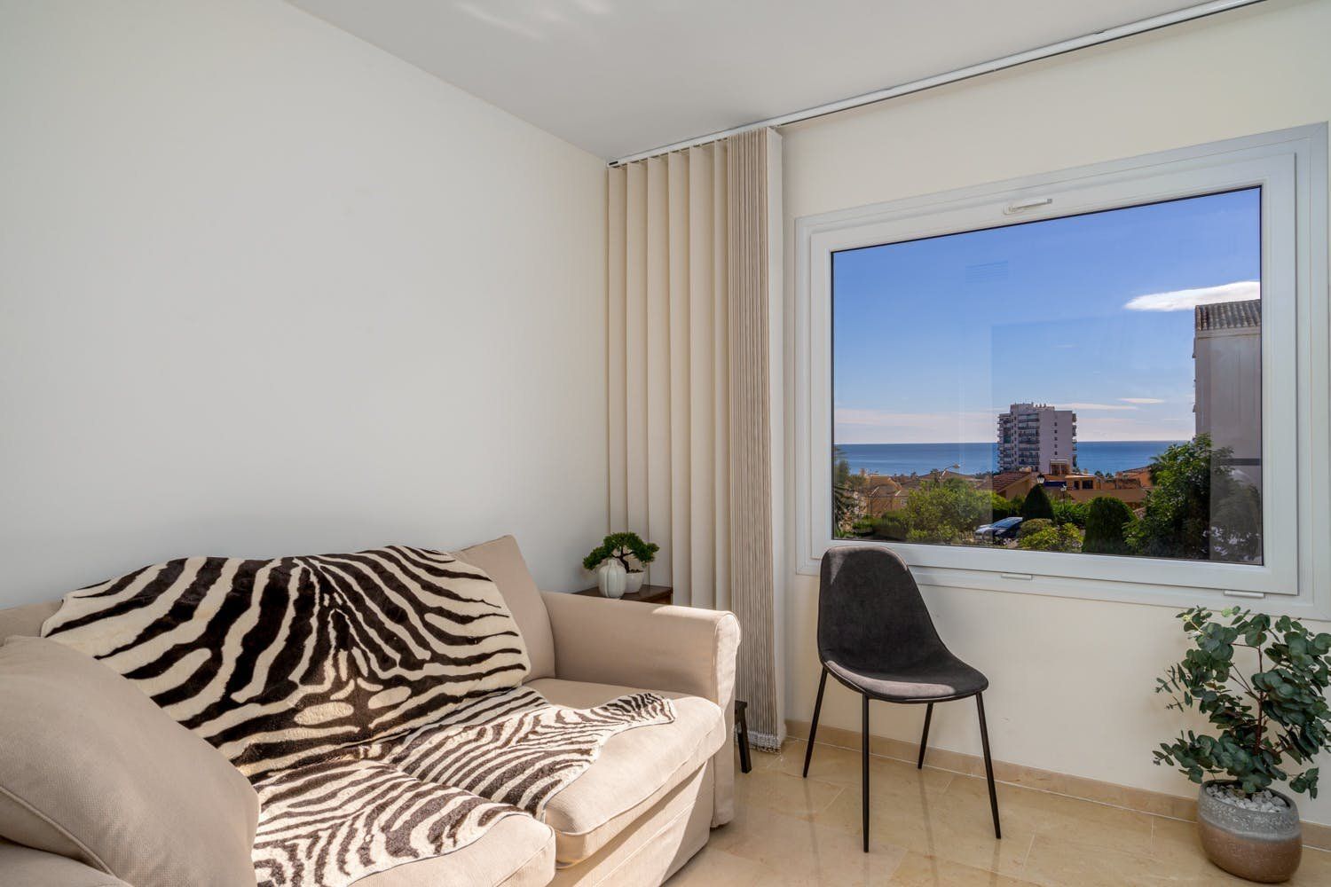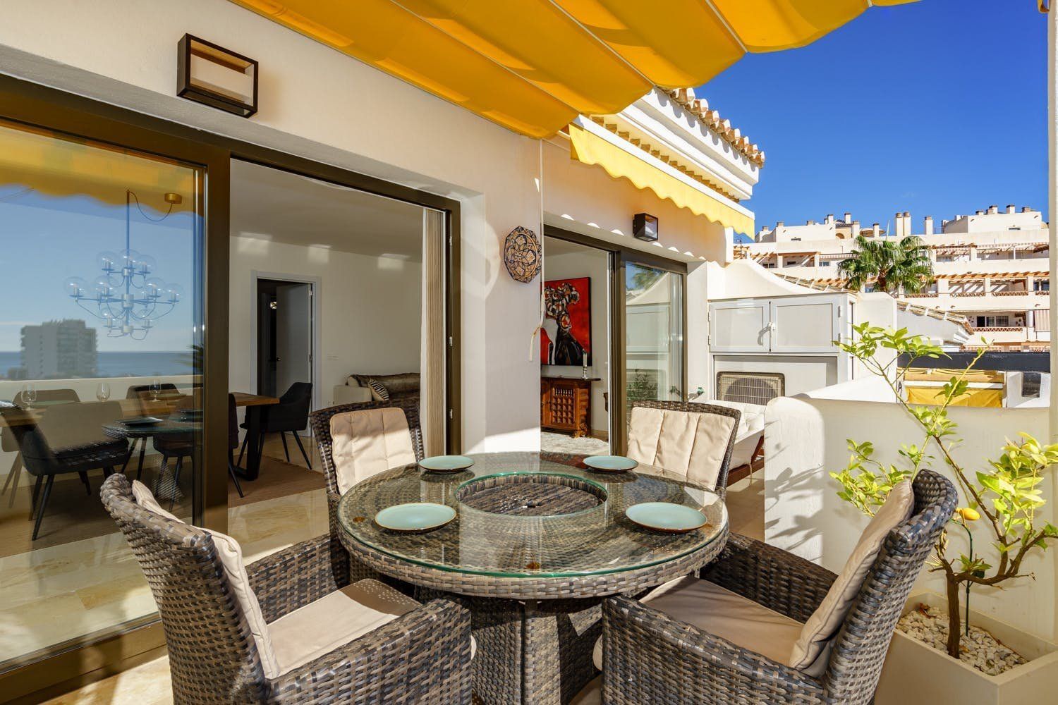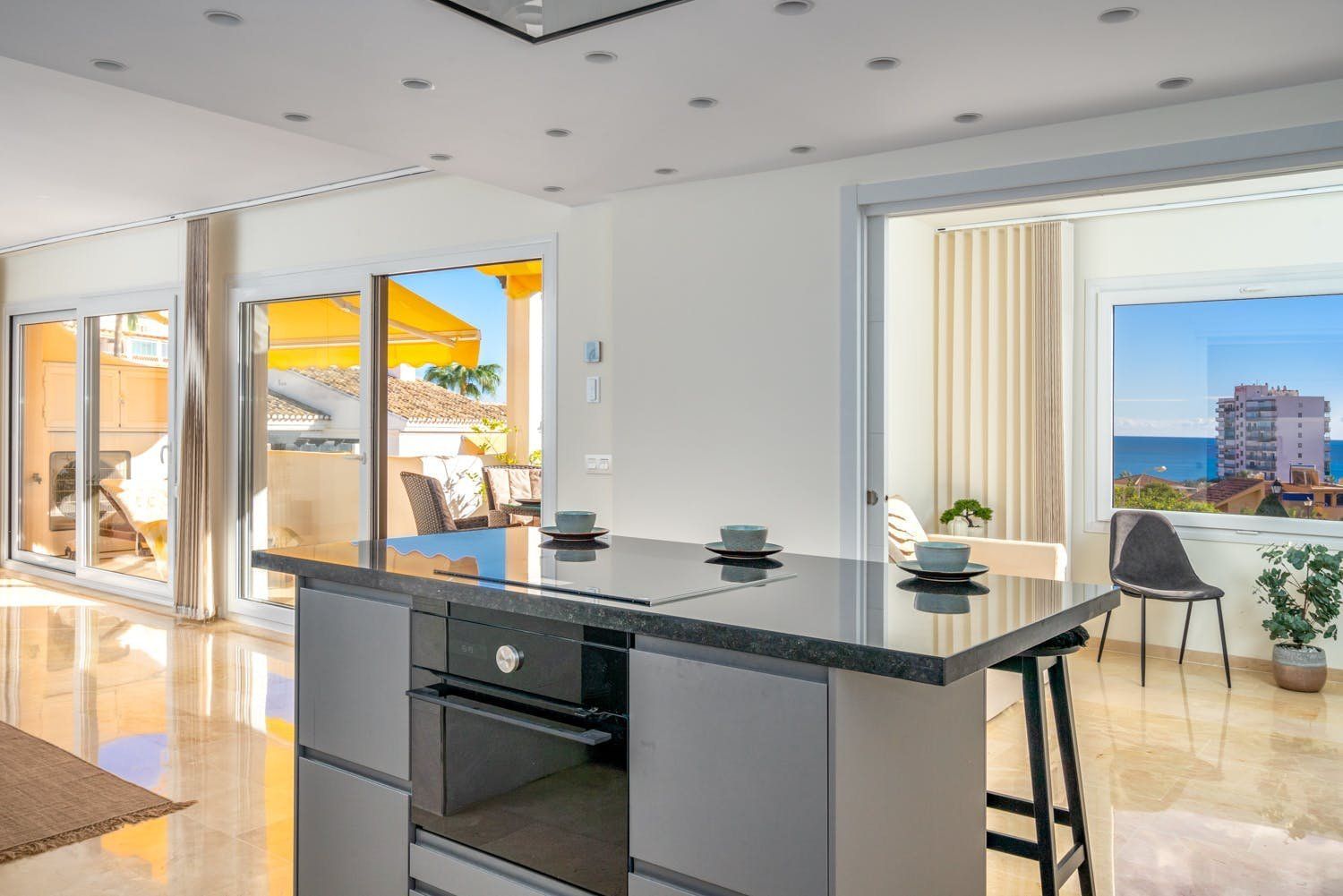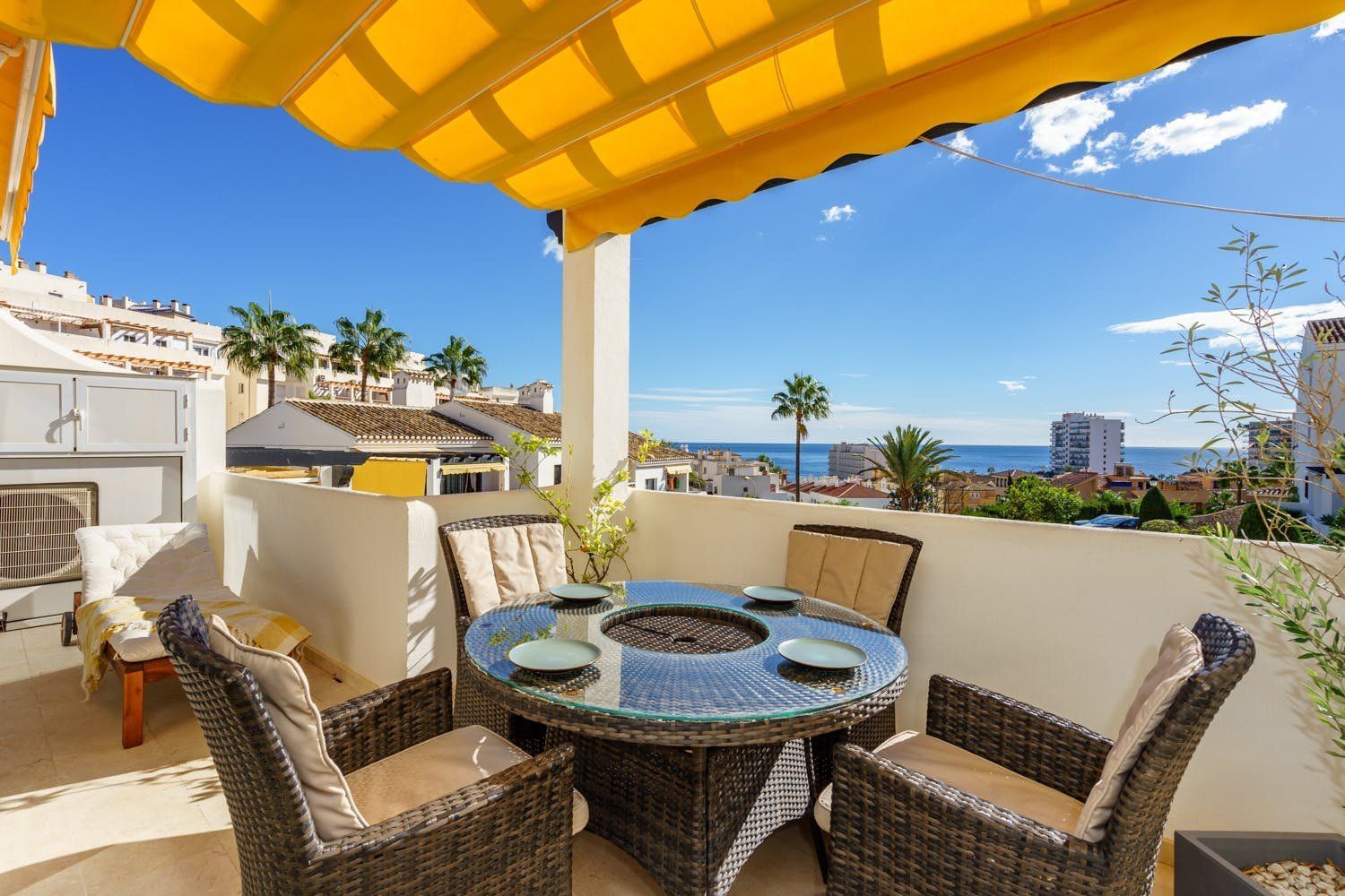 This apartment is in one of the best areas of Benalmadena, just a three-minute walk from the soft-sand beach. With a private roof terrace, guests can enjoy stunning views of the sea and mountains. You’ll find all the essentials inside – a fully-equipped kitchen and open living room. The added bonus is the fitness room with a private sauna and treadmill that overlooks the mountains of Benalmadena and Mijas. Plus, there’s a shared swimming pool downstairs for those hot summer days.