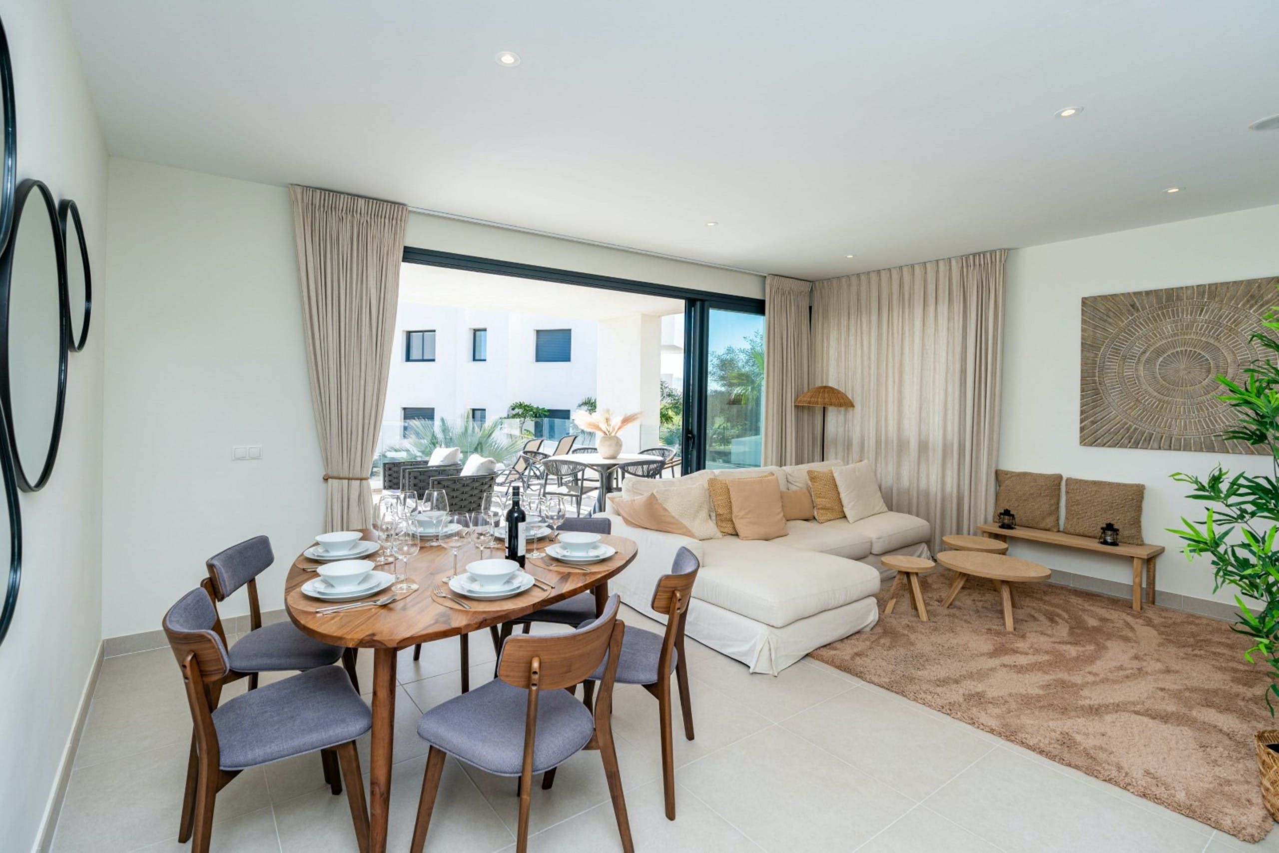 Whether you’re staying as a family or a group of friends, this apartment on the grounds of a golf course is the ideal place to spend quality time together. The private terrace, with views of the Mediterranean Sea, is furnished for outdoor dining. And when you need to cool off, make a beeline for the communal swimming pool. Plus, there’s a children’s area for the little ones to let off some steam. If you’d like to explore the wider area, Arroyo Vaquero Beach and the heart of Estepona are a short car ride away.
