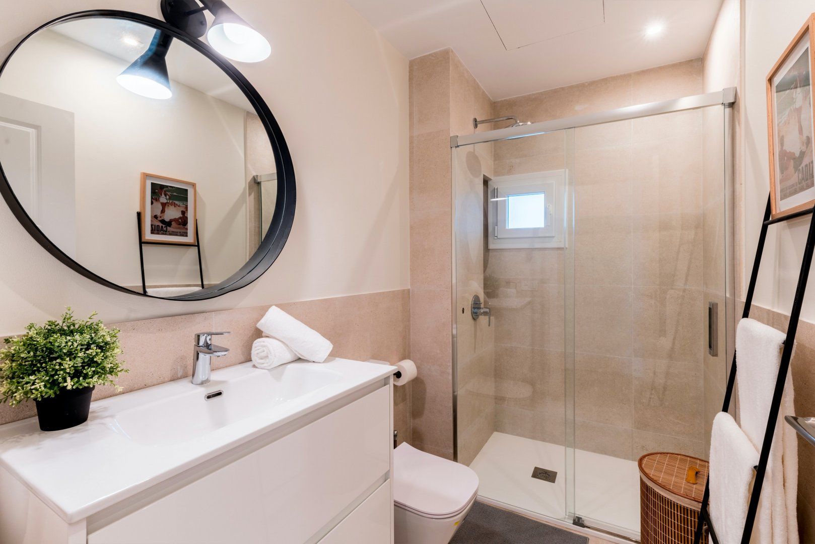 This uniquely designed home is the perfect place to reside during your day in sunny Spain. The living space is brightened up by the daylight pouring in through the Juliet balcony doors, lighting up the contemporary art that adorns the walls. Snuggle up on the sofa to watch a movie on the TV or curl up on one of the armchairs with a brand new book – why not crack open a sumptuous bottle of wine too?