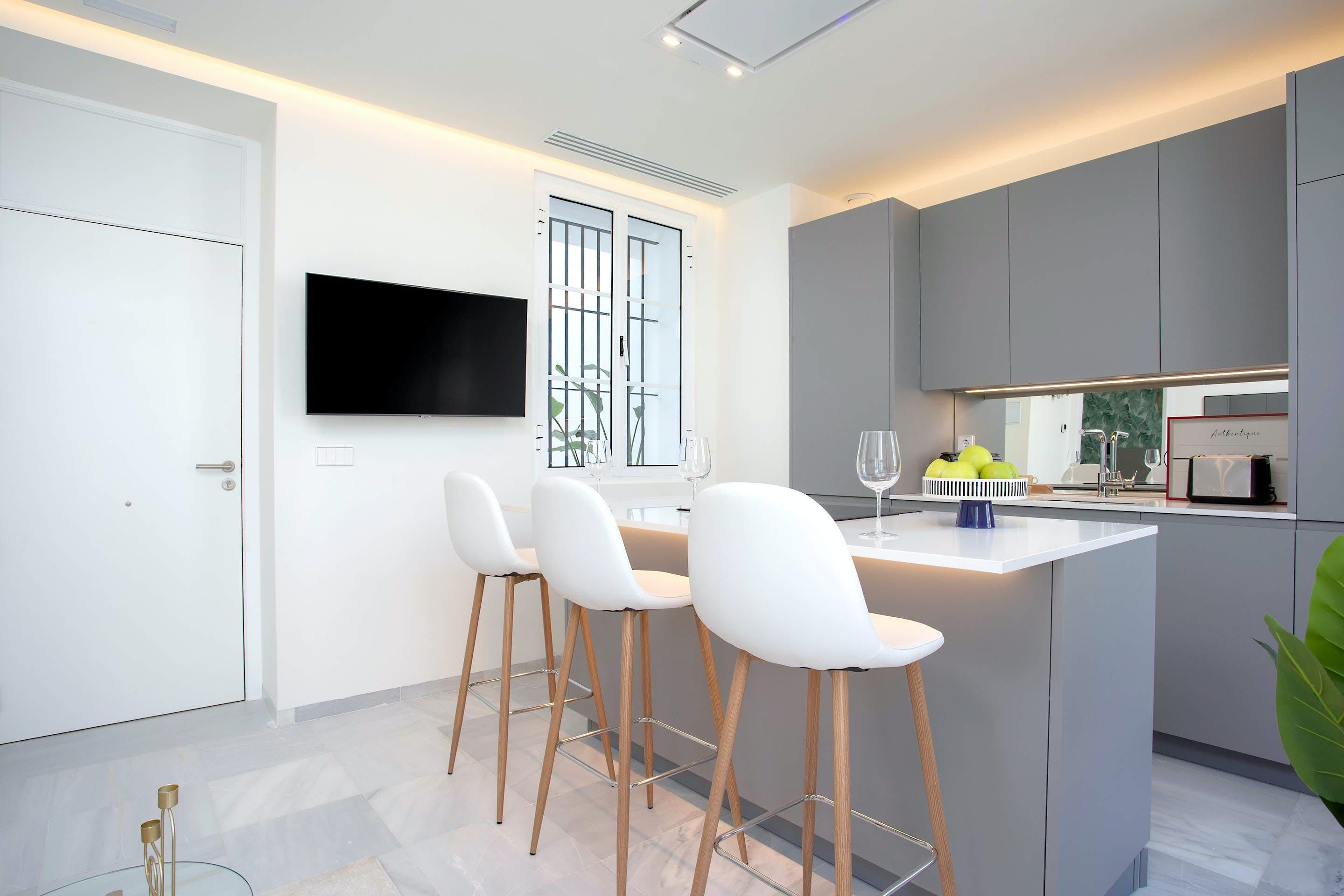 Splendid building that opens into a hall with the charm of a classic Cadiz patio. Adorned with elegant palm trees and bathed in natural light, this patio envelops you in a quiet and cozy atmosphere. Ascending to the third floor, our luxurious and bright apartment with views of Calle Compañía is revealed. The spacious living room with a king size sofa bed is perfect for relaxing after exploration. Two charming exterior balconies flood the space with natural light and offer panoramic city views. The open concept kitchen invites guests to create culinary delights. The majestic master bedroom promises nights of restful sleep, while the full bathroom creates a serene atmosphere. On the fourth floor, the communal terrace with stunning cathedral views awaits you, offering relaxation in the Cadiz sun. Free laundry facilities add a practical touch to this luxurious experience.