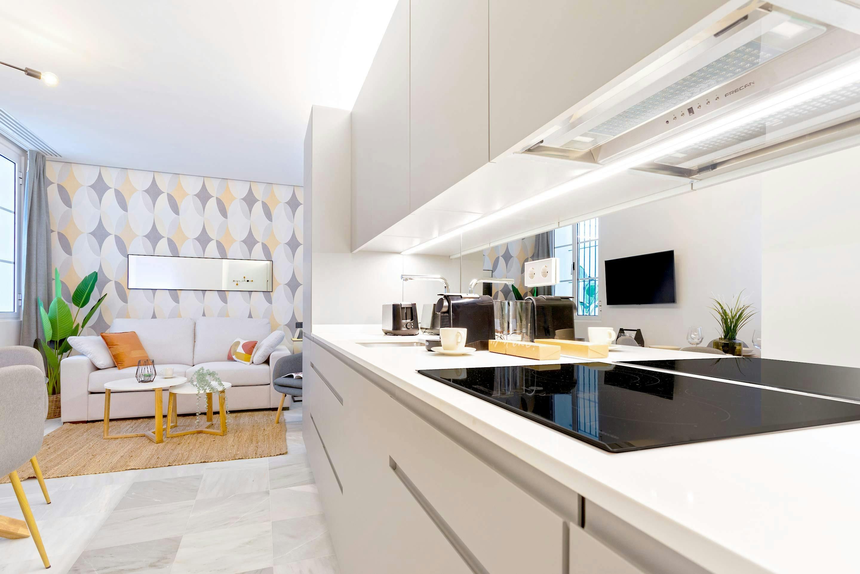 Splendid building that opens up to a hallway with the charm of a classic Cadiz courtyard. Adorned with elegant palm trees and bathed in natural light, which filters through the beautiful glass dome of the upper terrace, this courtyard envelops guests in a tranquil and welcoming ambiance. The interior apartment features a gallery of an interior patio for shared breakfasts, a master bedroom with a king-size bed and comfortable armchair, a modern open kitchen connected to the living room adorned with carefully selected furniture, and a complete bathroom with exterior ventilation to maintain freshness. On the fourth floor, guests can enjoy breathtaking seascapes from the communal terrace equipped with seating areas, sun loungers, and a shower area. Complimentary laundry facilities add practicality to this luxurious accommodation experience.