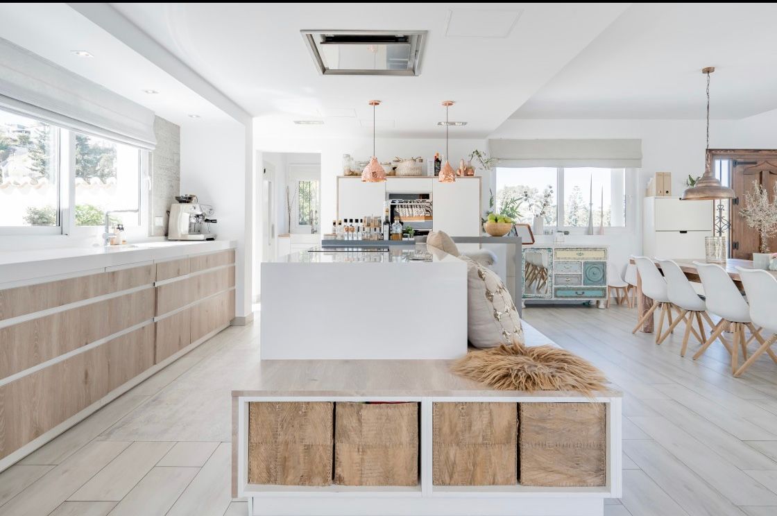 Inside, it’s a mix of Scandi-minimalism and boho charm. Pristine white walls keep things cool and breezy in the open living area and there’s something utterly delightful about the faux-fur-topped stools at the raw wood breakfast bar in the kitchen. Bedrooms reflect the same attention to design detail, but the master really takes the biscuit with a double-height ceiling, and suspended egg chair by glass sliding doors. From here you can step out onto your private terrace for a moment’s pause.