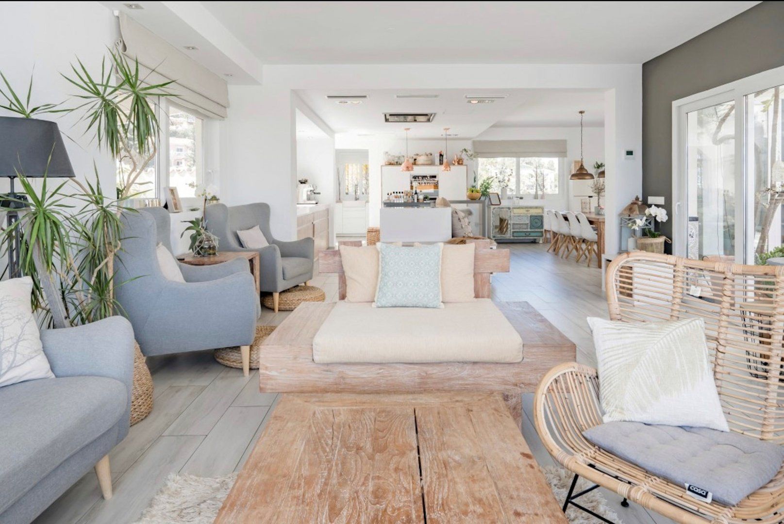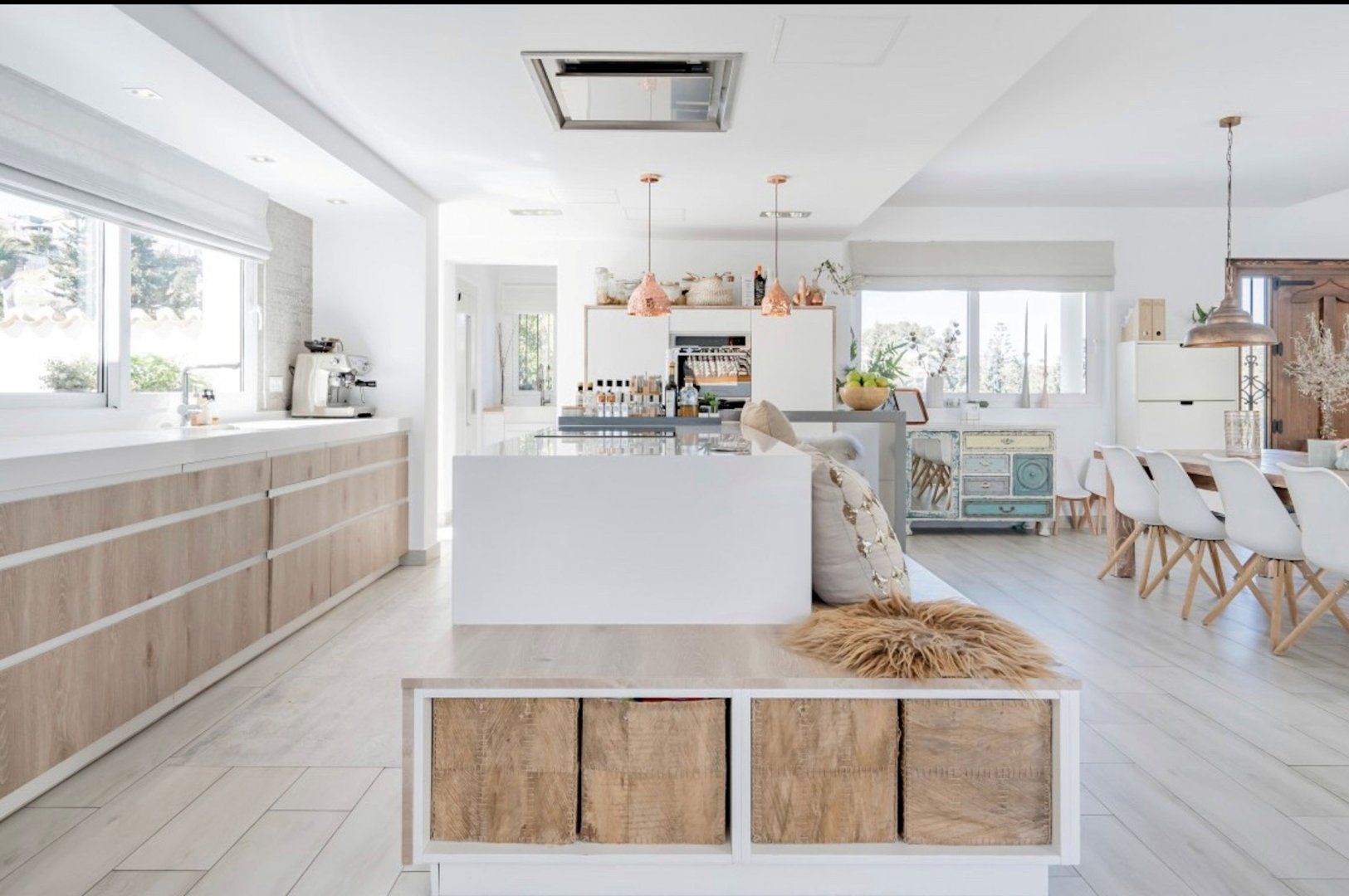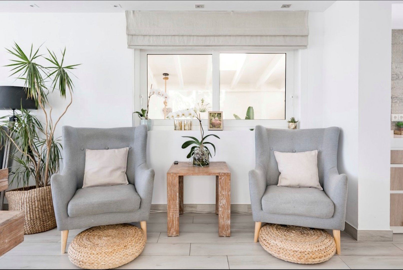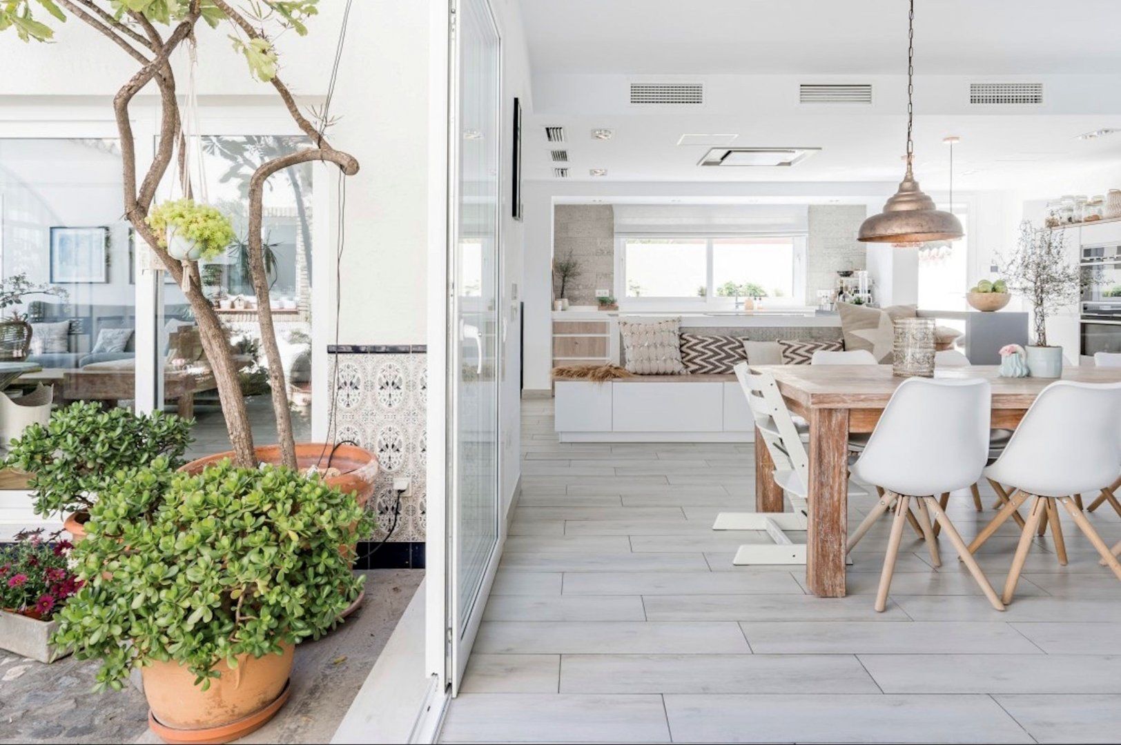 This cool, contemporary home boasts a unique blend of Spanish architecture and Scandinavian décor in the heart of Mijas Costa. Perfect for groups of friends and family, this enviable villa features a light-filled, open plan kitchen, dining and living room – think whitewashed walls, pale wooden floors, hanging lights and indoor plants. Soft, neutral colours, comfortable, modern furnishings, large windows and sliding glass doors which open onto outdoor spaces create a serene space in which to both socialise and relax.