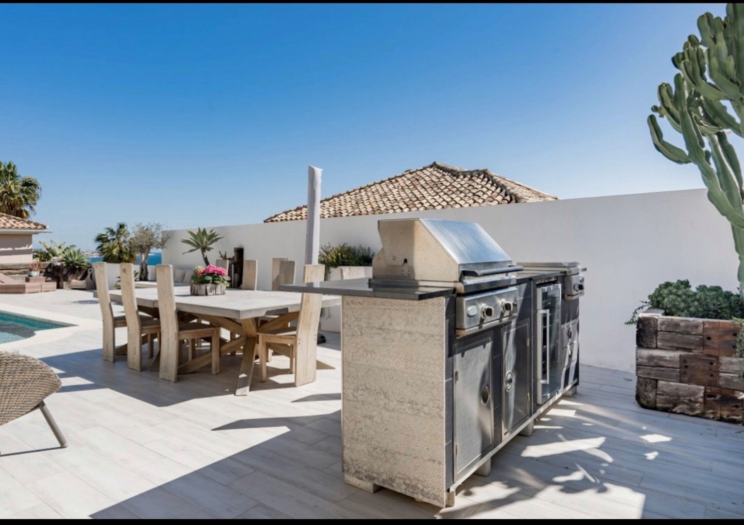 You’ll love this home for its inimitable interiors and glass-fronted seating areas as much as for its outdoor offering and stunning sea views. Spend time lazing on loungers in the sun or luxuriating in your private, outdoor pool. While away the afternoon grilling fresh fish and seafood on the barbecue before dining alfresco beside the pool. If you seek a little seclusion or some peace and quiet, grab a book and sit out in the calming courtyard with a glass of crisp white wine. Alternatively, spend time on the terrifically tiled master bedroom terrace for magnificent Mediterranean views. Indulge in a long, hot soak in the freestanding tub before gathering around the island in the kitchen for a sociable cook off. Round off the day by piling onto the L-shaped leather sofa in in the second living room for movie night.