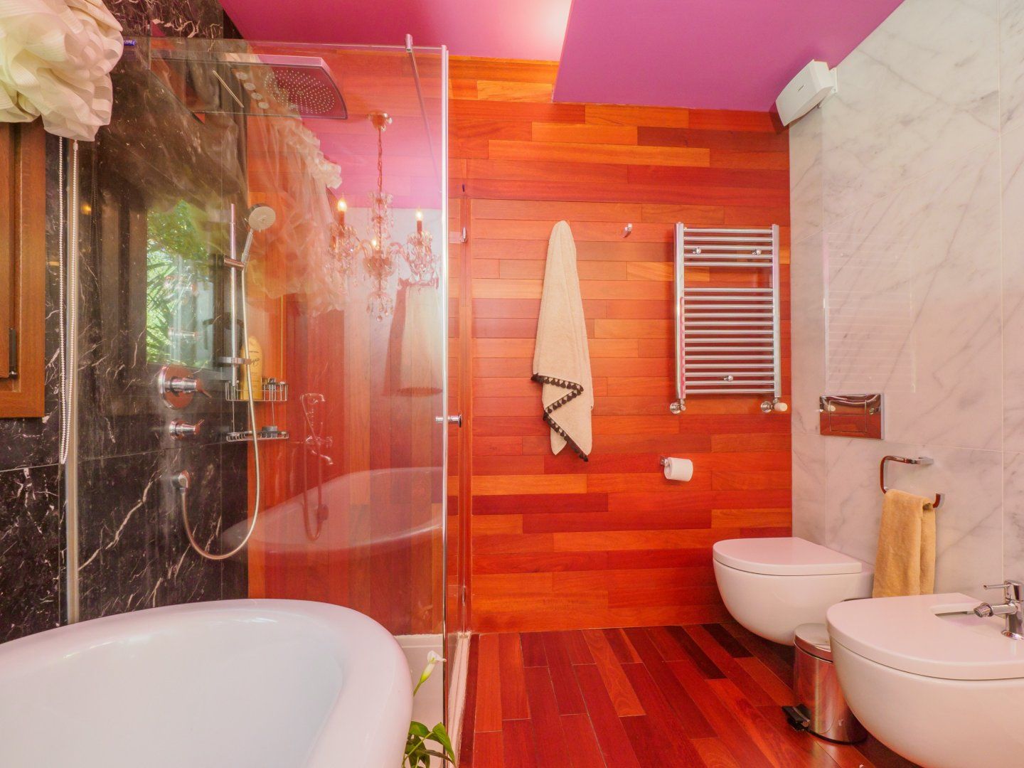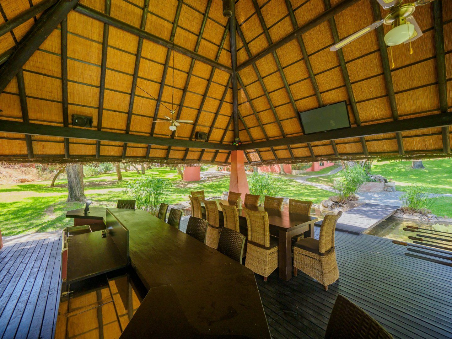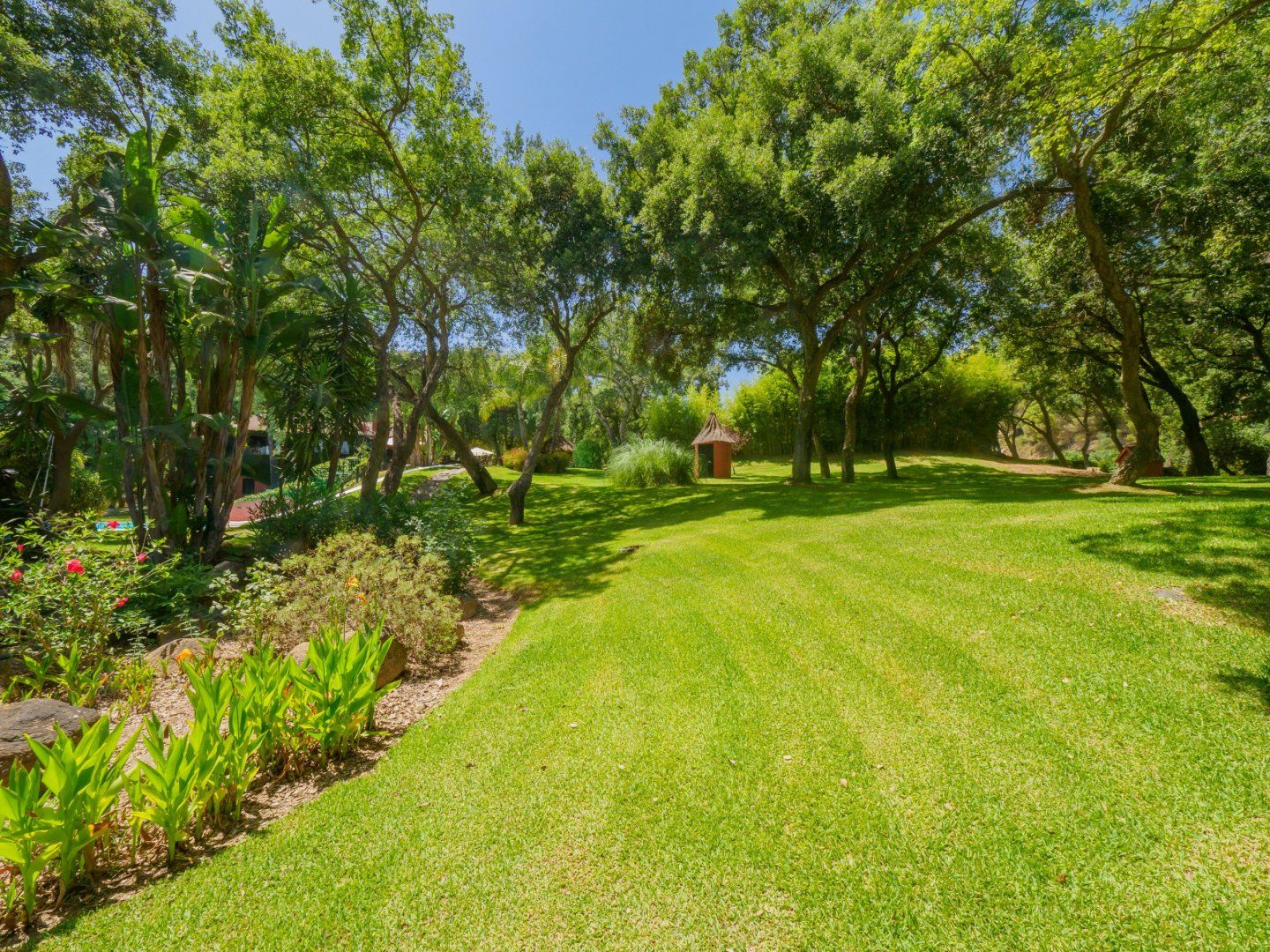 Situated with views overlooking the stunning garden and swimming pool, the apartment offers a truly unique stay amidst nature and its vibrant interiors. Floor-to-ceiling windows frame the garden views like a painting on the wall, meanwhile, pops of fuchsia and flamingo pink create a sparkly main living area dressed in sumptuous furnishings. Regarding meal times here, you'll choose whether to dine in style at the apartment or in the picturesque outdoor communal dining room. Imitating the shape of a Hawaiian shed, this gazebo dining spot offers a waterside hangout for the group to enjoy as one.