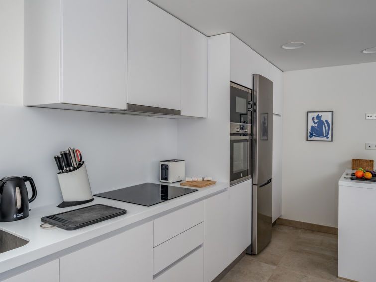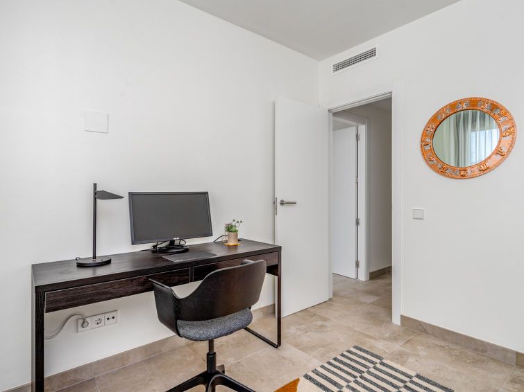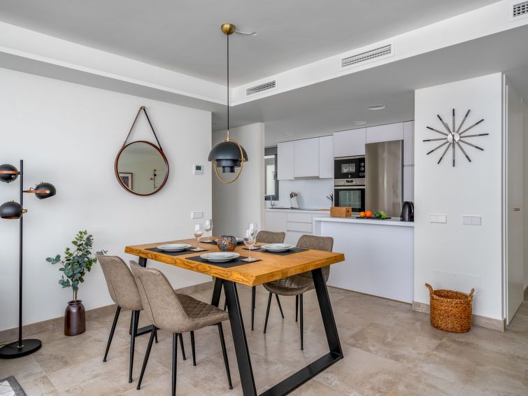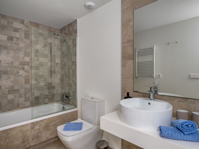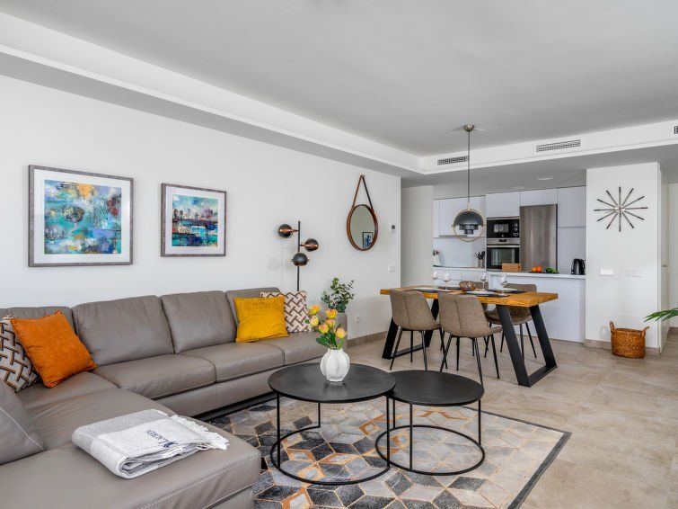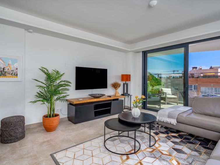 "Estepona Roof Top View 5", 4-room apartment 100 m2 on 5th floor, south-west facing position. Modern and stylish furnishings: living/dining room with digital TV, air conditioning and forced-air heating. Exit to the terrace. 1 room with 1 french bed (180 cm, length 200 cm), bath/WC and double hand-basin (private) air conditioning and forced-air heating.