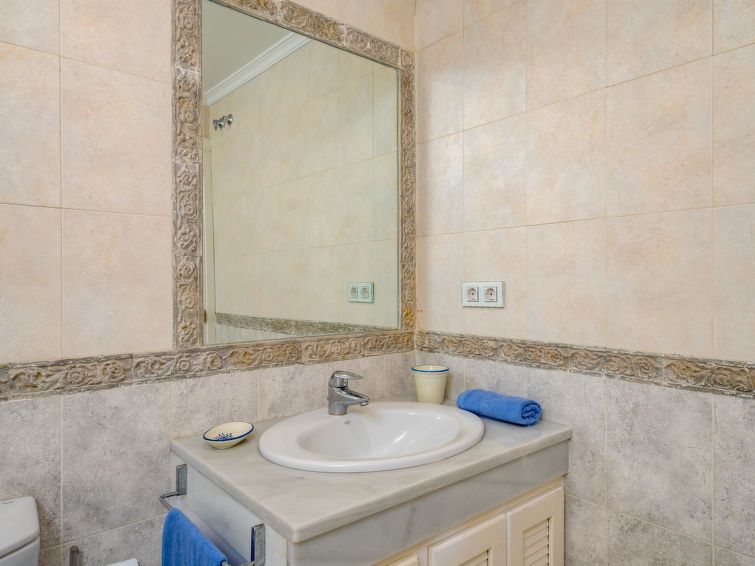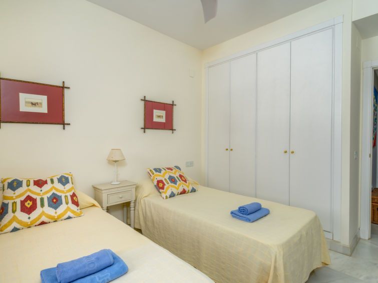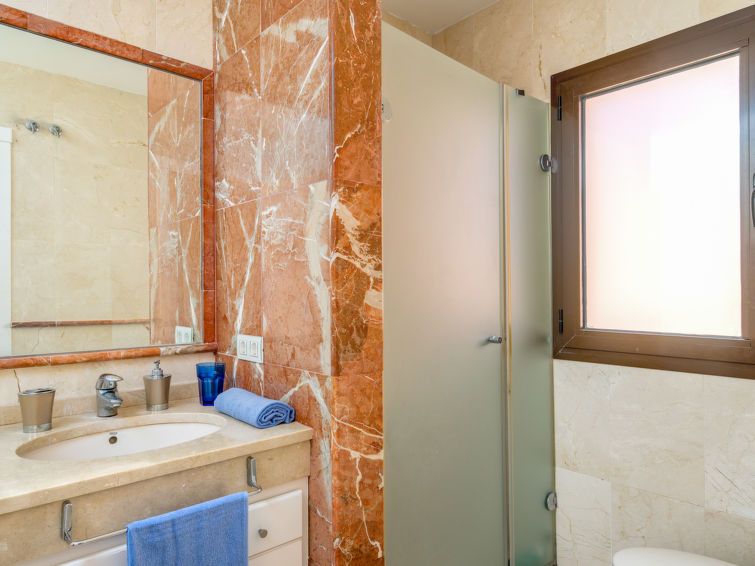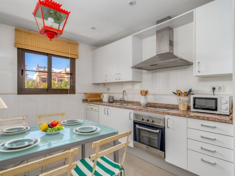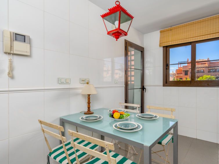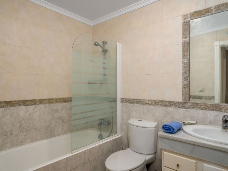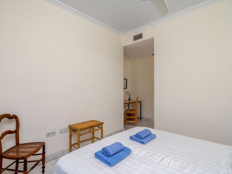 3-room apartment 100 m2 on 1st floor. Comfortable and cosy furnishings: living/dining room with digital TV. Exit to the terrace. 1 room with 2 beds (90 cm, length 190 cm). 1 room with 1 french bed (160 cm, length 200 cm), bath/shower/bidet/WC. Kitchen (oven, dishwasher, 4 ceramic glass hob hotplates, toaster, kettle, microwave, freezer) with dining table.