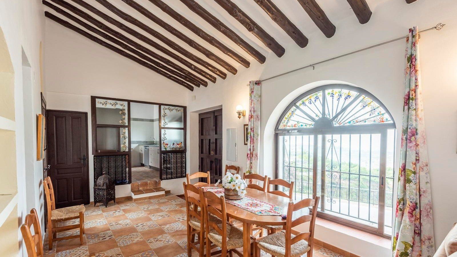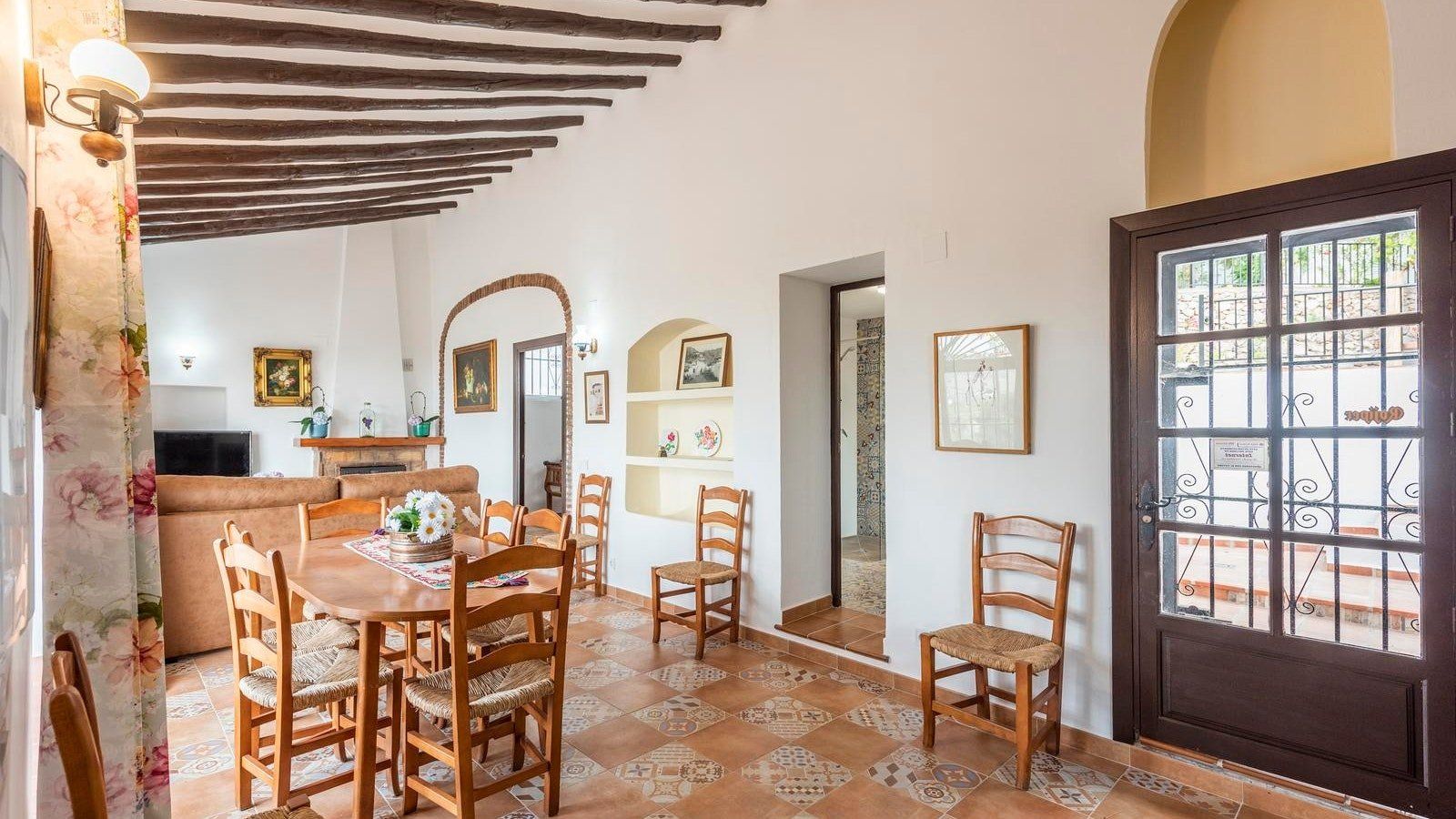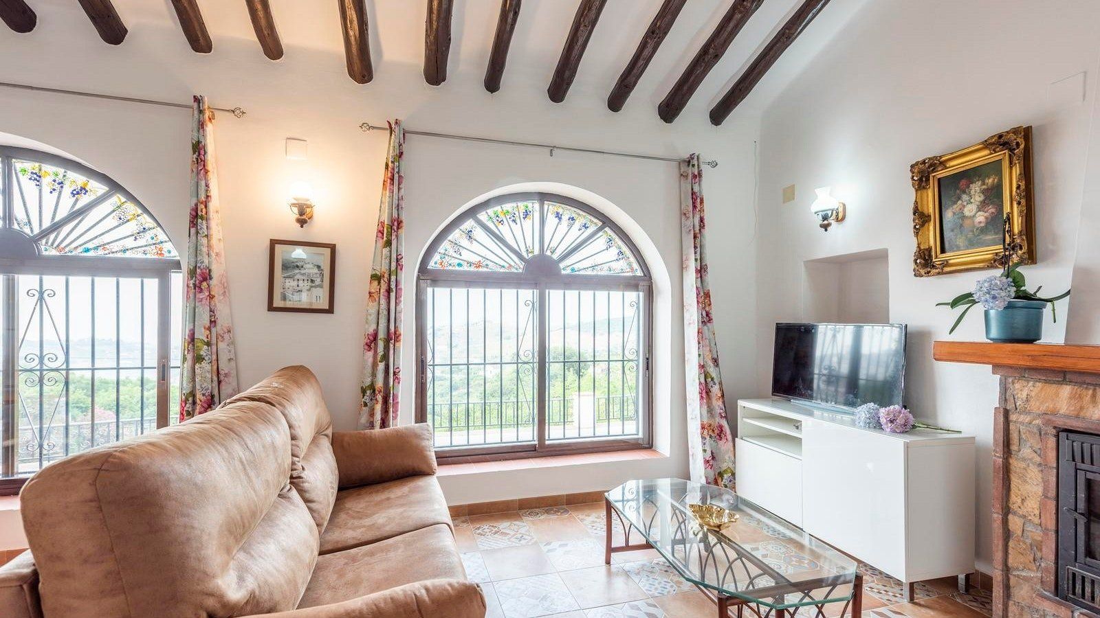 Tucked into the hillside, gazing lovingly out over Frigiliana, this charming villa is a welcoming, classical Spanish retreat. Inside, the home is bathed in natural light courtesy of the generous arched windows – which we love, by the way, with the shape and floral decoration adding so much character to the living area. White walls, dark wooden beams and mosaic tiles, so befitting of the local area, run through the remainder of the inside space, giving the home a personality of its own. Picture cosy evenings spent here, the fire crackling and casting an amber glow around the room as you get stuck into a good book, tucked up on the comfortable leather sofa.