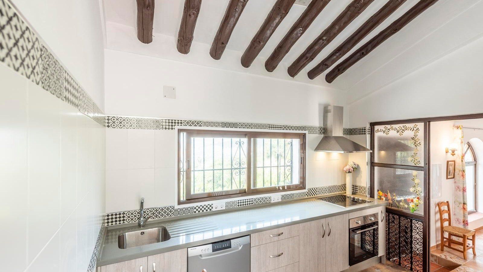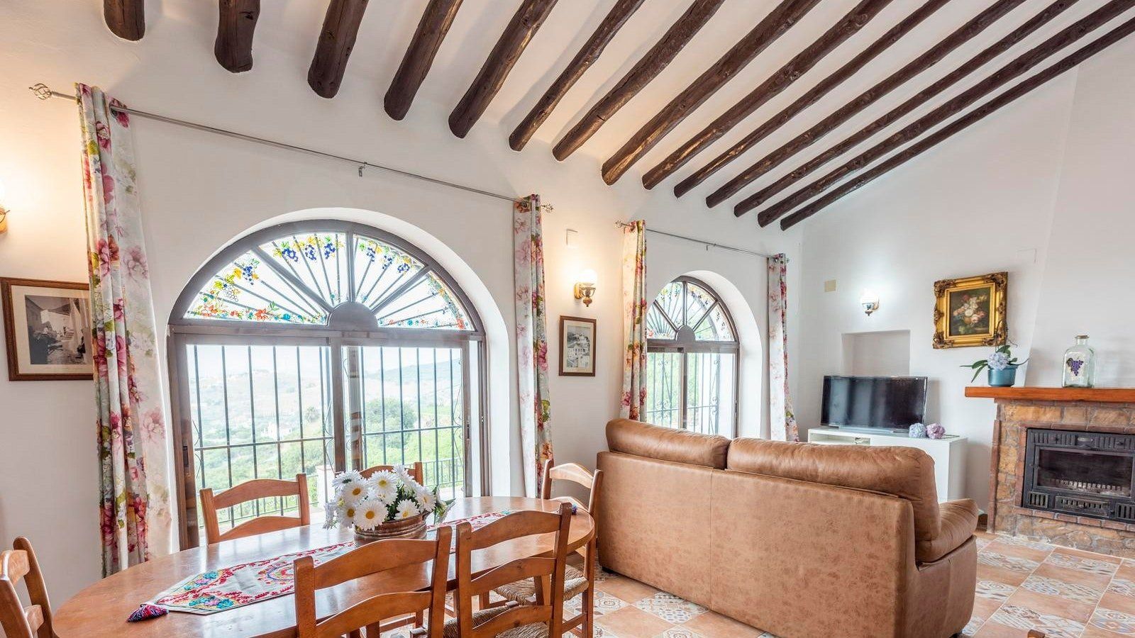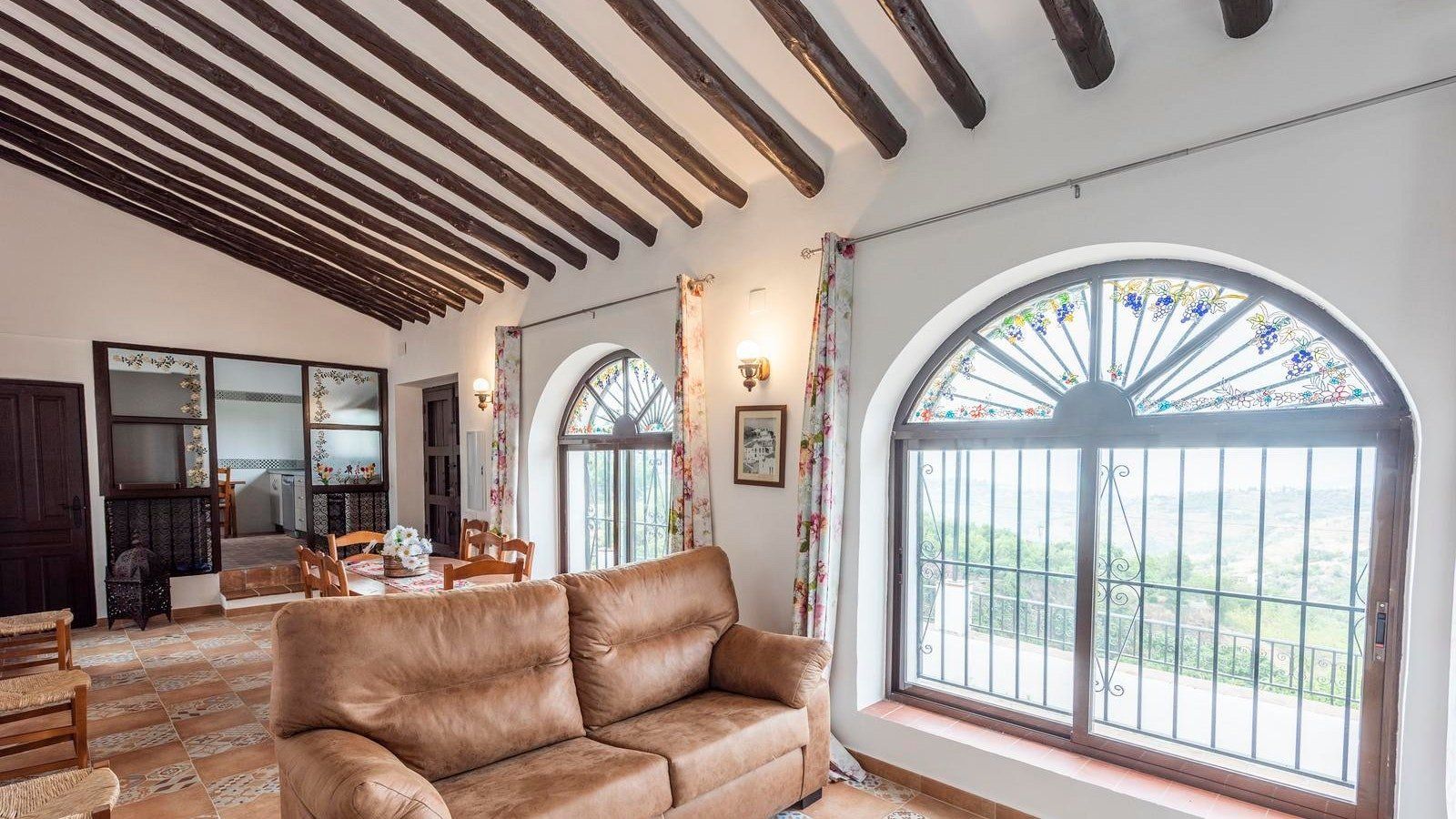 Tucked into the hillside, gazing lovingly out over Frigiliana, this charming villa is a welcoming, classical Spanish retreat. Inside, the home is bathed in natural light courtesy of the generous arched windows – which we love, by the way, with the shape and floral decoration adding so much character to the living area. White walls, dark wooden beams and mosaic tiles, so befitting of the local area, run through the remainder of the inside space, giving the home a personality of its own. Picture cosy evenings spent here, the fire crackling and casting an amber glow around the room as you get stuck into a good book, tucked up on the comfortable leather sofa.