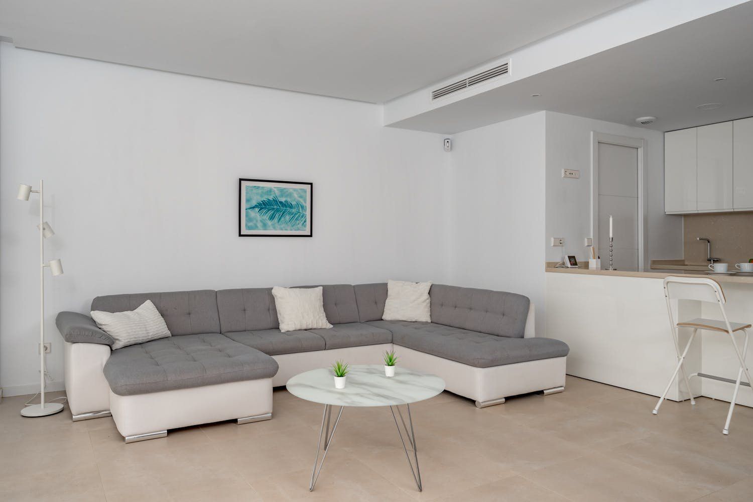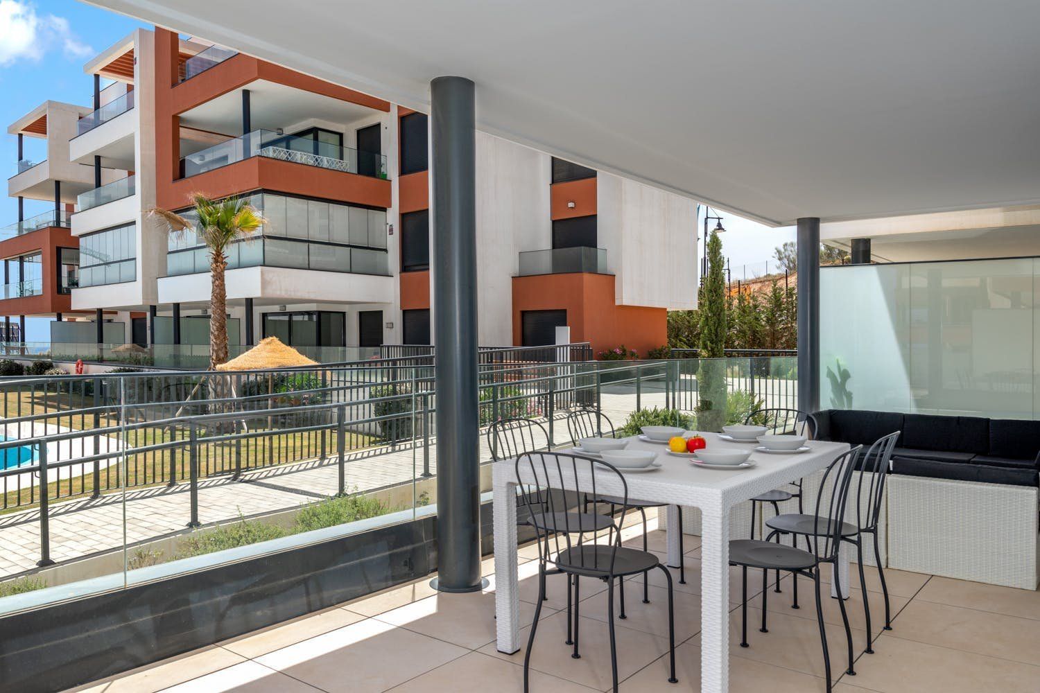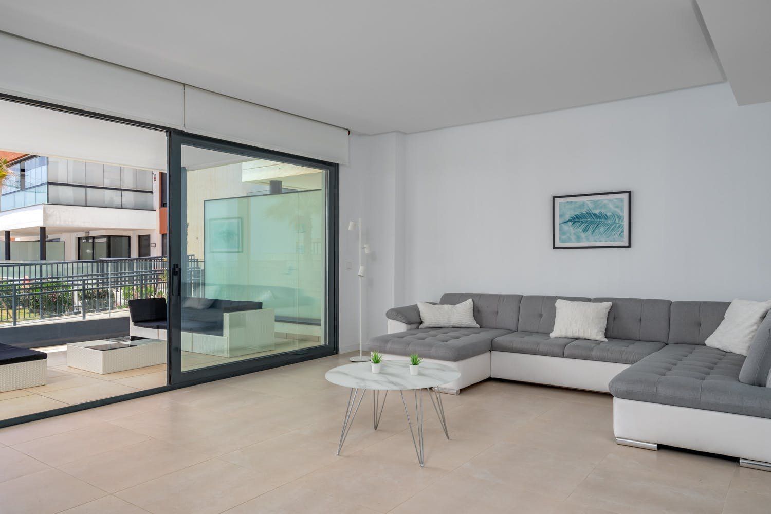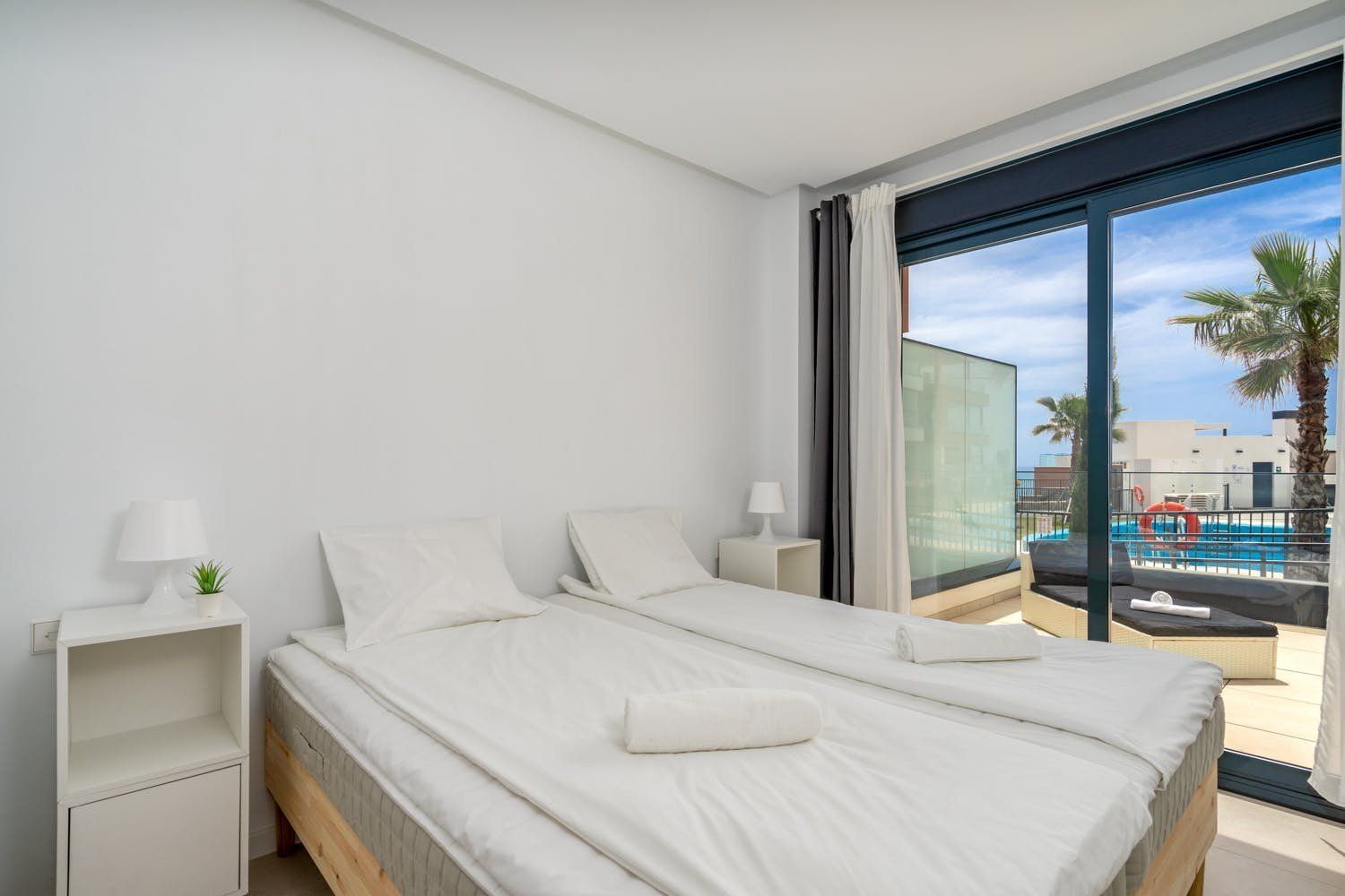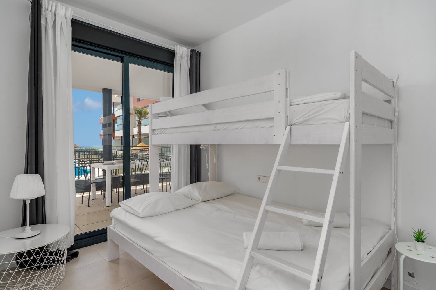 Just a short walk from the beach and seafront promenade, this apartment is the ideal sunny getaway. Open the sliding doors and let the sun and sea air in as you gather on the dining terrace for breakfast. The home can sleep up to five, but three people will be sleeping on a bunk bed in the second bedroom which is only suitable for younger children. Here, you'll also have shared access to the on-site swimming pools and gym, making it ideal for families.
