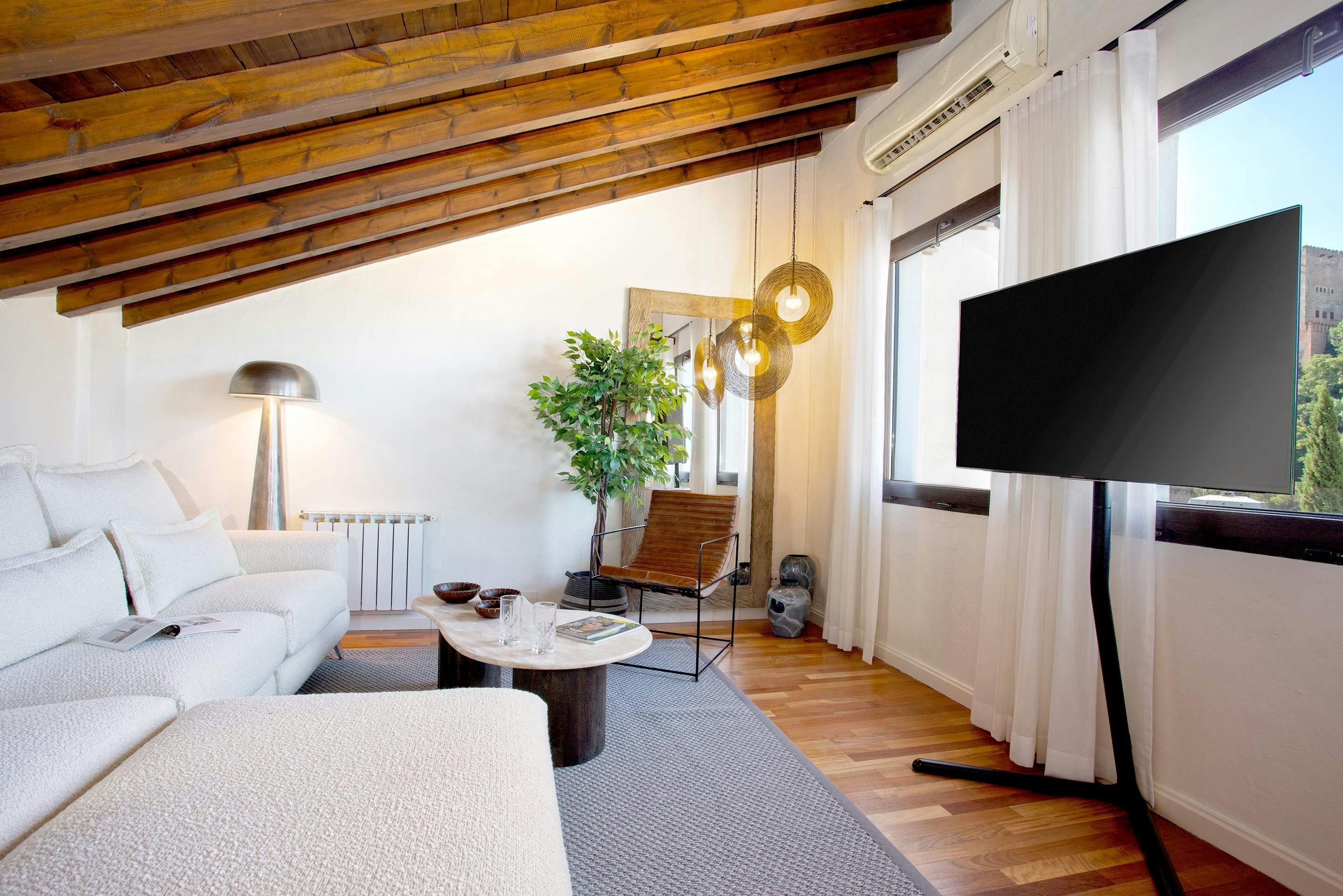 Finally, on the second floor, a main living room awaits you with a comfortable sofa and Smart TV, which opens to a panoramic terrace. From here, you can enjoy spectacular views of the Alhambra.