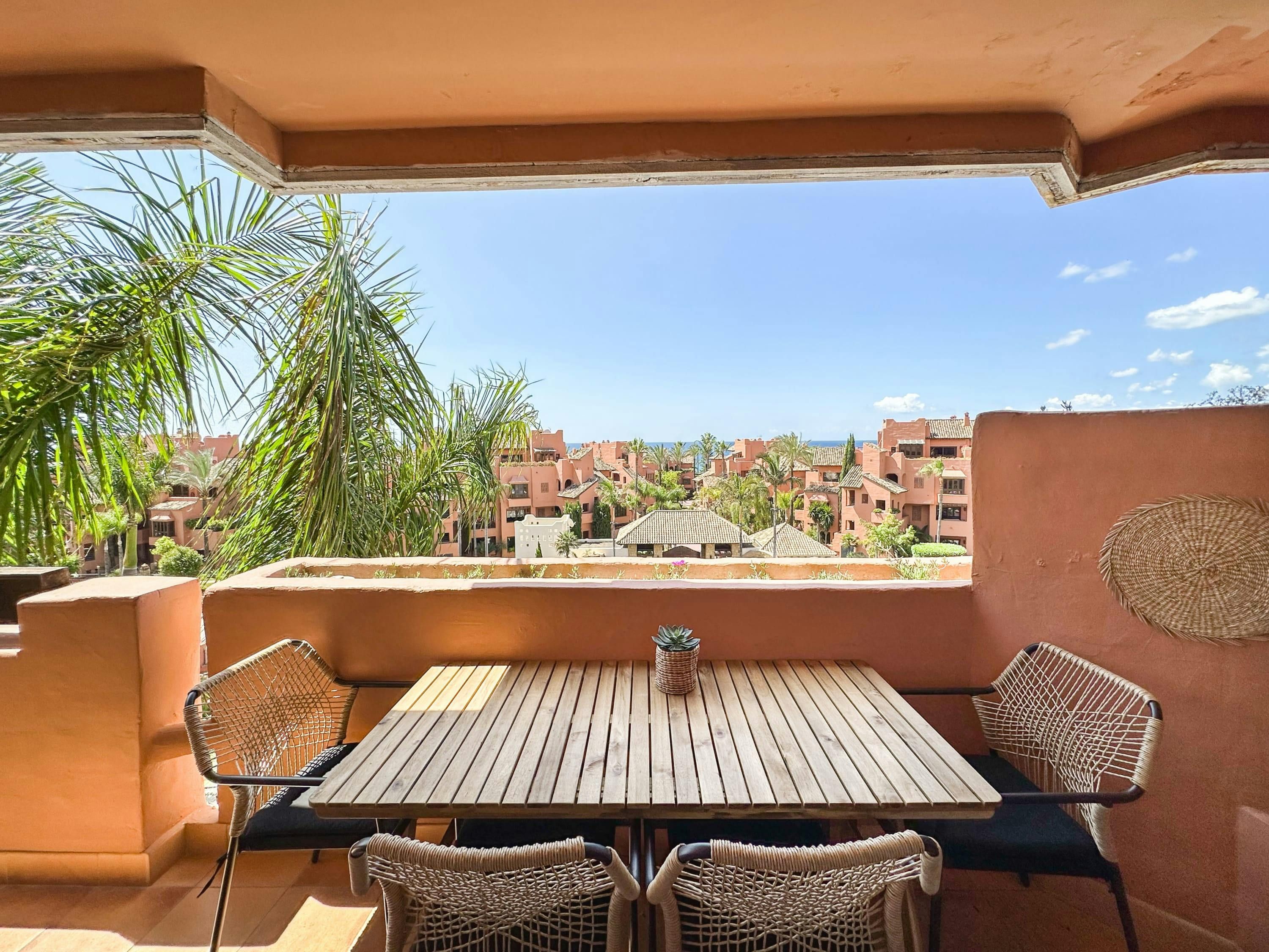 This apartment can be found in a gated beachside complex, in the second line from the beach. You can enjoy sea views from the balcony, which has a cosy seating area. The apartment is simple, with Scandi touches that make it a cool, comfortable place to call home. Best of all, you’ll have access to shared facilities including an outdoor swimming pool, kids’ splash pool, spa, gym and sauna – and in winter, you’ll be able to swim in the heated swimming pool. Puerto Banus is ten minutes away by car, and Estepona is just a six-minute drive.