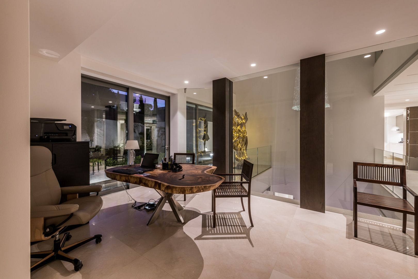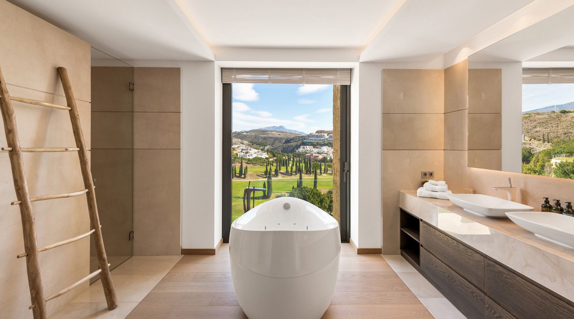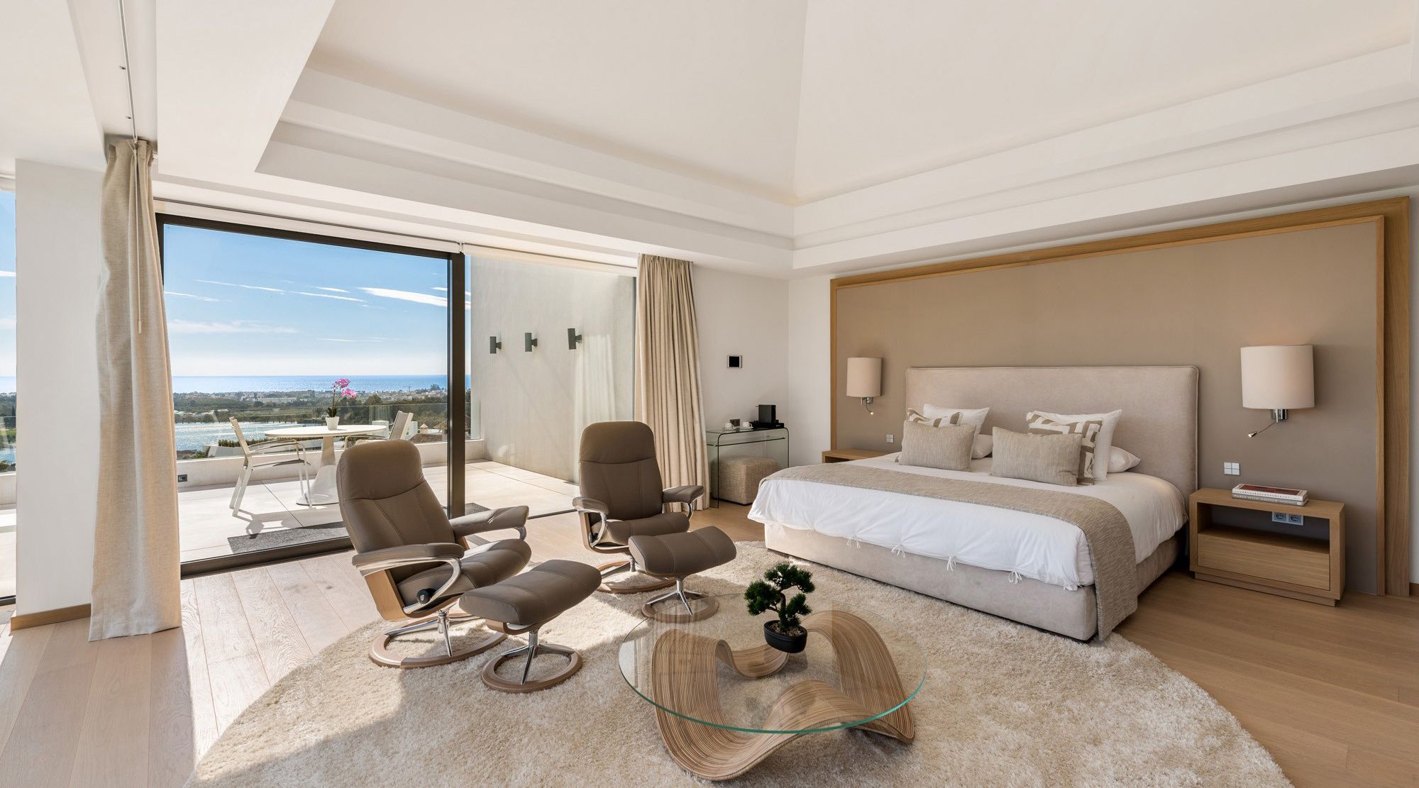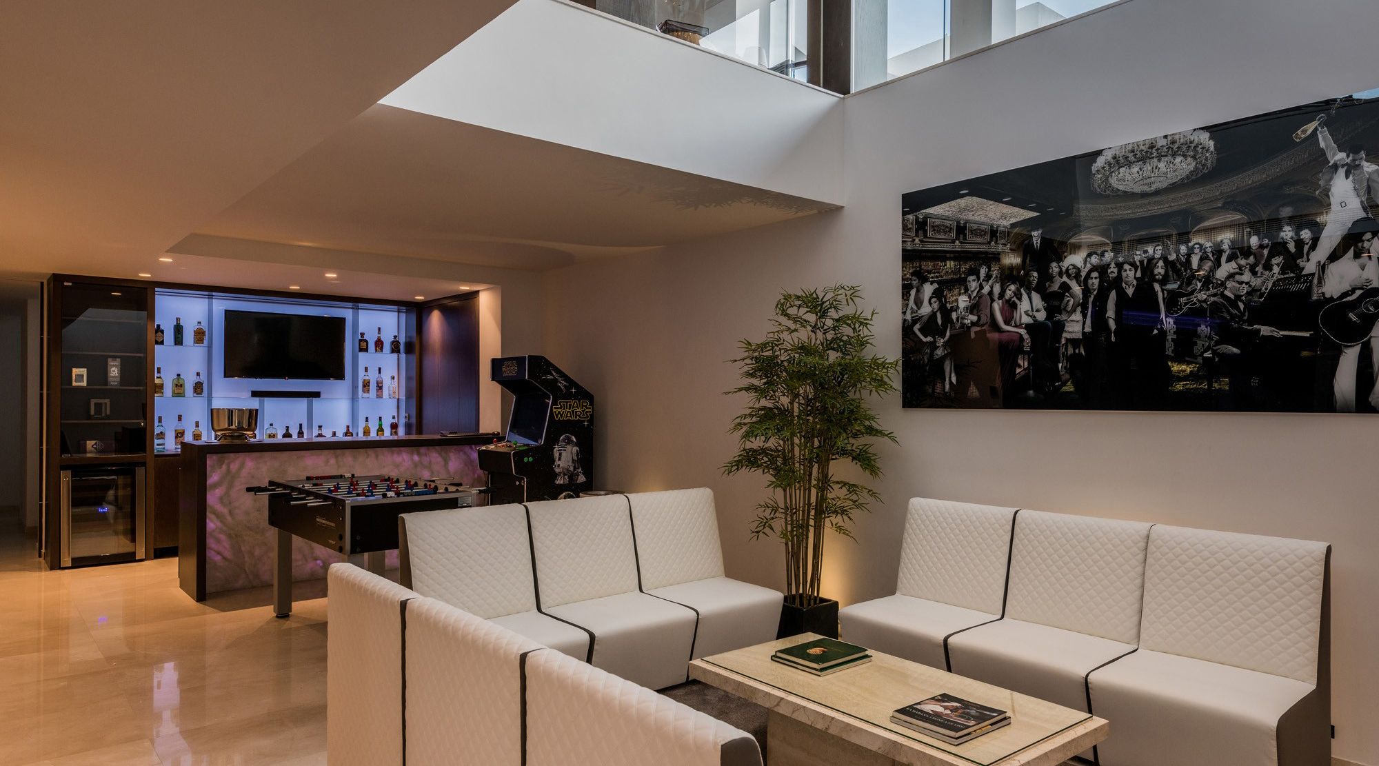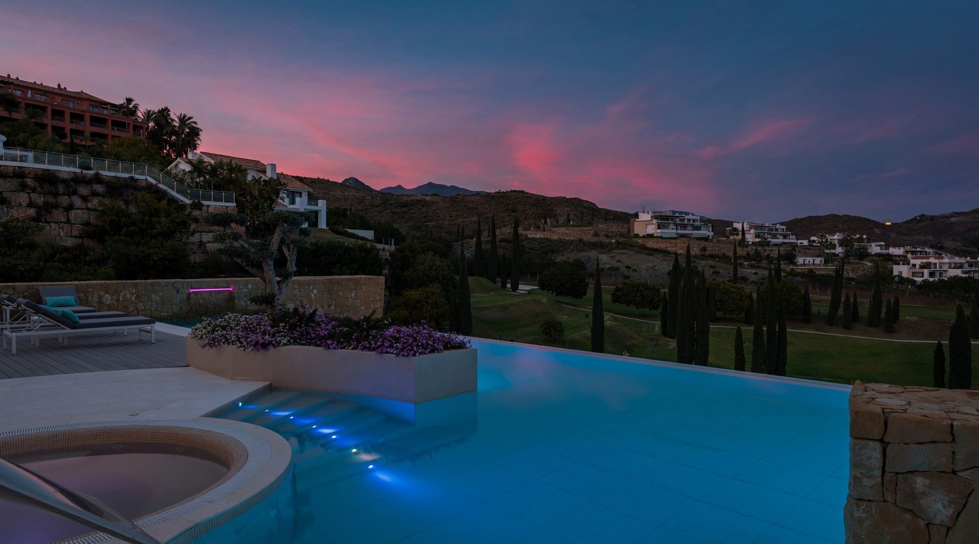 This luxurious villa sits in Los Flamingos in the heart of the Costa del Sol. It’s close to Marbella and Puerto Banus, with access to a golf course. You’ll be able to enjoy views of the golf course as well as the sea and mountains from this dreamy home – the villa features walls of glass that bring the view inside. Outside, you’ll find a private pool, a Jacuzzi, and a pond, in addition to several alfresco seating areas. Inside, the sauna and gym are a wonderful addition, and the multimedia room, arcade game, and PlayStation are sure to appeal to younger guests.