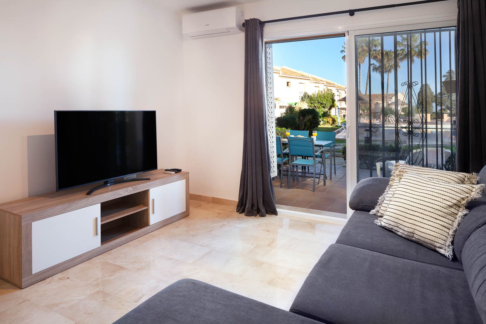 With a plethora of on-site amenities to enjoy including communal pools, a children’s playground, and a tennis court, this apartment is ideal for a family getaway on the Costa del Sol coast. Set close to the pool area, you may hear some noise when you’re enjoying an alfresco meal on the private terrace, and it’s worth noting that two people will sleep on the sofa bed at full occupancy – but it’s a small price to pay for this home’s location. A mere five-minute walk from the beach and with Fuengirola and Marbella easily reachable by car, exploring the local area is a breeze.