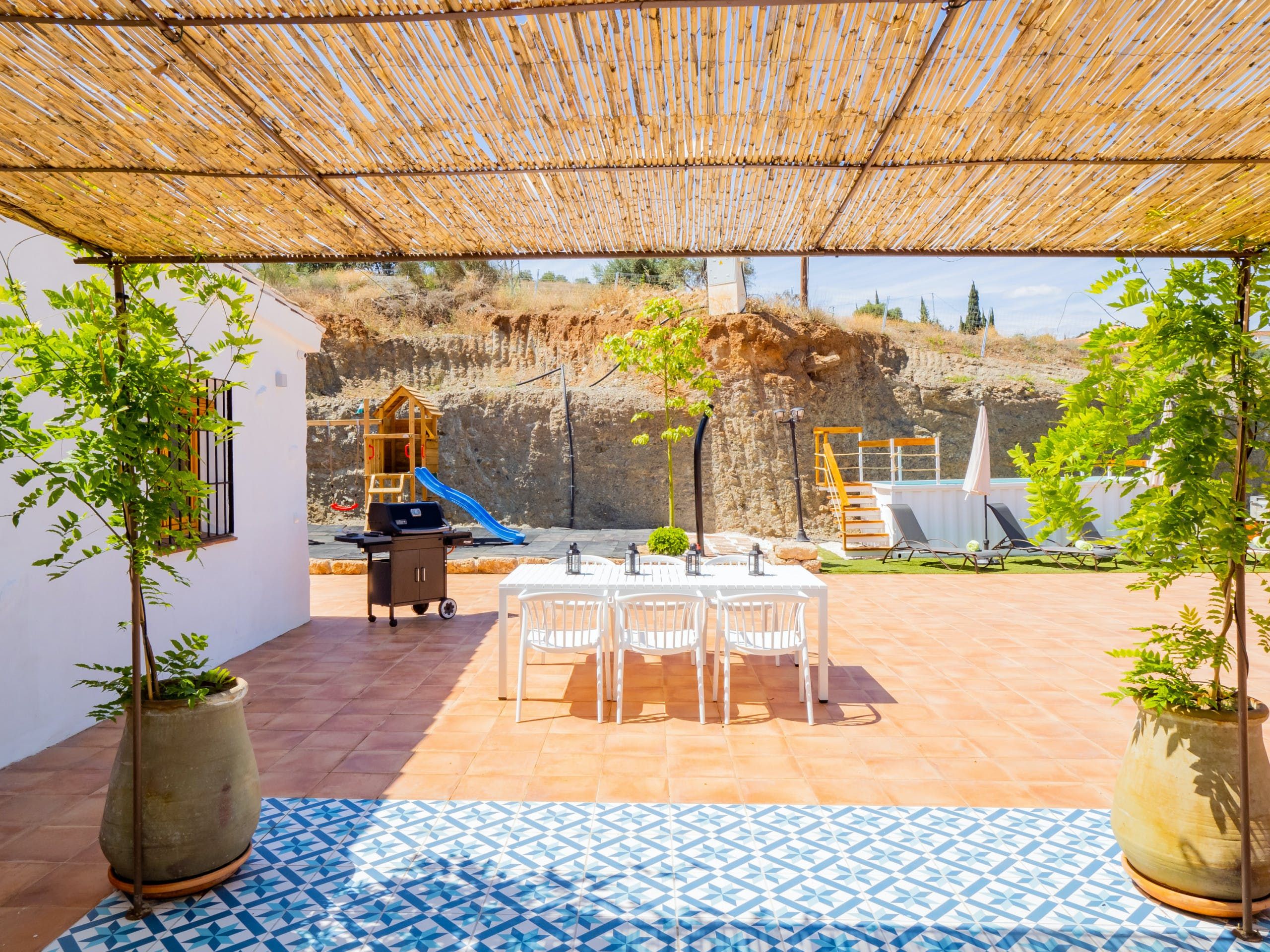 Looking out over mountains and fields, the background of this home is idyllic – perfect for those looking for some seclusion. The interior, while a bit dated, includes everything you need for extended stays. The location is fairly rural, so a car is essential – the nearest restaurant and shops are 3 km away. And yet the kids shouldn't get bored, with the pool and play area sure to keep them occupied. If you fancy heading to the coast, you're 34 km from the centre of Malaga.