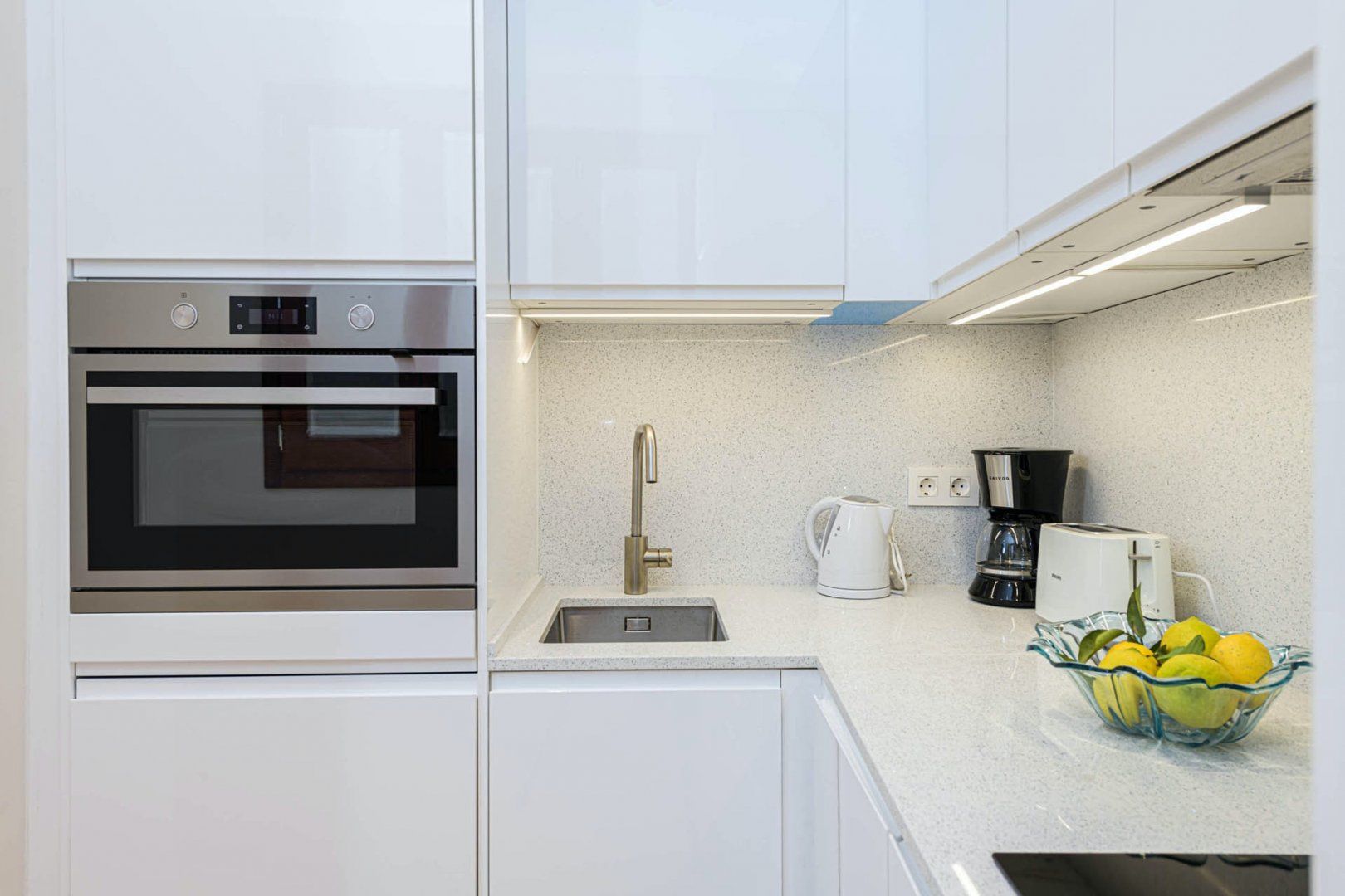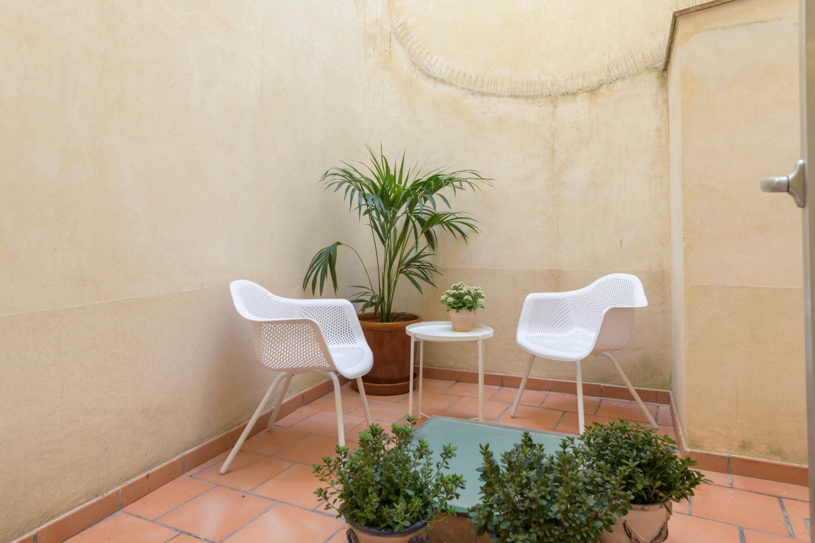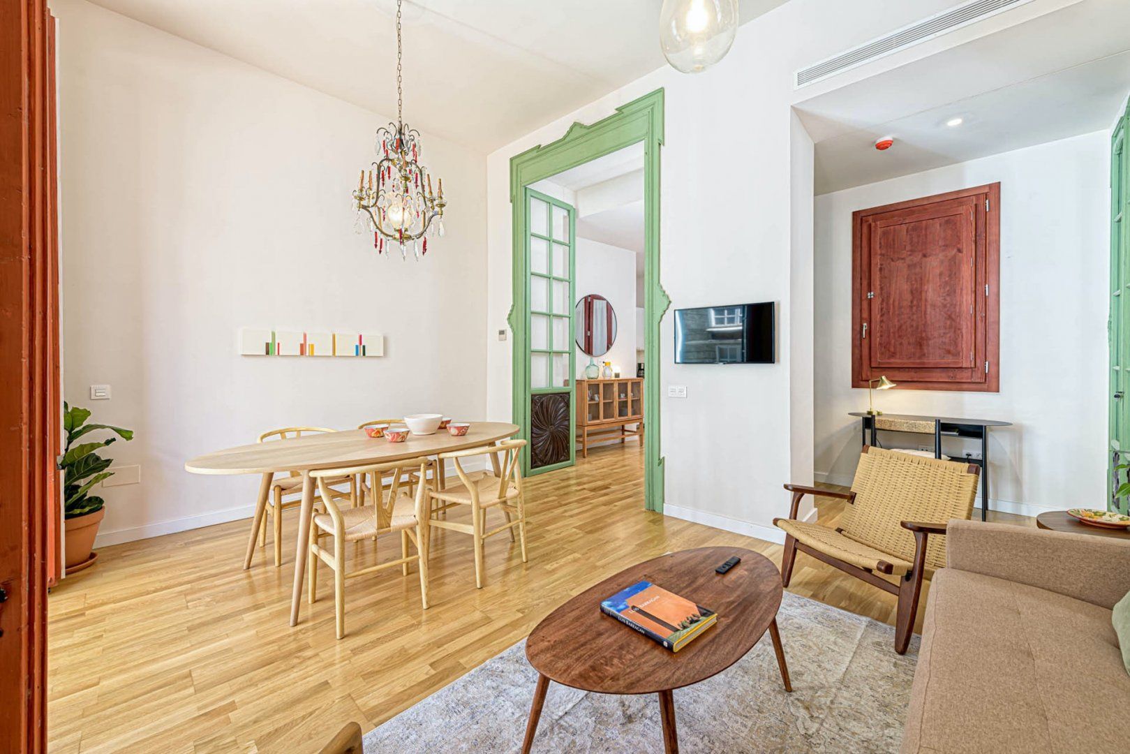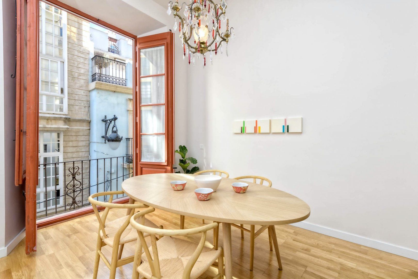Whilst you're out for the day, pick up some supplies to enjoy in the privacy of the apartment. A wooden, circular dining table is a snug spot to share creamy carbonara, complemented by a glass of Rioja wine. On the warmer evenings, open the floor-to-ceiling French balcony doors to feel like you're dining alfresco.