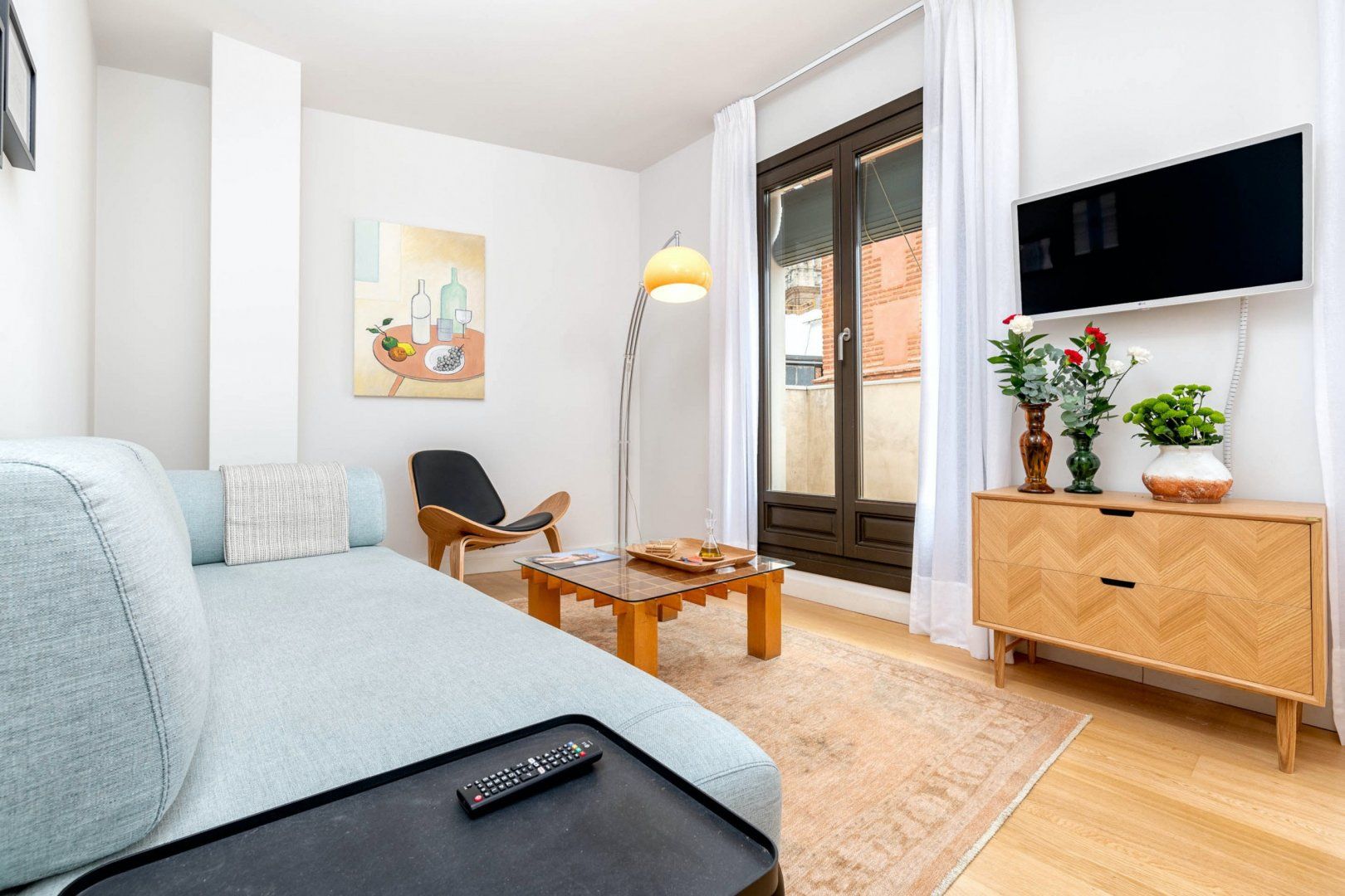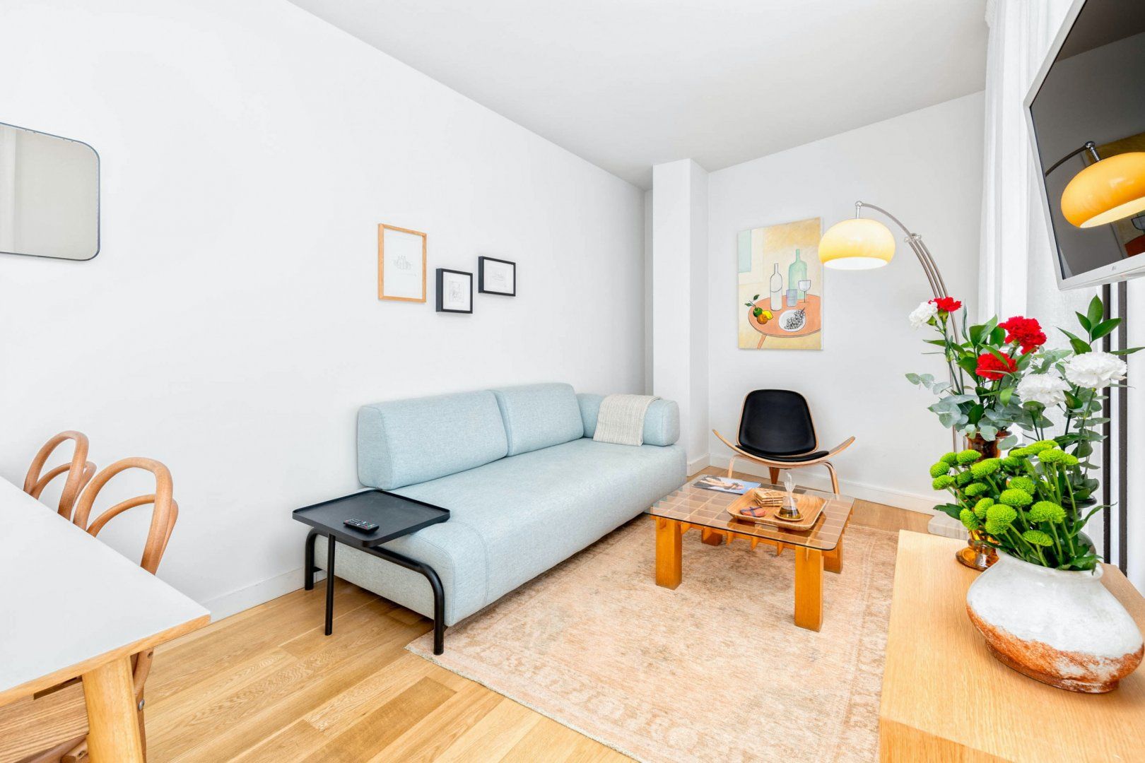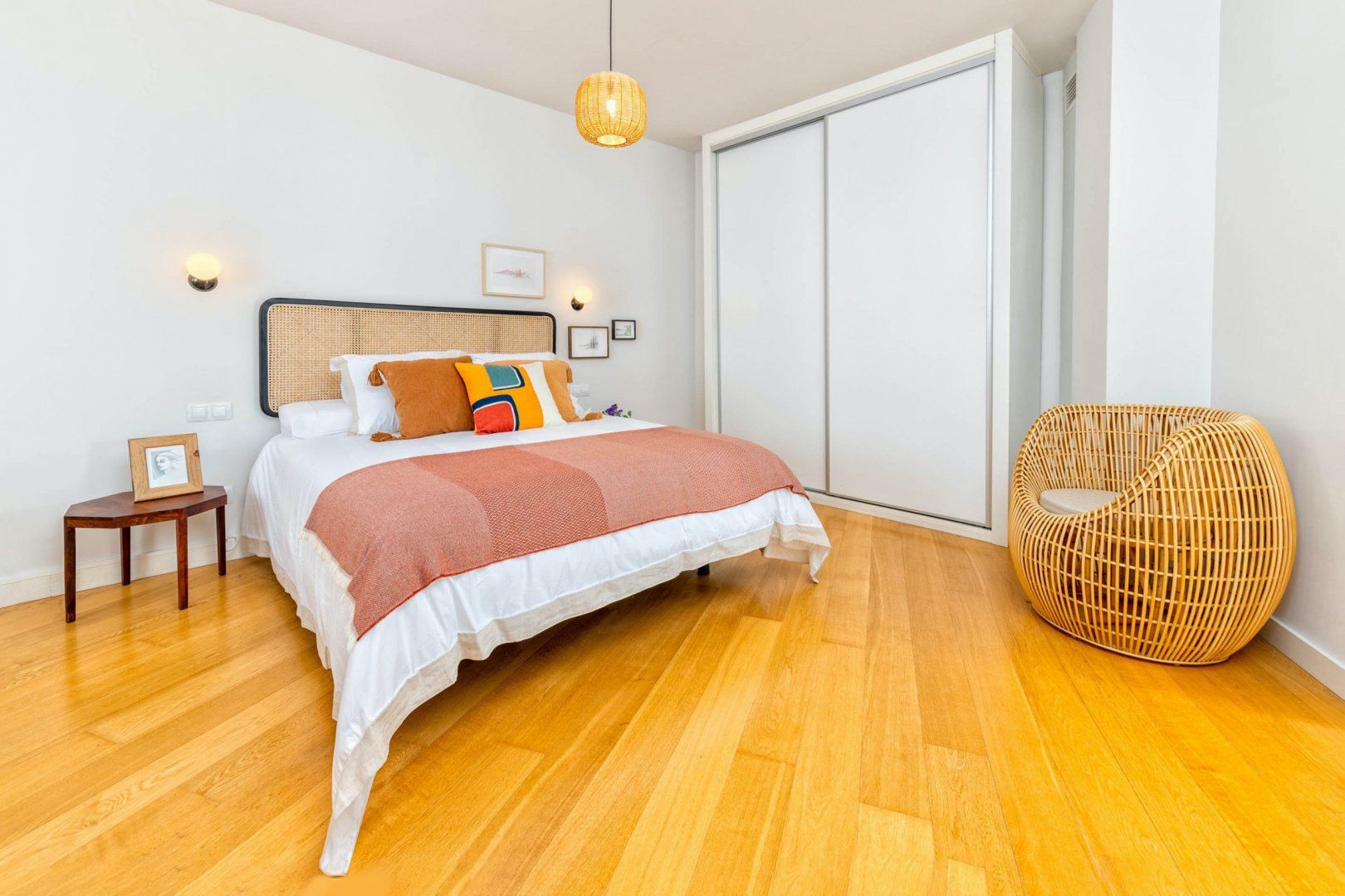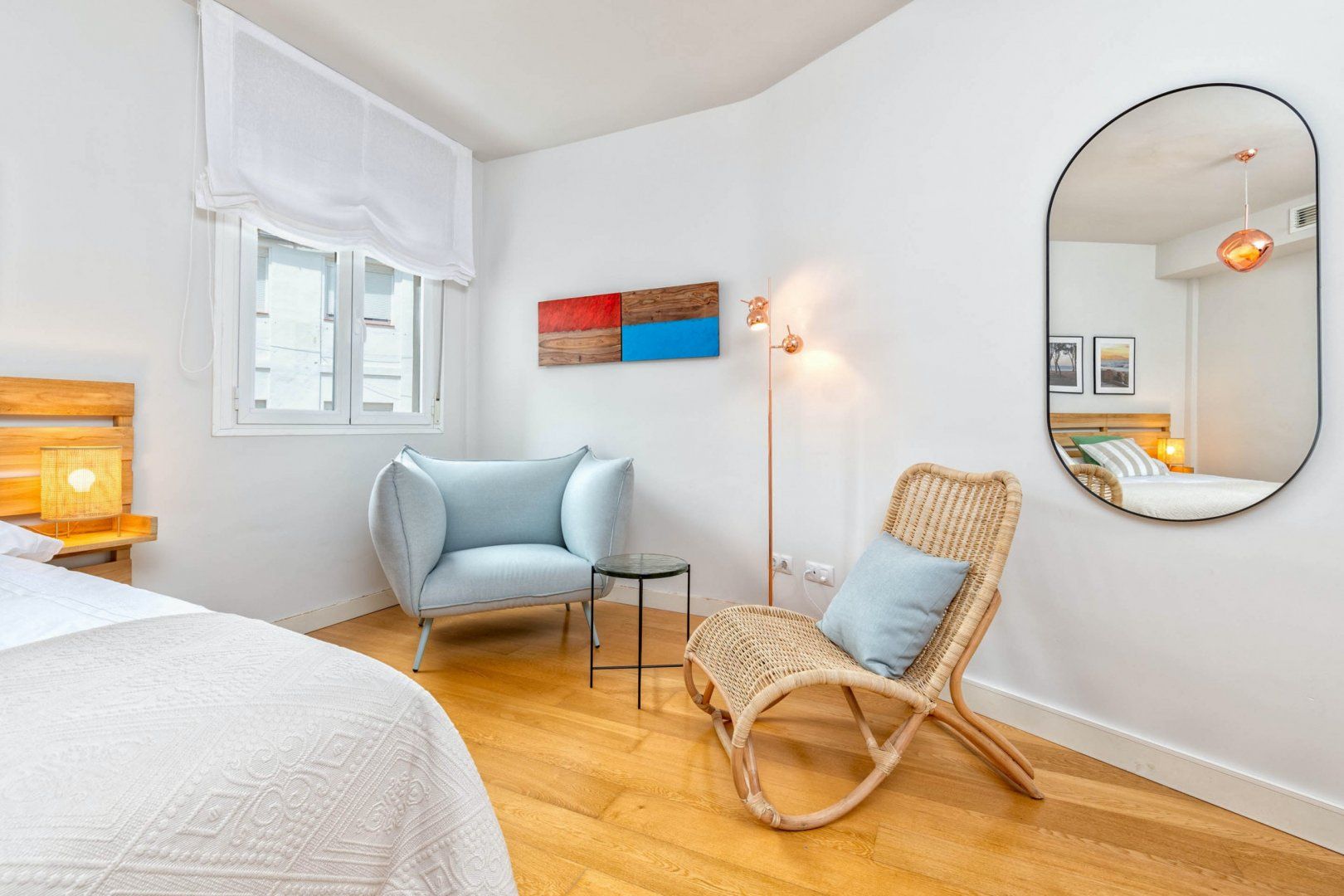 That's not to say the inside space isn't worth writing home about. Cool, contemporary and bright, the split-level abode is as comfortable as it is stylish. Wicker and rattan details bring a fresh, beachy mood, while pale grey and washed wood furniture feel inspired by Scandinavian design. On cooler evenings, stretch out on the sofa, sip sangria and watch the sun set behind neighbouring buildings.
