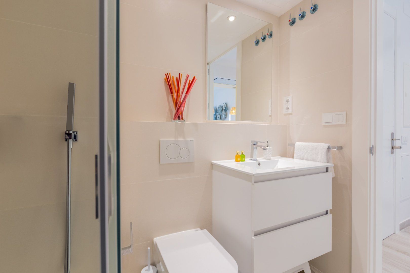 The coastal mentality of this location is effortlessly mirrored in the fresh and laid-back interior of this home – think bright open spaces, a crisp white colour palette and framed glass walls. Whether you’re preparing a quick breakfast in your sleek and dynamic kitchen, hitting send on that last email from the glass dining table, or sharing a glass of sangria on the sun-soaked balcony, this apartment has been designed to bring a sense of ease to your city stay.