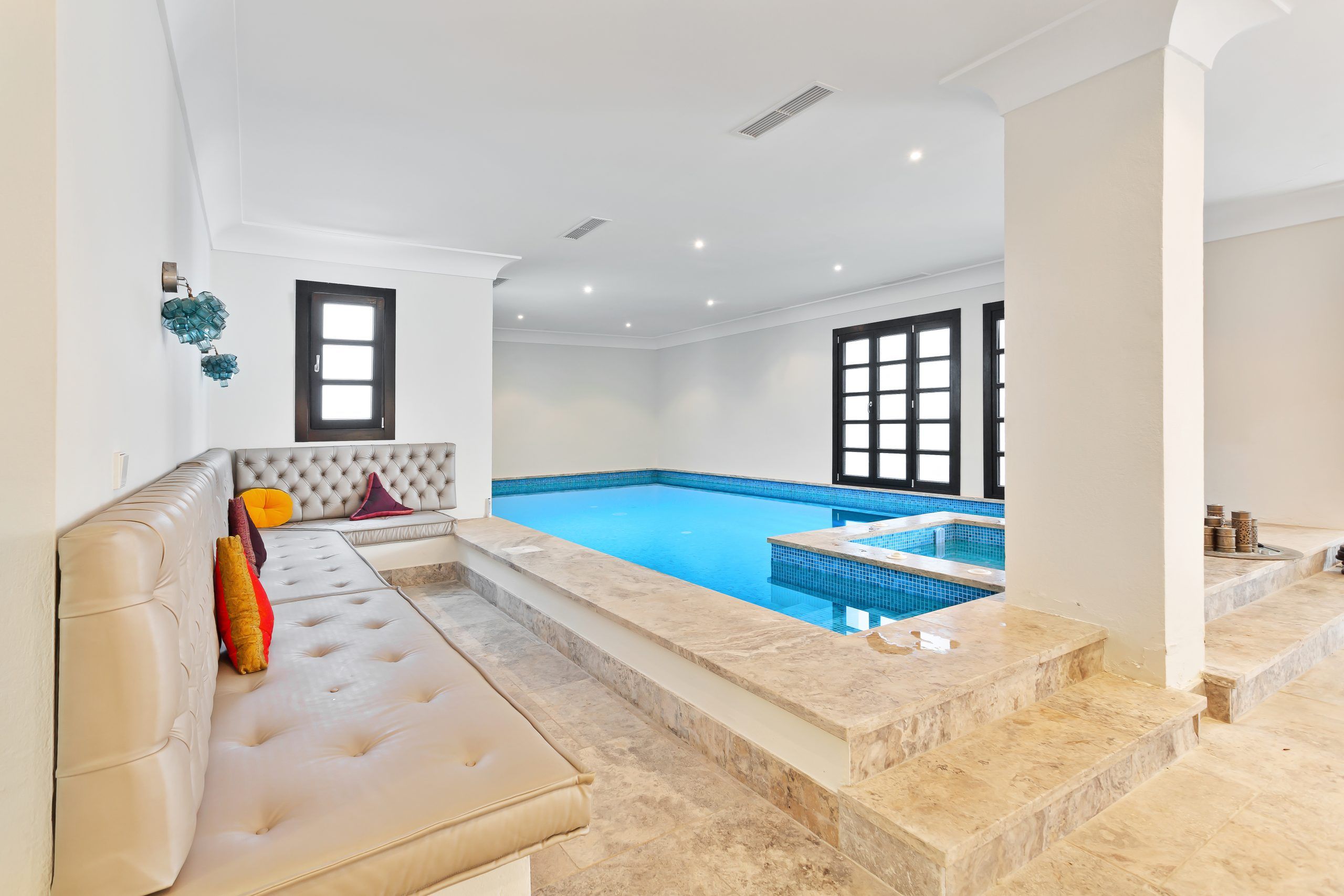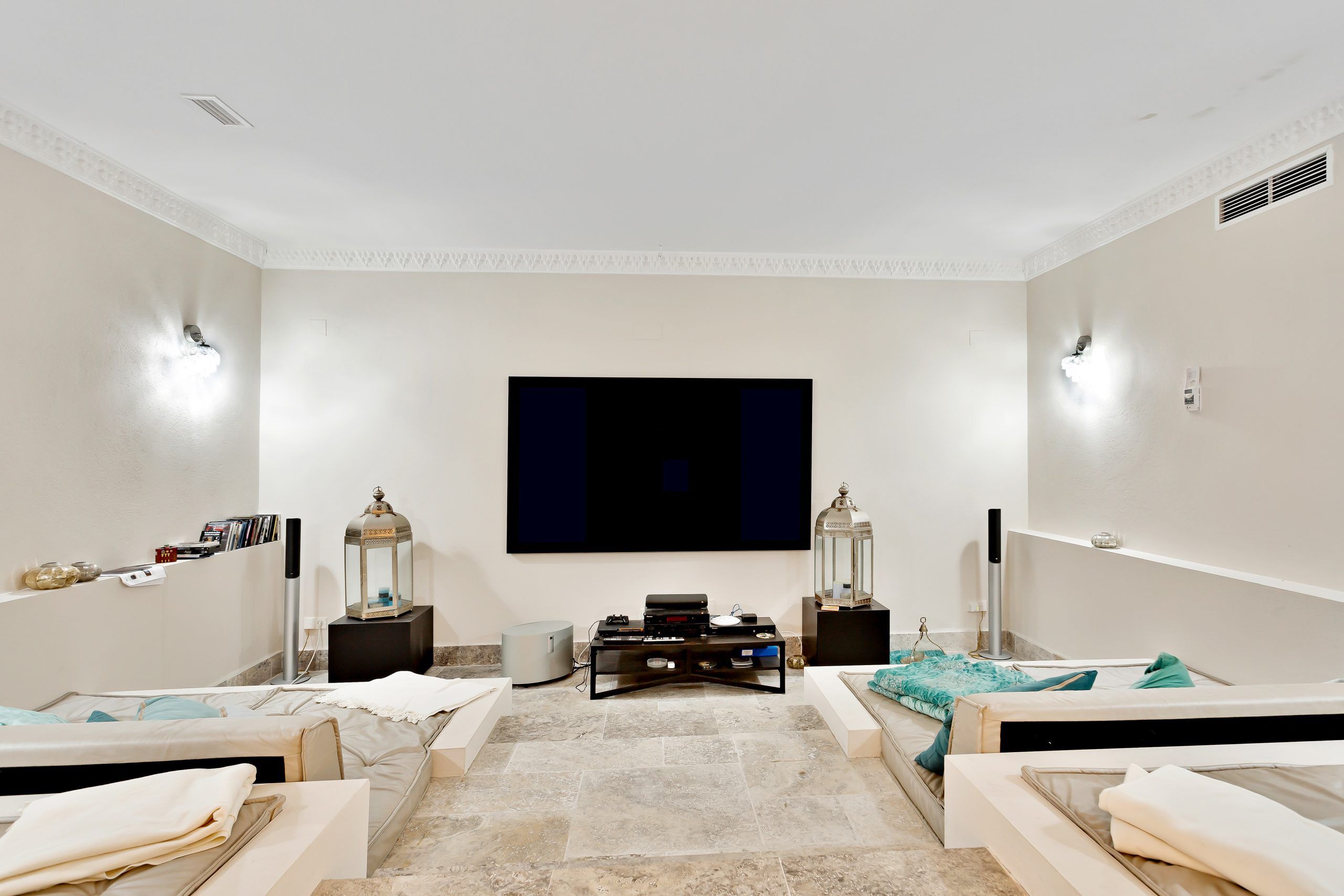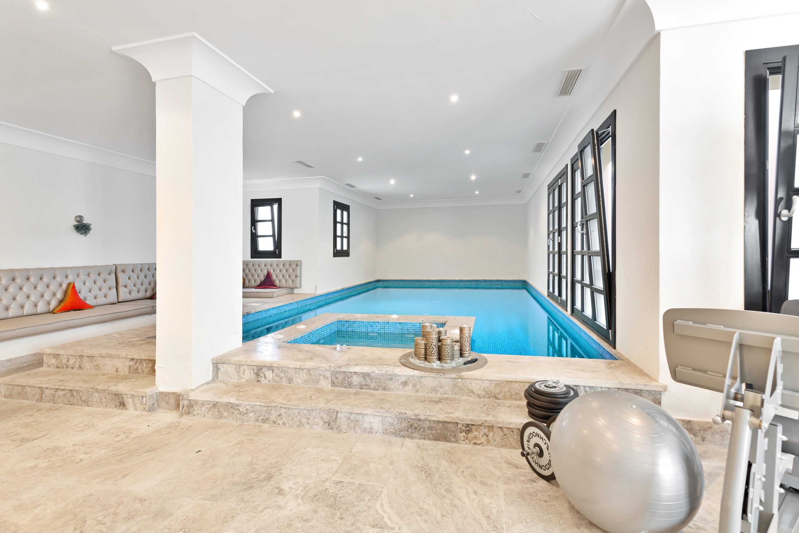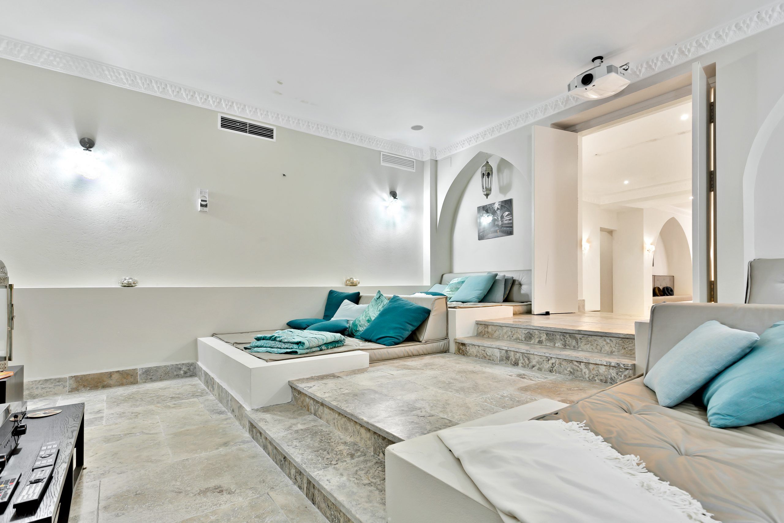 From the sea view terraces of this exclusive villa, you can see North Africa on a clear day. And in the south of Spain, clear sunny days are plentiful. It's a fifteen-minute drive to the coast for beaches and the glitzy centre of Marbella is twenty-five minutes in the car. This villa has so many luxurious touches that you might just stay put. Palm-fringed gardens are home to a lagoon-shaped infinity pool looking out over the mountains to the sea and there are myriad dining spots and terraces in the shade. While the main lounge inside is a grand affair with its upright piano and open fireplace, the highlight is the lower floor. Down here, there's a Moroccan-style cocktail bar, indoor swimming pool with a Jacuzzi, sauna and a yoga and fitness room. The casual cinema room with day beds just tops it all off.