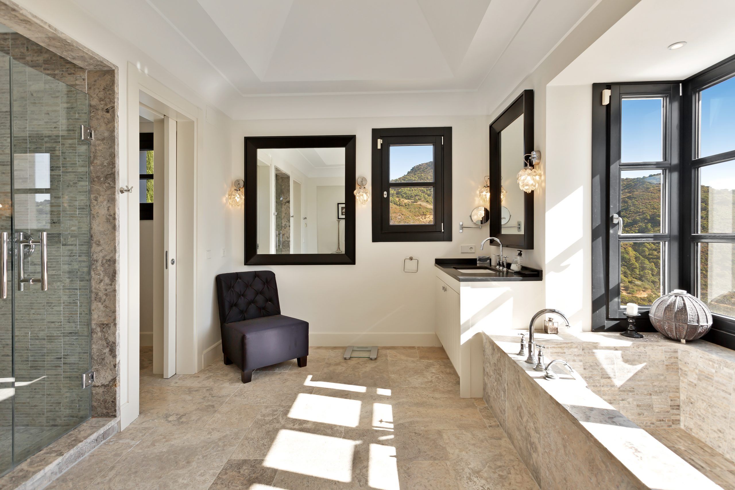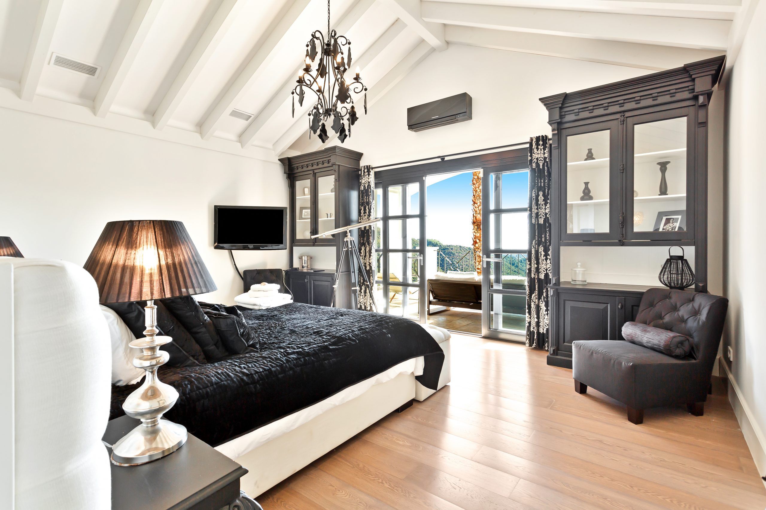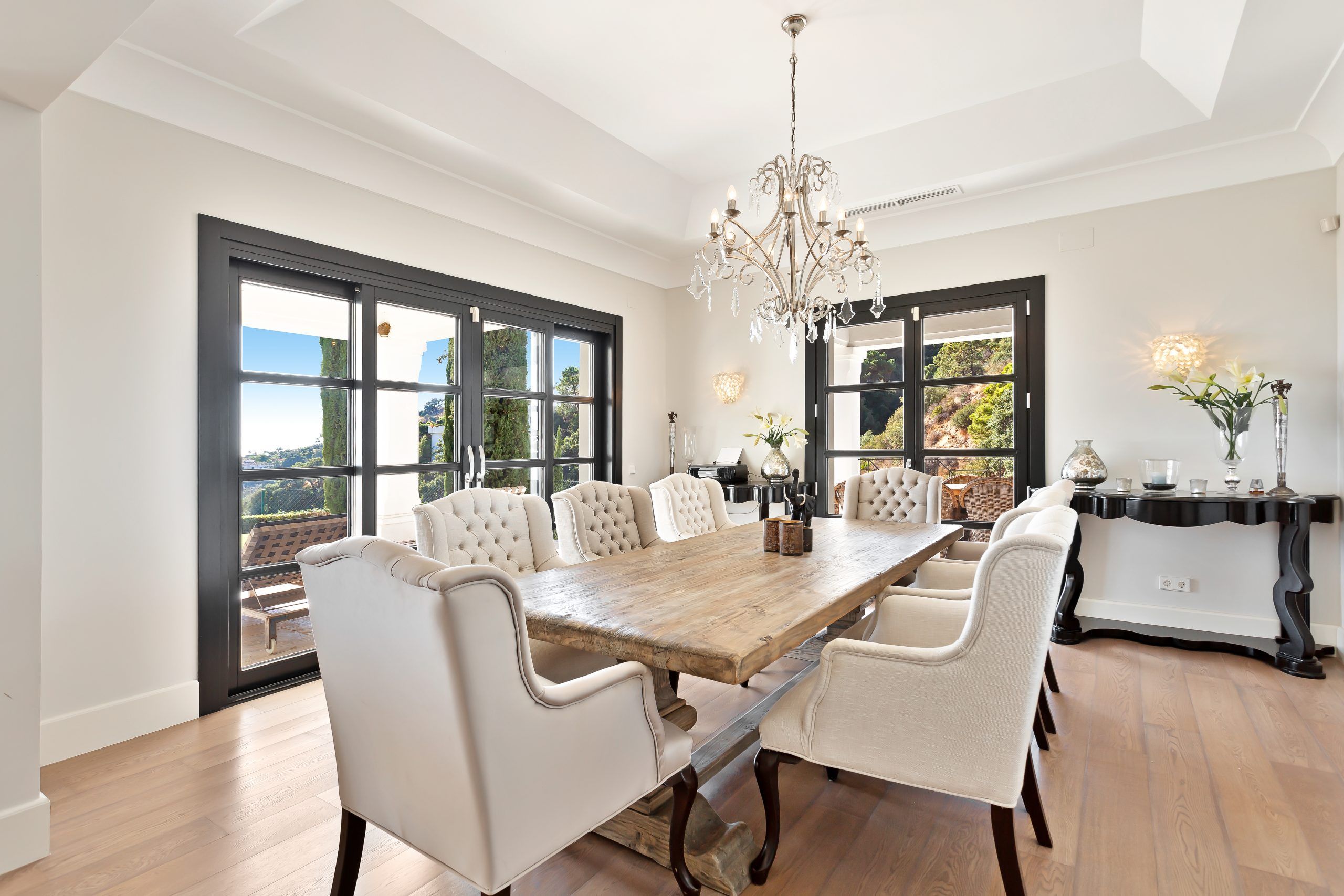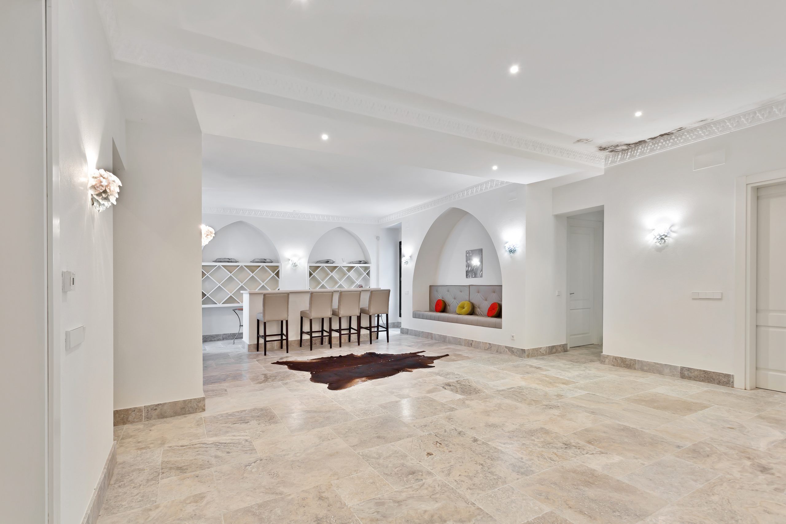 From the sea view terraces of this exclusive villa, you can see North Africa on a clear day. And in the south of Spain, clear sunny days are plentiful. It's a fifteen-minute drive to the coast for beaches and the glitzy centre of Marbella is twenty-five minutes in the car. This villa has so many luxurious touches that you might just stay put. Palm-fringed gardens are home to a lagoon-shaped infinity pool looking out over the mountains to the sea and there are myriad dining spots and terraces in the shade. While the main lounge inside is a grand affair with its upright piano and open fireplace, the highlight is the lower floor. Down here, there's a Moroccan-style cocktail bar, indoor swimming pool with a Jacuzzi, sauna and a yoga and fitness room. The casual cinema room with day beds just tops it all off.