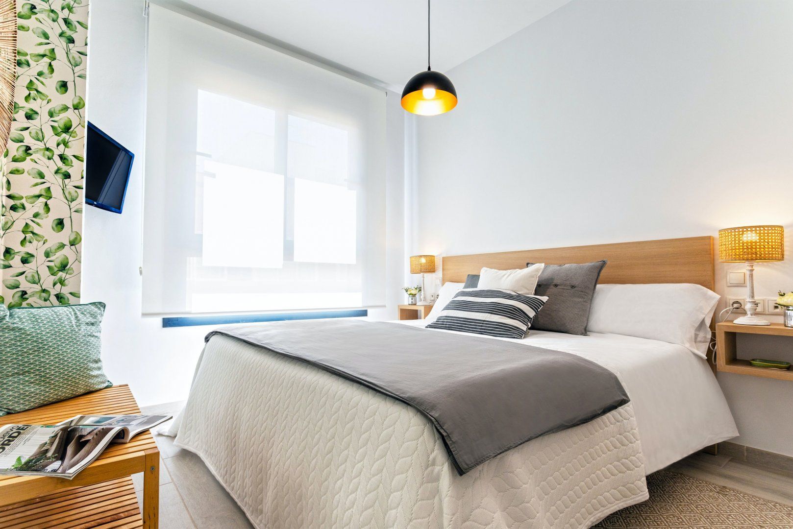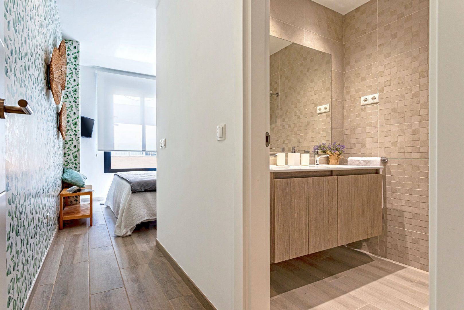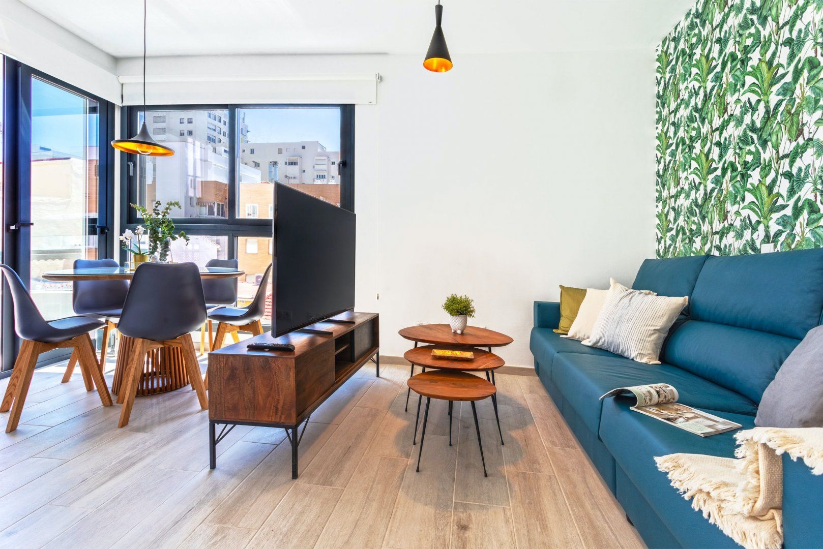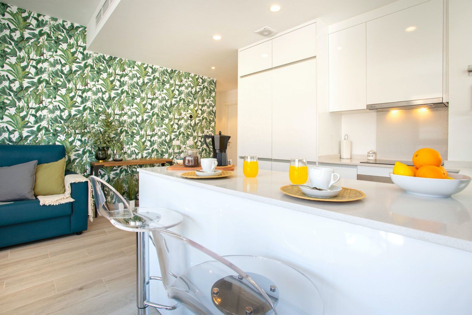 Inside, you'll find everything you need to cook up light bites in the sleek and minimalist kitchen, though we think you’ll want to make the most of Malaga’s local eateries. We suggest starting your mornings on the balcony, enjoying your morning coffee here and turning pages of your holiday read. The verdant living area, with its emerald green palm wallpaper, sets a tropical tone for you to kick back in and enjoy a glass of sangria. Head to the rooftop pool for a few laps or stretch out on the loungers with the gentle rays grazing your skin.