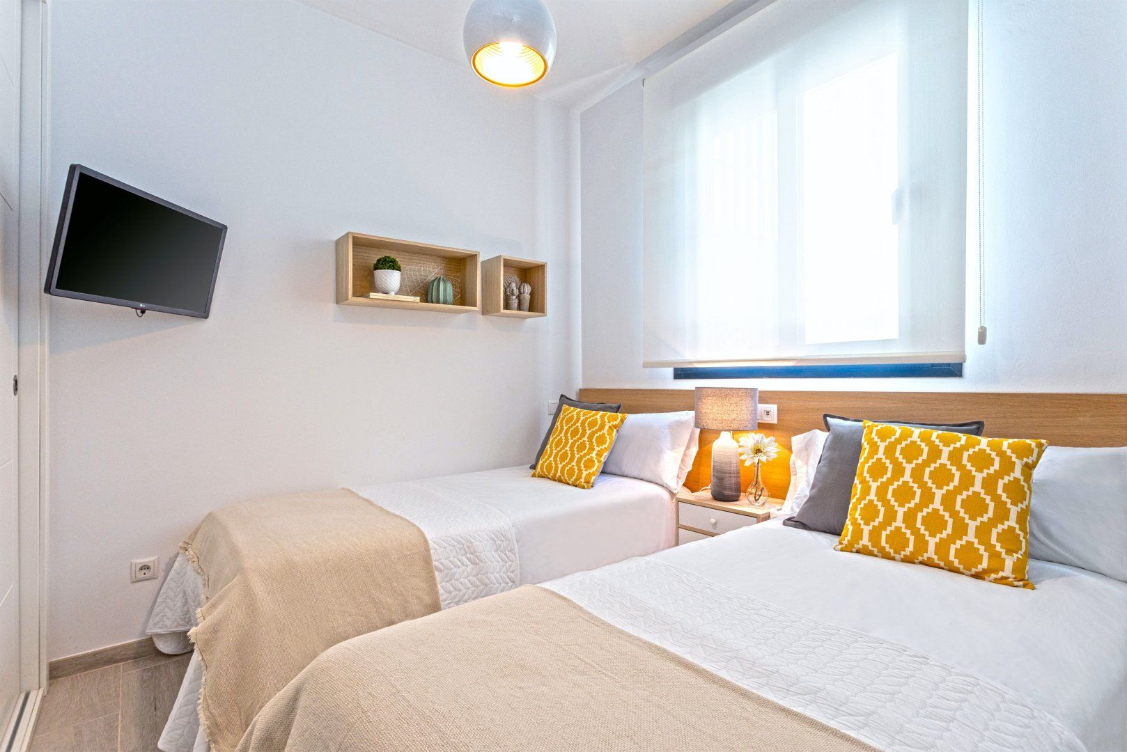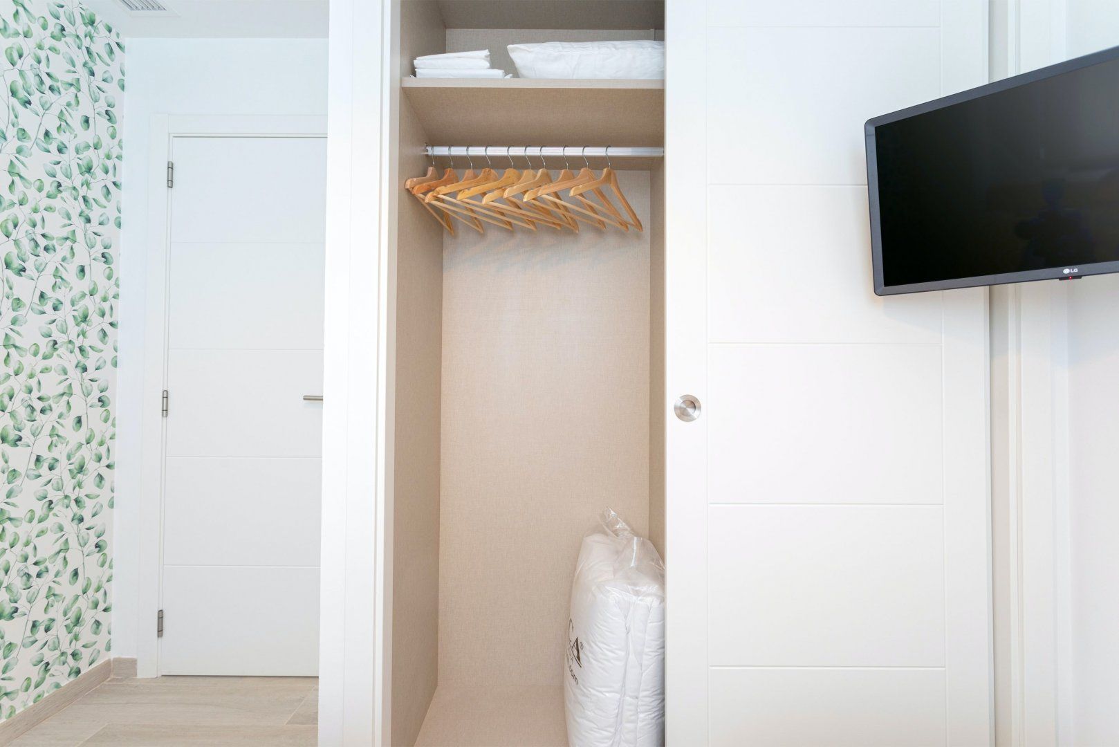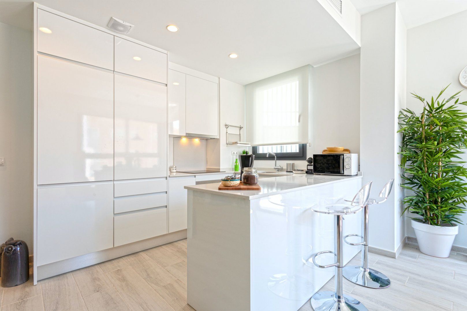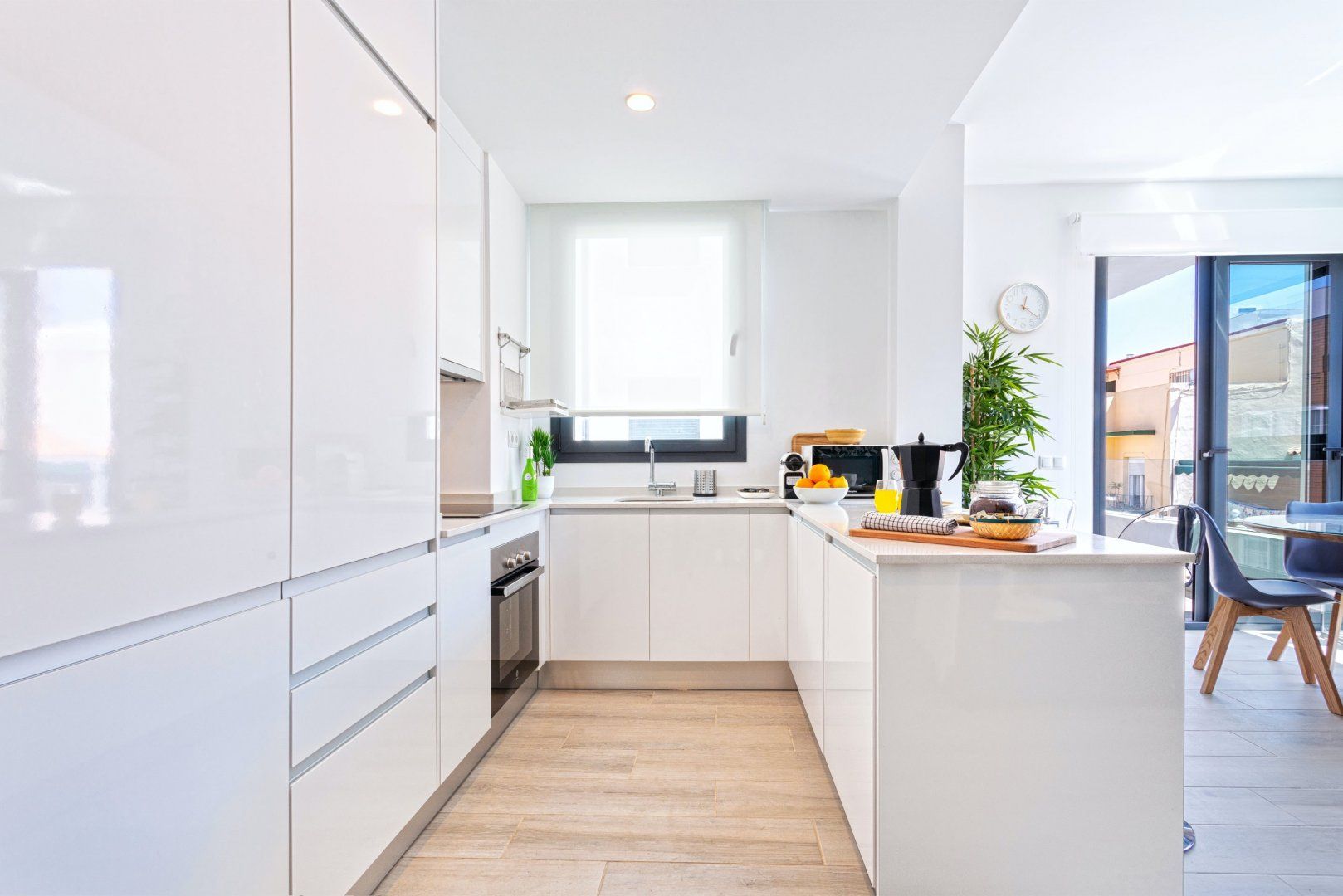 Inside, you'll find everything you need to cook up light bites in the sleek and minimalist kitchen, though we think you’ll want to make the most of Malaga’s local eateries. We suggest starting your mornings on the balcony, enjoying your morning coffee here and turning pages of your holiday read. The verdant living area, with its emerald green palm wallpaper, sets a tropical tone for you to kick back in and enjoy a glass of sangria. Head to the rooftop pool for a few laps or stretch out on the loungers with the gentle rays grazing your skin.