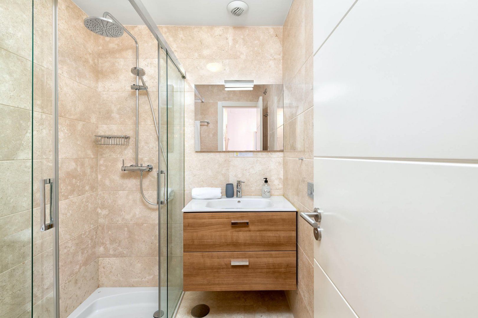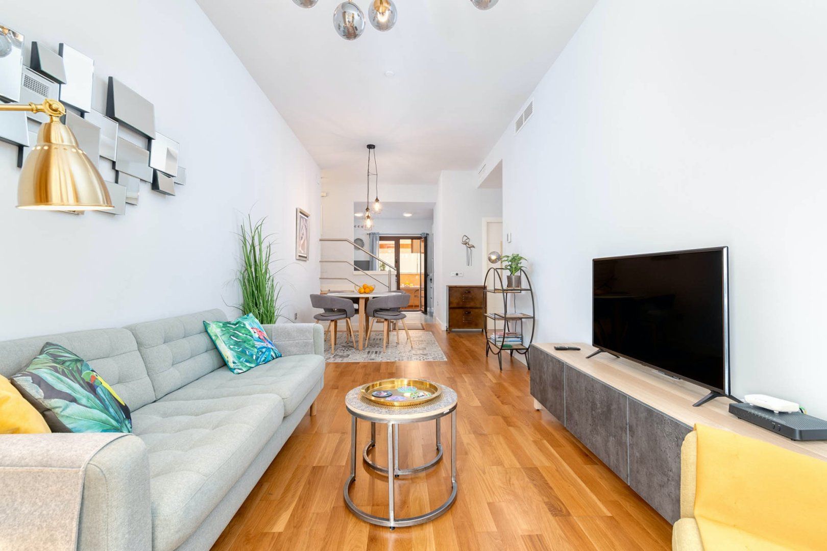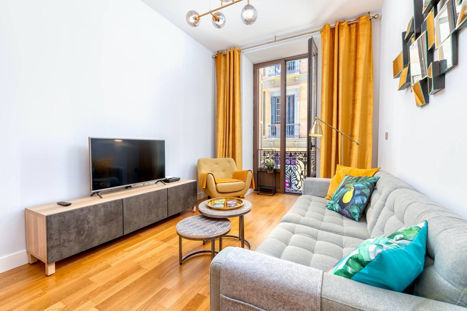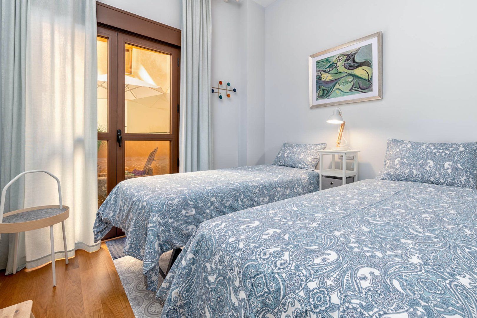 This cosy apartment adorned with vibrant yellow and stone grey furnishings awaits you for a stylish city break to Malaga. Snuggle up on the sofa with your loved ones as you watch a movie on the TV, followed by tucking into a delicious homecooked meal at the circular dining table, washed down with a glass of wine. The kitchen offers direct access to the balcony, allowing you to dine alfresco or indoors – we recommend enjoying a bite out here during the evening hours as the amber glow of the sunset shines upon the building. The master bedroom provides a charming view of the surrounding Spanish architecture as well as the local streets below.