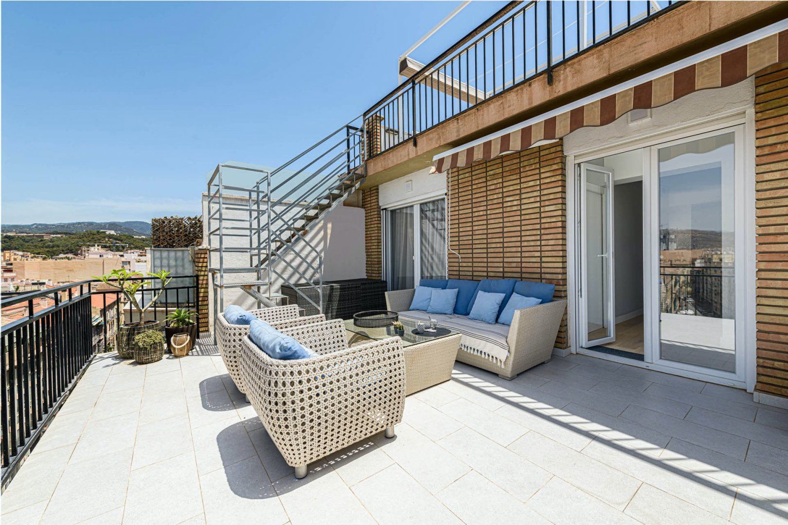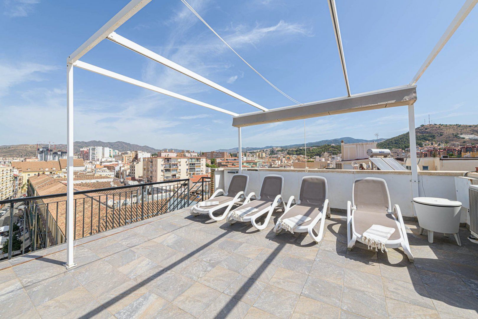 Spend warm mornings on the large terrace, tucking into breakfast at the dining table or kicking back with a coffee on the comfy rattan couch. When the temperature starts to rise, climb up to the roof terrace for a sunbathing session on the loungers.