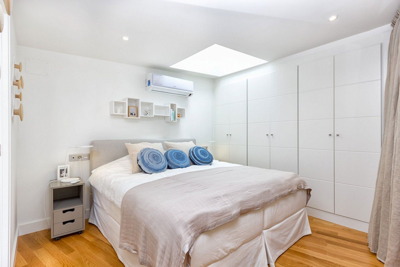 Sun worshippers, rejoice. This penthouse apartment in the heart of Malaga City has one of the best terraces we've seen. The magic of city life jumps out of this artistic home. Sparkling white walls are punctuated by loud, bright artwork, yet it retains a cosiness thanks to the plush sofa. We love the warm-toned light fixtures, the perfect mood-setter for relaxed dinners around the chic dining table.