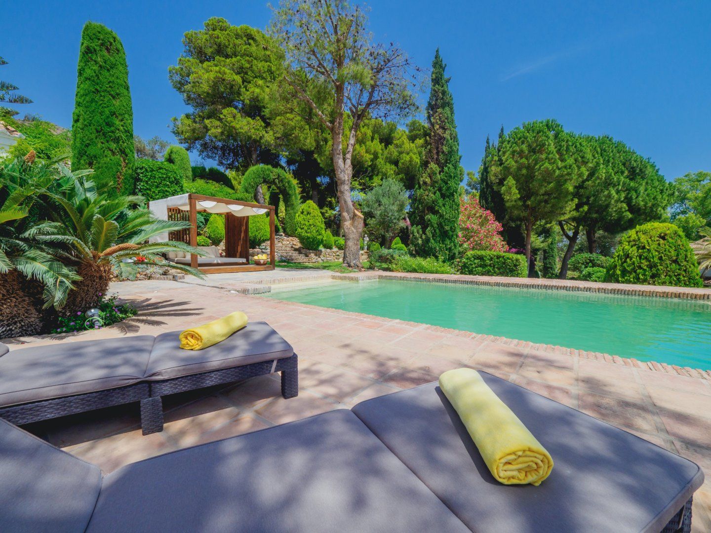 Explore the sprawling gardens, in which you will find a host of hidden seating areas where you can sit and simply soak up the magic of this unique environment. Meander around a little more and you will come to the spectacular natural-style pool. Framed by palm trees and offering a captivating vista, as well as a comfy cabana, we can't think of many places we would rather kick back, relax, and soak up the Spanish sunshine. Within these expansive grounds, there are also walkways adorned with bougainvillea which we think make the perfect backdrop for the ultimate holiday snap, as well as a wealth of water features and even a hidden Wendy house for an added sprinkling of magic.