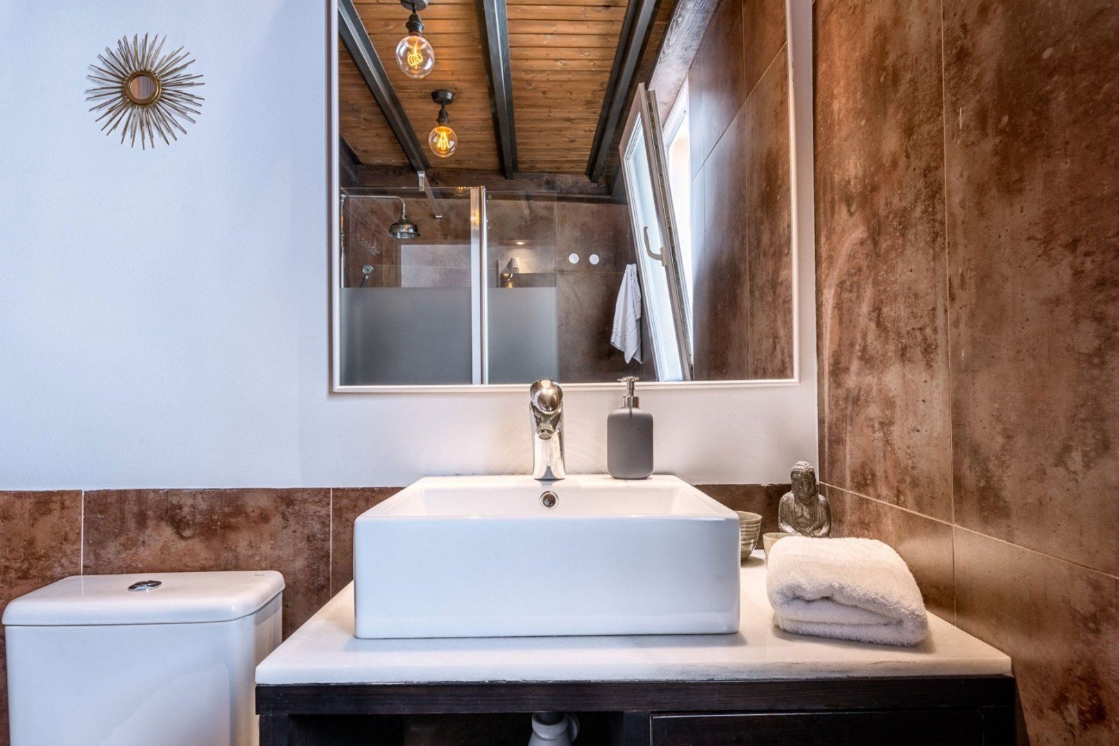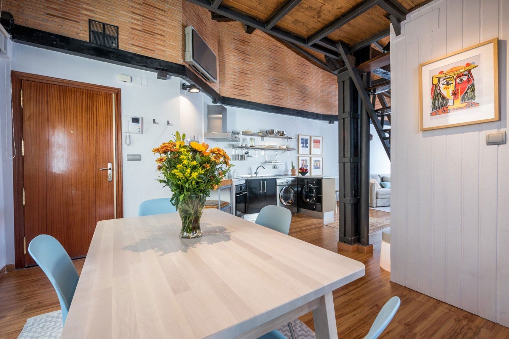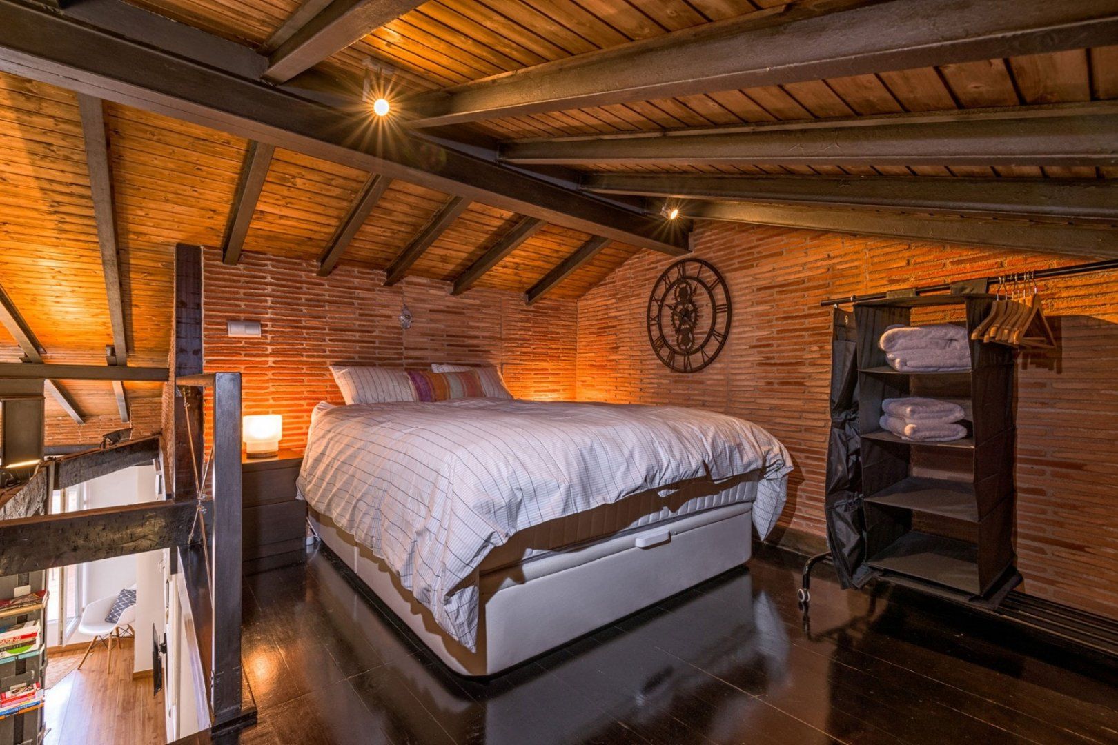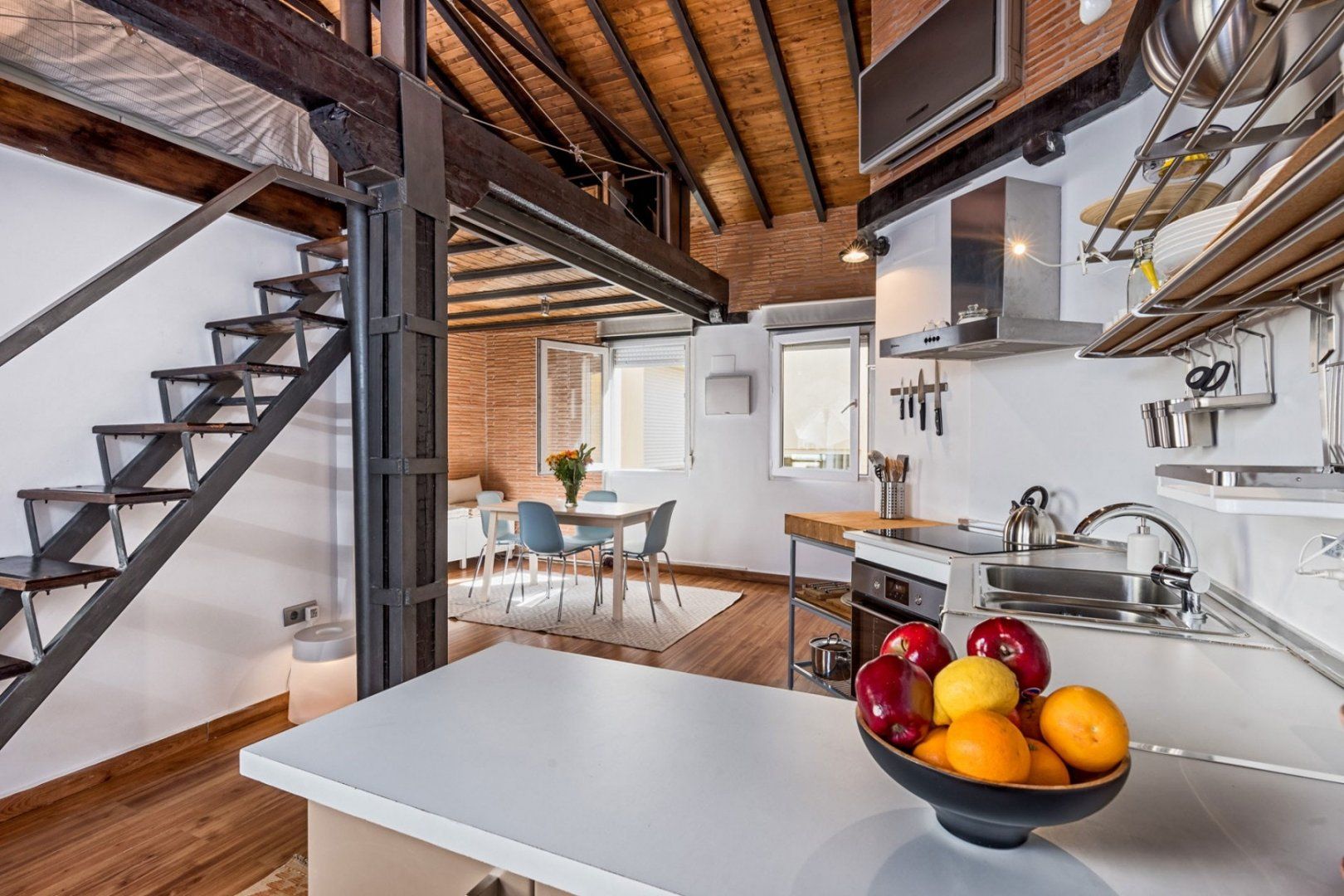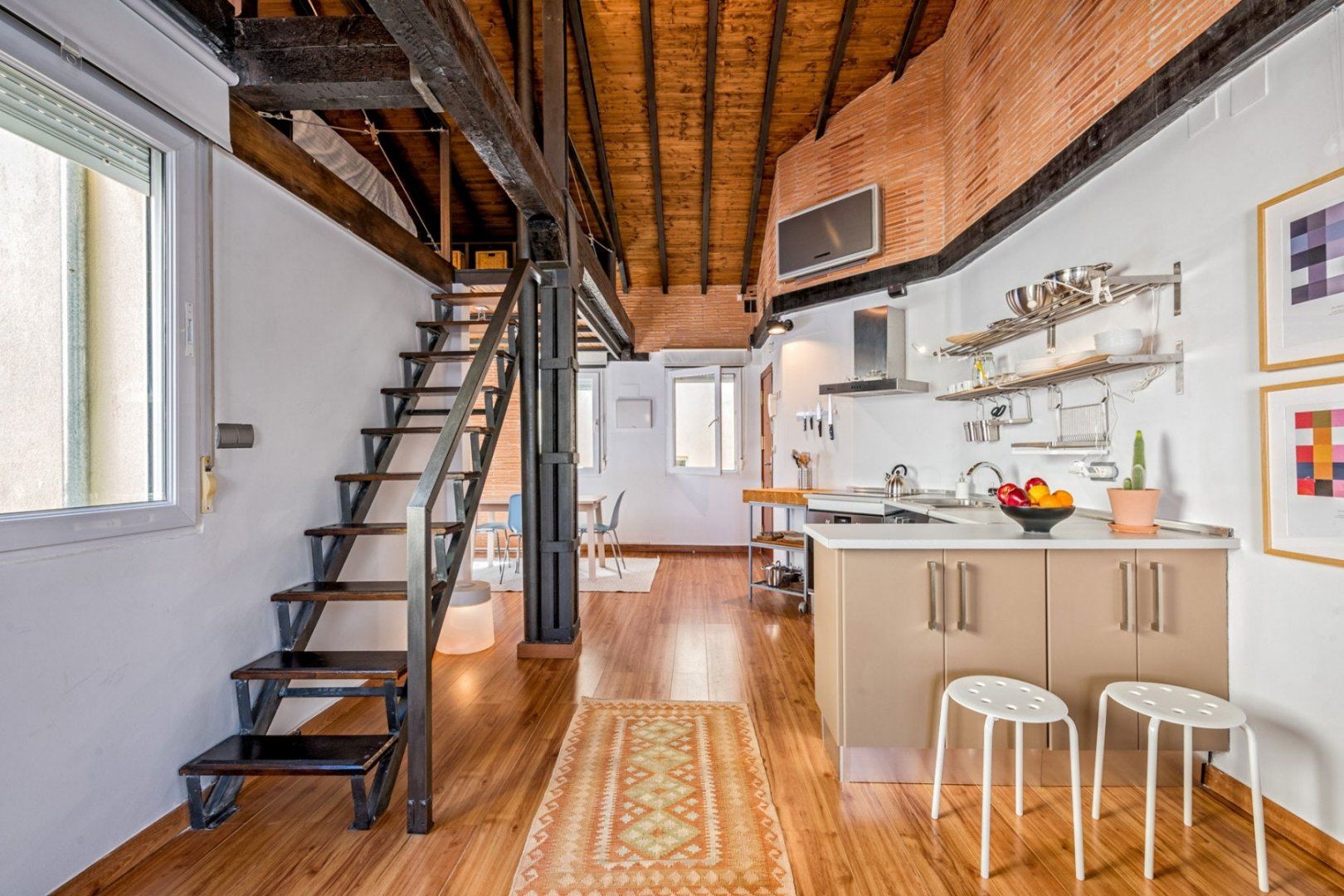 The bedroom can be found up the stairs, with an ultra-charming vibe thanks to the bedside table lamps and chestnut-coloured walls – perfect for snuggling up under the covers with a brand new book. Whether you choose to sit at the indoor dining table to tuck into a delicious meal inspired by the tastes of Spain, or you prefer to dine alfresco as you listen to the buzz of the city below, you've got the best of both worlds here.