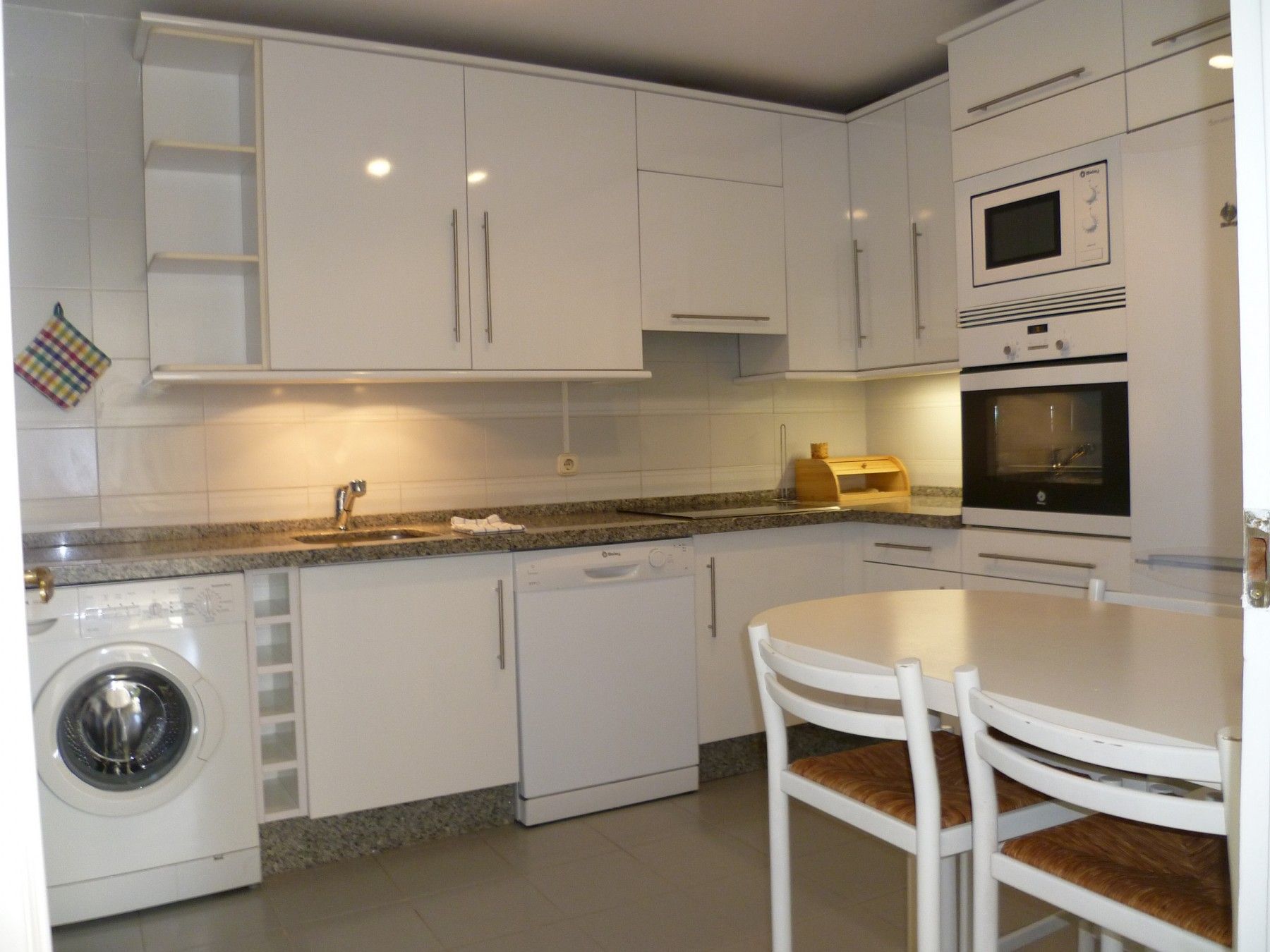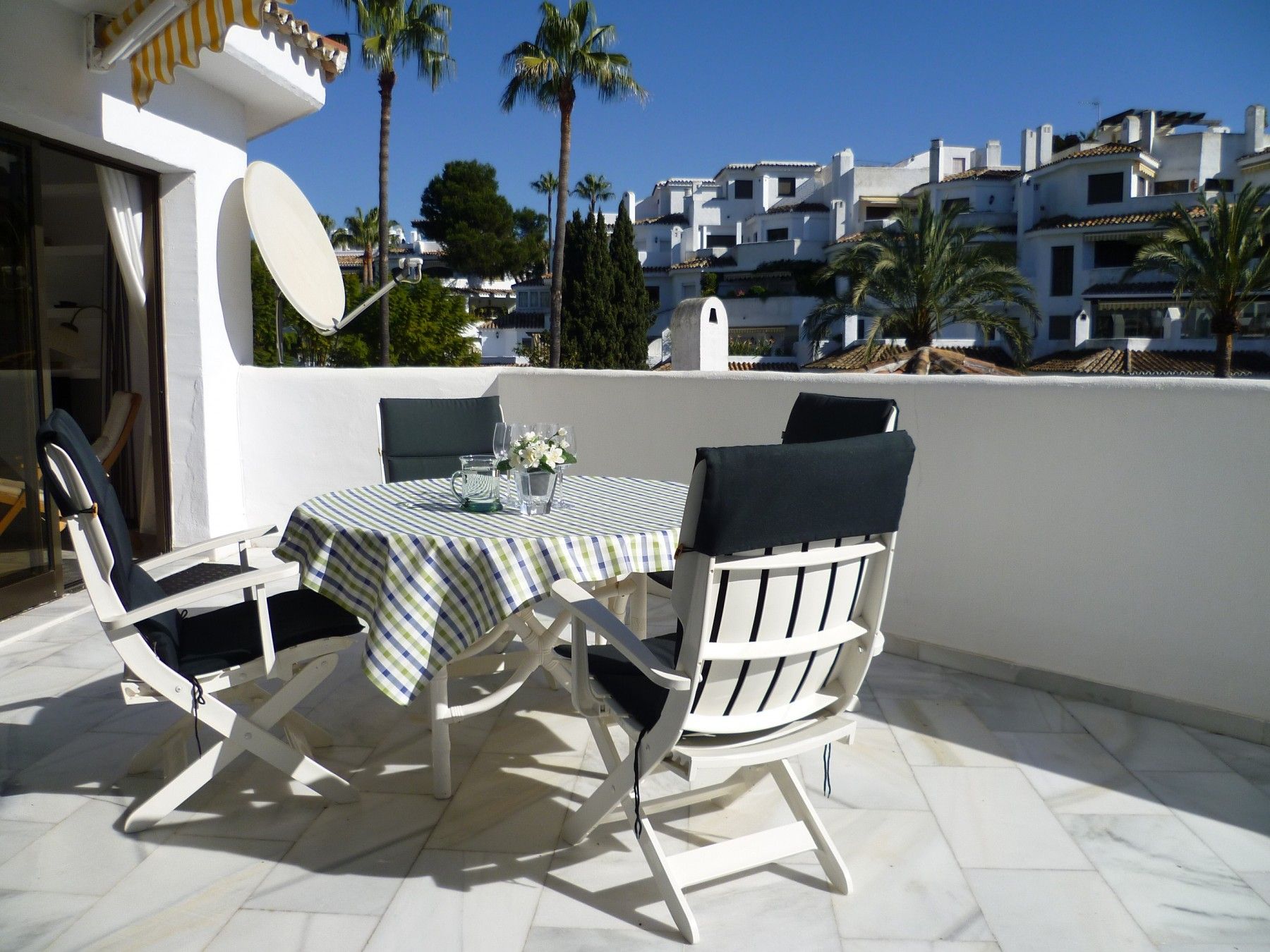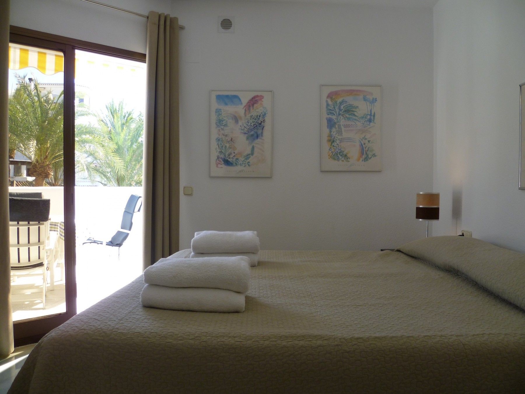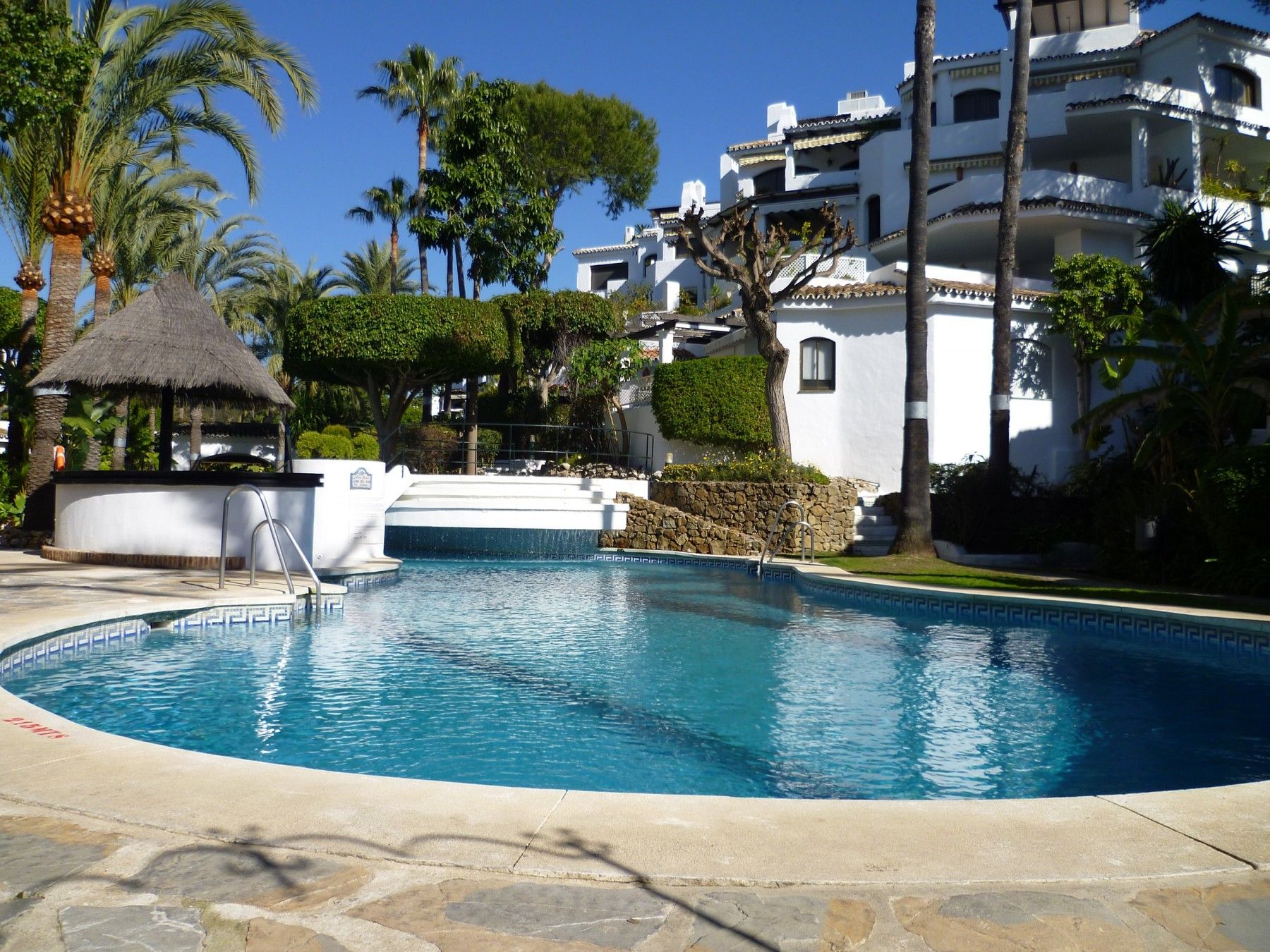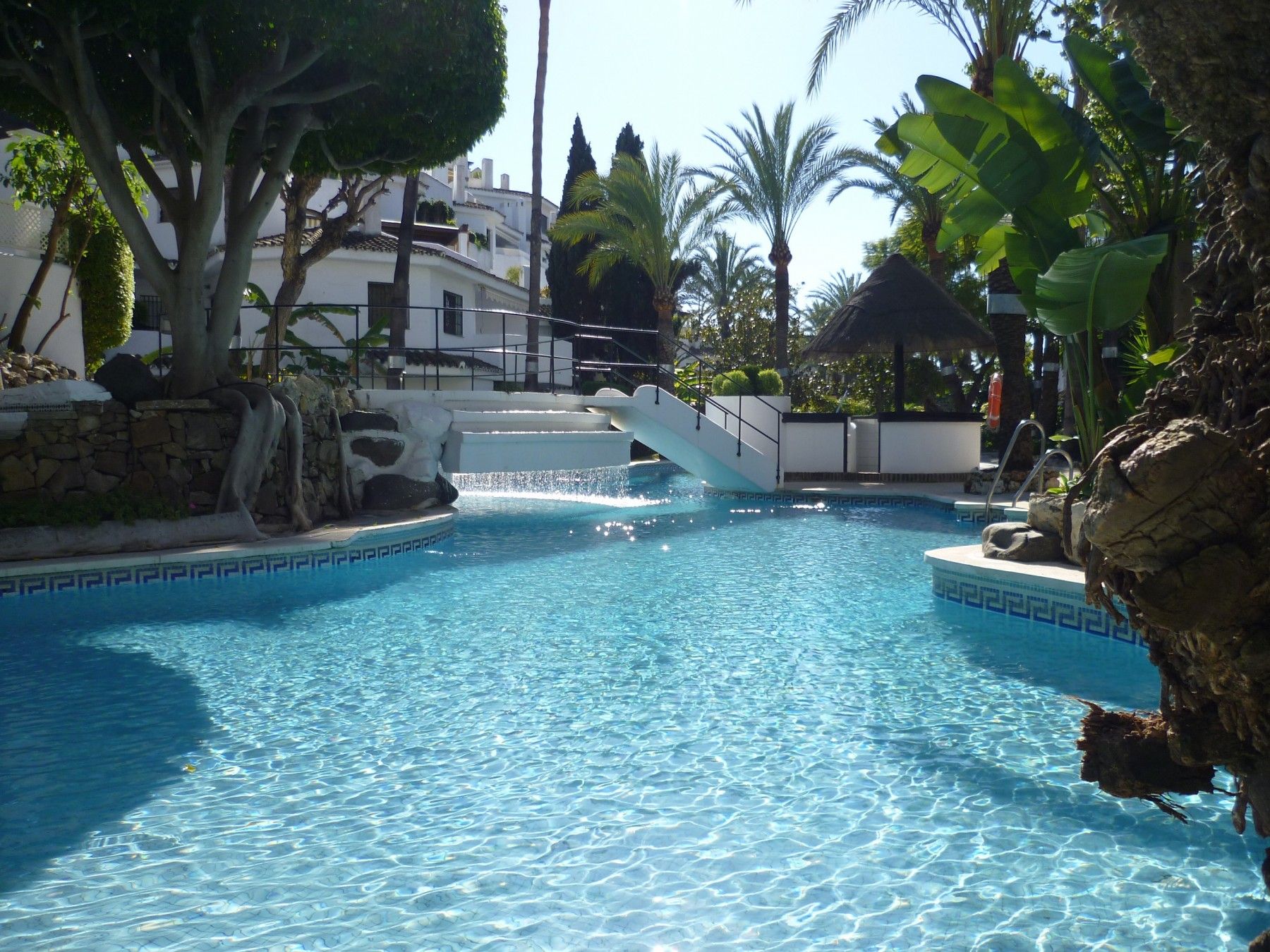If you prefer a dip in a swimming pool, there's a gorgeous shared one in this home's complex with a waterfall surrounded by lush planting and winding paths. Or relax on the apartment's private southeast-facing balcony and take in the views of the pool. There's a pretty communal garden for a stroll or let the kids enjoy the shared playground. Inside the apartment itself, there's a mix of modern and traditional. We love that the main bedroom has access to the terrace – perfect for catching those morning rays over your holiday read.